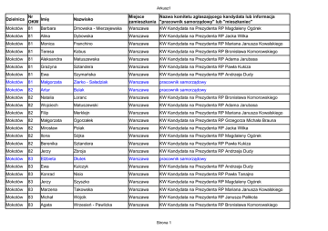 Arkusz1 Dzielnica Nr Imię OKW Nazwisko Miejsce Nazwa komitetu zgłaszającego kandydata lub informacja zamieszkania "pracownik samorządowy" lub "mieszkaniec" Mokotów 81 Barbara Dmowska - Mierzejewska Warszawa KW Kandydata na Prezydenta RP Magdaleny Ogórek Mokotów 81 Alina Dybowska Warszawa KW Kandydata na Prezydenta RP Jacka Wilka Mokotów 81 Monica Franchino Warszawa KW Kandydata na Prezydenta RP Mariana Janusza Kowalskiego Mokotów 81 Teresa Kobus Warszawa KW Kandydata na Prezydenta RP Bronisława Komorowskiego Mokotów 81 Aleksandra Matuszewska Warszawa KW Kandydata na Prezydenta RP Adama Jarubasa Mokotów 81 Grażyna Sztandera Warszawa KW Kandydata na Prezydenta RP Pawła Kukiza Mokotów 81 Ewa Szymańska Warszawa KW Kandydata na Prezydenta RP Andrzeja Dudy Mokotów 81 Małgorzata Ziarko - Saładziak Warszawa pracownik samorządowy Mokotów 82 Artur Bulak Warszawa pracownik samorządowy Mokotów 82 Natalia Loranc Warszawa KW Kandydata na Prezydenta RP Bronisława Komorowskiego Mokotów 82 Wojciech Matuszewski Warszawa KW Kandydata na Prezydenta RP Adama Jarubasa Mokotów 82 Filip Merklejn Warszawa KW Kandydata na Prezydenta RP Mariana Janusza Kowalskiego Mokotów 82 Małgorzata Ogorzałek Warszawa KW Kandydata na Prezydenta RP Grzegorza Michała Brauna Mokotów 82 Mirosław Polak Warszawa KW Kandydata na Prezydenta RP Jacka Wilka Mokotów 82 Ilona Sójka Warszawa KW Kandydata na Prezydenta RP Magdaleny Ogórek Mokotów 82 Berenika Sztandera Warszawa KW Kandydata na Prezydenta RP Pawła Kukiza Mokotów 82 Jerzy Zbroja Warszawa KW Kandydata na Prezydenta RP Andrzeja Dudy Mokotów 83 Elżbieta Dłutek Warszawa pracownik samorządowy Mokotów 83 Ewa Kulczyk Warszawa KW Kandydata na Prezydenta RP Andrzeja Dudy Mokotów 83 Konrad Nisio Warszawa KW Kandydata na Prezydenta RP Pawła Tanajno Mokotów 83 Jerzy Szyszko Warszawa KW Kandydata na Prezydenta RP Magdaleny Ogórek Mokotów 83 Marzena Takowska Warszawa KW Kandydata na Prezydenta RP Mariana Janusza Kowalskiego Mokotów 83 Michał Wójcik Warszawa KW Kandydata na Prezydenta RP Janusza Palikota Mokotów 83 Agata Wrzesień - Pawlicka Warszawa KW Kandydata na Prezydenta RP Bronisława Komorowskiego Strona 1 Arkusz1 Mokotów 83 Norbert Żamojda Warszawa KW Kandydata na Prezydenta RP Adama Jarubasa Mokotów 84 Janina Brylińska Warszawa KW Kandydata na Prezydenta RP Andrzeja Dudy Mokotów 84 Izabela Kujawa Warszawa KW Kandydata na Prezydenta RP Mariana Janusza Kowalskiego Mokotów 84 Milena Kurkowska Warszawa KW Kandydata na Prezydenta RP Adama Jarubasa Mokotów 84 Ksenia Łozowska Warszawa KW Kandydata na Prezydenta RP Magdaleny Ogórek Mokotów 84 Piotr Wójcik Warszawa KW Kandydata na Prezydenta RP Bronisława Komorowskiego Mokotów 84 Małgorzata Zubrzycka Warszawa pracownik samorządowy Mokotów 84 Katarzyna Zubrzycka Warszawa mieszkaniec Mokotów 85 Łukasz Geras Warszawa KW Kandydata na Prezydenta RP Jacka Wilka Mokotów 85 Andrzej Gmiter Warszawa KW Kandydata na Prezydenta RP Andrzeja Dudy Mokotów 85 Jakub Jeżewski Warszawa KW Kandydata na Prezydenta RP Bronisława Komorowskiego Mokotów 85 Beata Obłuska Warszawa pracownik samorządowy Mokotów 85 Hanna Szpak Warszawa KW Kandydata na Prezydenta RP Magdaleny Ogórek Mokotów 85 Andrzej Żamojda Warszawa KW Kandydata na Prezydenta RP Adama Jarubasa Mokotów 85 Adam Żychliński Warszawa KW Kandydata na Prezydenta RP Mariana Janusza Kowalskiego Mokotów 86 Danuta Athanasiou Warszawa KW Kandydata na Prezydenta RP Adama Jarubasa Mokotów 86 Ada Gromek Warszawa KW Kandydata na Prezydenta RP Bronisława Komorowskiego Mokotów 86 Jadwiga Gron Warszawa pracownik samorządowy Mokotów 86 Agnieszka Krawczyk Warszawa KW Kandydata na Prezydenta RP Jacka Wilka Mokotów 86 Magdalena Małolepsza Warszawa mieszkaniec Mokotów 86 Grażyna Niewiatkowska Warszawa KW Kandydata na Prezydenta RP Andrzeja Dudy Mokotów 86 Marek Szpak Warszawa KW Kandydata na Prezydenta RP Magdaleny Ogórek Mokotów 87 Dariusz Cholewiński Warszawa KW Kandydata na Prezydenta RP Adama Jarubasa Mokotów 87 Grażyna Grabiec Warszawa KW Kandydata na Prezydenta RP Jacka Wilka Mokotów 87 Anna Gralec Warszawa KW Kandydata na Prezydenta RP Andrzeja Dudy Mokotów 87 Krzysztof Kołodziejczyk Warszawa KW Kandydata na Prezydenta RP Bronisława Komorowskiego Strona 2 Arkusz1 Mokotów 87 Klaudia Kruk Warszawa mieszkaniec Mokotów 87 Joanna Maciejewska Warszawa pracownik samorządowy Mokotów 87 Roman Rolf Warszawa KW Kandydata na Prezydenta RP Magdaleny Ogórek Mokotów 88 Inez Dana Warszawa KW Kandydata na Prezydenta RP Pawła Kukiza Mokotów 88 Piotr Jesiotr Warszawa KW Kandydata na Prezydenta RP Magdaleny Ogórek Mokotów 88 Monika Komorowska Warszawa KW Kandydata na Prezydenta RP Jacka Wilka Mokotów 88 Tomasz Kot Warszawa pracownik samorządowy Mokotów 88 Mateusz Olech Warszawa KW Kandydata na Prezydenta RP Bronisława Komorowskiego Mokotów 88 Wiesław Smagowicz Warszawa KW Kandydata na Prezydenta RP Andrzeja Dudy Mokotów 88 Bogusława Sotomska Warszawa KW Kandydata na Prezydenta RP Adama Jarubasa Mokotów 89 Wojciech Ćwikiewicz Warszawa KW Kandydata na Prezydenta RP Jacka Wilka Mokotów 89 Ewelina Frąckiewicz Warszawa KW Kandydata na Prezydenta RP Adama Jarubasa Mokotów 89 Leszek Guz Warszawa KW Kandydata na Prezydenta RP Andrzeja Dudy Mokotów 89 Adrian Jabłoński Warszawa KW Kandydata na Prezydenta RP Pawła Kukiza Mokotów 89 Magdalena Krzywicka Warszawa pracownik samorządowy Mokotów 89 Karol Leśniewski Warszawa KW Kandydata na Prezydenta RP Bronisława Komorowskiego Mokotów 89 Sara Staniszek - Bucińska Warszawa KW Kandydata na Prezydenta RP Magdaleny Ogórek Mokotów 90 Patryk Dróżdż Warszawa KW Kandydata na Prezydenta RP Pawła Kukiza Mokotów 90 Jan Fidura Warszawa KW Kandydata na Prezydenta RP Magdaleny Ogórek Mokotów 90 Karol Kosiński Warszawa KW Kandydata na Prezydenta RP Adama Jarubasa Mokotów 90 Józef Kustra Warszawa KW Kandydata na Prezydenta RP Janusza Korwin-Mikke Mokotów 90 Wojciech Olsze