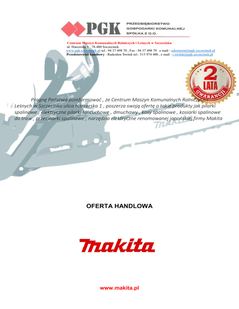 Centrum Maszyn Komunalnych Rolniczych i Leśnych w Szczecinku ul. Harcerska 1 78-400 Szczecinek www.pgk.szczecinek.pl tel : 94 37 498 70 , Fax : 94 37 498 79 e mail : [email protected] Przedstawiciel handlowy : Radosław Świtek tel.: 513 974 400 , e mail : [email protected] Pragnę Państwa poinformować , że Centrum Maszyn Komunalnych Rolniczych i Leśnych w Szczecinku ulica Harcerska 1 , poszerza swoją ofertę o takie produkty jak pilarki spalinowe , elektryczne pilarki łańcuchowe , dmuchawy , kosy spalinowe , kosiarki spalinowe do traw , przecinarki spalinowe , narzędzia elektryczne renomowanej japońskiej firmy Makita . OFERTA HANDLOWA www.makita.pl EA6100P45E DCS6401-45 EA7900P60E-PM EA7300P50E EY2650H25H EM4350UH DCS4630-38 EK8100 BBX7600 UC4051A UR3000 EH5000W UD2500 ELM4613