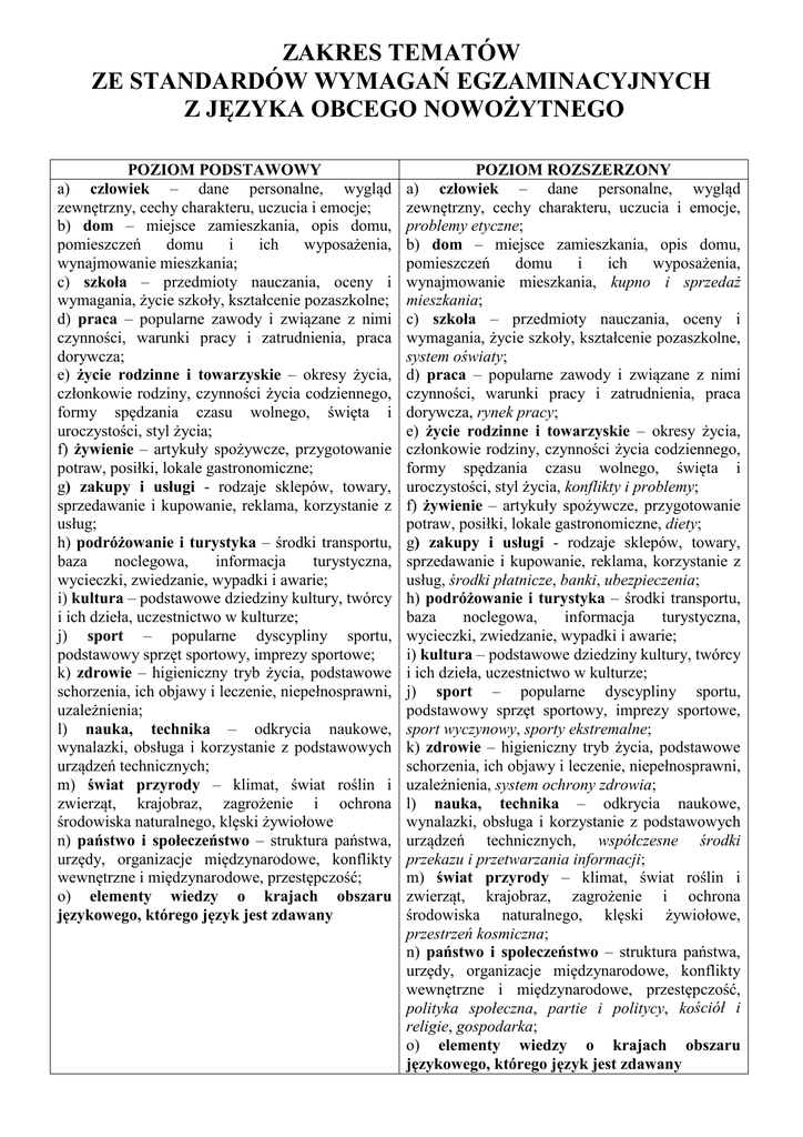 ZAKRES TEMATÓW ZE STANDARDÓW WYMAGAŃ EGZAMINACYJNYCH Z JĘZYKA OBCEGO NOWOŻYTNEGO POZIOM PODSTAWOWY a) człowiek – dane personalne, wygląd zewnętrzny, cechy charakteru, uczucia i emocje; b) dom – miejsce zamieszkania, opis domu, pomieszczeń domu i ich wyposażenia, wynajmowanie mieszkania; c) szkoła – przedmioty nauczania, oceny i wymagania, życie szkoły, kształcenie pozaszkolne; d) praca – popularne zawody i związane z nimi czynności, warunki pracy i zatrudnienia, praca dorywcza; e) życie rodzinne i towarzyskie – okresy życia, członkowie rodziny, czynności życia codziennego, formy spędzania czasu wolnego, święta i uroczystości, styl życia; f) żywienie – artykuły spożywcze, przygotowanie potraw, posiłki, lokale gastronomiczne; g) zakupy i usługi - rodzaje sklepów, towary, sprzedawanie i kupowanie, reklama, korzystanie z usług; h) podróżowanie i turystyka – środki transportu, baza noclegowa, informacja turystyczna, wycieczki, zwiedzanie, wypadki i awarie; i) kultura – podstawowe dziedziny kultury, twórcy i ich dzieła, uczestnictwo w kulturze; j) sport – popularne dyscypliny sportu, podstawowy sprzęt sportowy, imprezy sportowe; k) zdrowie – higieniczny tryb życia, podstawowe schorzenia, ich objawy i leczenie, niepełnosprawni, uzależnienia; l) nauka, technika – odkrycia naukowe, wynalazki, obsługa i korzystanie z podstawowych urządzeń technicznych; m) świat przyrody – klimat, świat roślin i zwierząt, krajobraz, zagrożenie i ochrona środowiska naturalnego, klęski żywiołowe n) państwo i społeczeństwo – struktura państwa, urzędy, organizacje międzynarodowe, konflikty wewnętrzne i międzynarodowe, przestępczość; o) elementy wiedzy o krajach obszaru językowego, którego język jest zdawany POZIOM ROZSZERZONY a) człowiek – dane personalne, wygląd zewnętrzny, cechy charakteru, uczucia i emocje, problemy etyczne; b) dom – miejsce zamieszkania, opis domu, pomieszczeń domu i ich wyposażenia, wynajmowanie mieszkania, kupno i sprzedaż mieszkania; c) szkoła – przedmioty nauczania, oceny i wymagania, życie szkoły, kształcenie pozaszkolne, system oświaty; d) praca – popularne zawody i związane z nimi czynności, warunki pracy i zatrudnienia, praca dorywcza, rynek pracy; e) życie rodzinne i towarzyskie – okresy życia, członkowie rodziny, czynności życia codziennego, formy spędzania czasu wolnego, święta i uroczystości, styl życia, konflikty i problemy; f) żywienie – artykuły spożywcze, przygotowanie potraw, posiłki, lokale gastronomiczne, diety; g) zakupy i usługi - rodzaje sklepów, towary, sprzedawanie i kupowanie, reklama, korzystanie z usług, środki płatnicze, banki, ubezpieczenia; h) podróżowanie i turystyka – środki transportu, baza noclegowa, informacja turystyczna, wycieczki, zwiedzanie, wypadki i awarie; i) kultura – podstawowe dziedziny kultury, twórcy i ich dzieła, uczestnictwo w kulturze; j) sport – popularne dyscypliny sportu, podstawowy sprzęt sportowy, imprezy sportowe, sport wyczynowy, sporty ekstremalne; k) zdrowie – higieniczny tryb życia, podstawowe schorzenia, ich objawy i leczenie, niepełnosprawni, uzależnienia, system ochrony zdrowia; l) nauka, technika – odkrycia naukowe, wynalazki, obsługa i korzystanie z podstawowych urządzeń technicznych, współczesne środki przekazu i przetwarzania informacji; m) świat przyrody – klimat, świat roślin i zwierząt, krajobraz, zagrożenie i ochrona środowiska naturalnego, klęski żywiołowe, przestrzeń kosmiczna; n) państwo i społeczeństwo – struktura państwa, urzędy, organizacje międzynarodowe, konflikty wewnętrzne i międzynarodowe, przestępczość, polityka społeczna, partie i politycy, kościół i religie, gospodarka; o) elementy wiedzy o krajach obszaru językowego, którego język jest zdawany