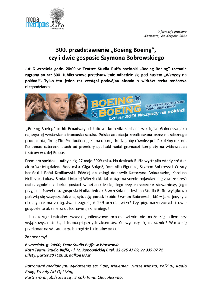 Informacja prasowa Warszawa, 20 sierpnia 2013 300. przedstawienie „Boeing Boeing”, czyli dwie gosposie Szymona Bobrowskiego Już 6 września godz. 20:00 w Teatrze Studio Buffo spektakl „Boeing Boeing” zostanie zagrany po raz 300. Jubileuszowe przedstawienie odbędzie się pod hasłem „Wszyscy na pokład!”. Tylko ten jeden raz wystąpi podwójna obsada a widzów czeka mnóstwo niespodzianek. „Boeing Boeing” to hit Broadway’u i kultowa komedia zapisana w księdze Guinnessa jako najczęściej wystawiana francuska sztuka. Polska adaptacja zrealizowana przez niezależnego producenta, firmę Tito Productions, jest na dobrej drodze, aby również pobić kolejny rekord. Po ponad czterech latach od premiery spektakl nadal gromadzi komplety na widowniach teatrów w całej Polsce. Premiera spektaklu odbyła się 27 maja 2009 roku. Na deskach Buffo wystąpiła wtedy szóstka aktorów: Magdalena Boczarska, Olga Bołądź, Dominika Figurska, Szymon Bobrowski, Cezary Kosiński i Rafał Królikowski. Później do załogi dołączyli: Katarzyna Ankudowicz, Karolina Nolbrzak, Łukasz Simlat i Maciej Wierzbicki. Jak dotąd na scenie pojawiało się zawsze sześć osób, zgodnie z liczbą postaci w sztuce: Maks, jego trzy narzeczone stewardesy, jego przyjaciel Paweł oraz gosposia Nadia. Jednak 6 września na deskach Studio Buffo wyjątkowo pojawią się wszyscy. Jak z tą sytuacją poradzi sobie Szymon Bobrowski, który jako jedyny z obsady nie ma zastępstwa i zagrał już 299 przedstawień? Czy pięć narzeczonych i dwie gosposie to aby nie za dużo, nawet jak na niego? Jak nakazuje teatralny zwyczaj jubileuszowe przedstawienie nie może się odbyć bez wyjątkowych atrakcji i humorystycznych akcentów. Co wydarzy się na scenie? Warto się przekonać na własne oczy, bo będzie to totalny odlot! Zapraszamy! 6 września, g. 20:00, Teatr Studio Buffo w Warszawie Kasa Teatru Studio Buffo, ul. M. Konopnickiej 6 tel. 22 625 47 09, 22 339 07 71 Bilety: parter 90 i 120 zł, balkon 80 zł Patronami medialnymi wydarzenia są: Gala, Malemen, Nasze Miasto, Polki.pl, Radio Roxy, Trendy Art Of Living. Partnerami jubileuszu są : Smaki Vina, Chocolissimo.
