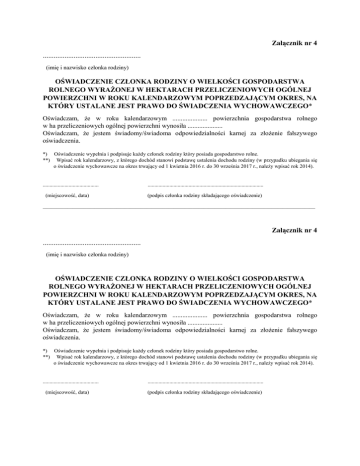 Załącznik nr 4 ...................................................... (imię i nazwisko członka rodziny) OŚWIADCZENIE CZŁONKA RODZINY O WIELKOŚCI GOSPODARSTWA ROLNEGO WYRAŻONEJ W HEKTARACH PRZELICZENIOWYCH OGÓLNEJ POWIERZCHNI W ROKU KALENDARZOWYM POPRZEDZAJĄCYM OKRES, NA KTÓRY USTALANE JEST PRAWO DO ŚWIADCZENIA WYCHOWAWCZEGO* Oświadczam, że w roku kalendarzowym ..................... powierzchnia gospodarstwa rolnego w ha przeliczeniowych ogólnej powierzchni wynosiła ..................... Oświadczam, że jestem świadomy/świadoma odpowiedzialności karnej za złożenie fałszywego oświadczenia. *) Oświadczenie wypełnia i podpisuje każdy członek rodziny który posiada gospodarstwo rolne. **) Wpisać rok kalendarzowy, z którego dochód stanowi podstawę ustalenia dochodu rodziny (w przypadku ubiegania się o świadczenie wychowawcze na okres trwający od 1 kwietnia 2016 r. do 30 września 2017 r., należy wpisać rok 2014). ......................................... (miejscowość, data) ..................................................................................... (podpis członka rodziny składającego oświadczenie) ____________________________________________________________________________________________________ Załącznik nr 4 ...................................................... (imię i nazwisko członka rodziny) OŚWIADCZENIE CZŁONKA RODZINY O WIELKOŚCI GOSPODARSTWA ROLNEGO WYRAŻONEJ W HEKTARACH PRZELICZENIOWYCH OGÓLNEJ POWIERZCHNI W ROKU KALENDARZOWYM POPRZEDZAJĄCYM OKRES, NA KTÓRY USTALANE JEST PRAWO DO ŚWIADCZENIA WYCHOWAWCZEGO* Oświadczam, że w roku kalendarzowym ..................... powierzchnia gospodarstwa rolnego w ha przeliczeniowych ogólnej powierzchni wynosiła ..................... Oświadczam, że jestem świadomy/świadoma odpowiedzialności karnej za złożenie fałszywego oświadczenia. *) Oświadczenie wypełnia i podpisuje każdy członek rodziny który posiada gospodarstwo rolne. **) Wpisać rok kalendarzowy, z którego dochód stanowi podstawę ustalenia dochodu rodziny (w przypadku ubiegania się o świadczenie wychowawcze na okres trwający od 1 kwietnia 2016 r. do 30 września 2017 r., należy wpisać rok 2014). ......................................... (miejscowość, data) ..................................................................................... (podpis członka rodziny składającego oświadczenie)