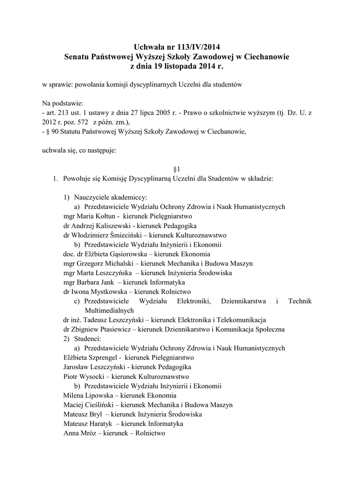 Uchwała nr 113/IV/2014 Senatu Państwowej Wyższej Szkoły Zawodowej w Ciechanowie z dnia 19 listopada 2014 r. w sprawie: powołania komisji dyscyplinarnych Uczelni dla studentów Na podstawie: - art. 213 ust. 1 ustawy z dnia 27 lipca 2005 r. - Prawo o szkolnictwie wyższym (tj. Dz. U. z 2012 r. poz. 572 z późn. zm.), - § 90 Statutu Państwowej Wyższej Szkoły Zawodowej w Ciechanowie, uchwala się, co następuje: §1 1. Powołuje się Komisję Dyscyplinarną Uczelni dla Studentów w składzie: 1) Nauczyciele akademiccy: a) Przedstawiciele Wydziału Ochrony Zdrowia i Nauk Humanistycznych mgr Maria Kołtun - kierunek Pielęgniarstwo dr Andrzej Kaliszewski - kierunek Pedagogika dr Włodzimierz Śmieciński – kierunek Kulturoznawstwo b) Przedstawiciele Wydziału Inżynierii i Ekonomii doc. dr Elżbieta Gąsiorowska – kierunek Ekonomia mgr Grzegorz Michalski – kierunek Mechanika i Budowa Maszyn mgr Marta Leszczyńska – kierunek Inżynieria Środowiska mgr Barbara Jank – kierunek Informatyka dr Iwona Mystkowska – kierunek Rolnictwo c) Przedstawiciele Wydziału Elektroniki, Dziennikarstwa i Technik Multimedialnych dr inż. Tadeusz Leszczyński – kierunek Elektronika i Telekomunikacja dr Zbigniew Ptasiewicz – kierunek Dziennikarstwo i Komunikacja Społeczna 2) Studenci: a) Przedstawiciele Wydziału Ochrony Zdrowia i Nauk Humanistycznych Elżbieta Szprengel - kierunek Pielęgniarstwo Jarosław Leszczyński - kierunek Pedagogika Piotr Wysocki – kierunek Kulturoznawstwo b) Przedstawiciele Wydziału Inżynierii i Ekonomii Milena Lipowska – kierunek Ekonomia Maciej Cieśliński – kierunek Mechanika i Budowa Maszyn Mateusz Bryl – kierunek Inżynieria Środowiska Mateusz Haratyk – kierunek Informatyka Anna Mróz – kierunek – Rolnictwo c) Przedstawiciele Wydziału Elektroniki, Dziennikarstwa i Technik Multimedialnych Dawid Tometczak– kierunek Elektronika i Telekomunikacja Mateusz Grześkiewicz – kierunek Dziennikarstwo i Komunikacja Społeczna 3) Powołuje się Przewodniczącego Komisji w osobie doc. dr Elżbiety Gąsiorowskiej 4) Powołuje się zastępcę Przewodniczącego Komisji w osobie dr Andrzeja Kaliszewskiego §2 1. Powołuje się Odwoławczą Komisje Dyscyplinarną Uczelni dla Studentów w składzie: 1) Nauczyciele akademiccy: a) Przedstawiciele Wydziału Ochrony Zdrowia i Nauk Humanistycznych dr Agnieszka Bukowska - kierunek Pielęgniarstwo prof. Ryszard Gerlach - kierunek Pedagogika dr Teresa Dworecka – kierunek Kulturoznawstwo b) Przedstawiciele Wydziału Inżynierii i Ekonomii dr Katarzyna Szymańska – kierunek Ekonomia mgr inż. Wojciech Pasternak – kierunek Mechanika i Budowa Maszyn dr inż. Michał Bednarczyk – kierunek Inżynieria Środowiska dr Andrzej Mach – kierunek Informatyka dr inż. Anna Rak – kierunek – Rolnictwo c) Przedstawiciele Wydziału Elektroniki, Dziennikarstwa i Technik Multimedialnych dr inż. Monika Tupaj – kierunek Elektronika i Telekomunikacja dr Renata Rozbicka – kierunek Dziennikarstwo i Komunikacja Społeczna 2) Studenci: a) Przedstawiciele Wydziału Ochrony Zdrowia i Nauk Humanistycznych Kinga Komoniewska - kierunek Pielęgniarstwo Michał Mackiewicz - kierunek Pedagogika Angelika Michalska – kierunek Kulturoznawstwo b) Przedstawiciele Wydziału Inżynierii i Ekonomii Milena Zmorzyńska – kierunek Ekonomia Ewa Jankowska – kierunek Mechanika i Budowa Maszyn Piotr Czajkowski – kierunek Inżynieria Środowiska Tomasz Jeznach – kierunek Informatyka Maciej Koliński – kierunek – Rolnictwo c) Przedstawiciele Wydziału Elektroniki, Dziennikarstwa i Technik Multimedialnych Łukasz Domański– kierunek Elektronika i Telekomunikacja Arkadiusz Czarnecki – kierunek Dziennikarstwo i Komunikacja Społeczna 3) Powołuje się Przewodniczącego Komisji w osobie prof. Ryszarda Gerlacha 4) Powołuje się zastępcę Przewodniczącego Komisji w osobie dr Katarzyny Szymańskiej §3 Komisje, o których mowa w §§ 1 i 2 zostają powołane na okres kadencji organów Uczelni 2012-2016. §4 Uchwała wchodzi w życie z dniem podjęcia Przewodniczący Senatu Doc. dr Leszek Zygner