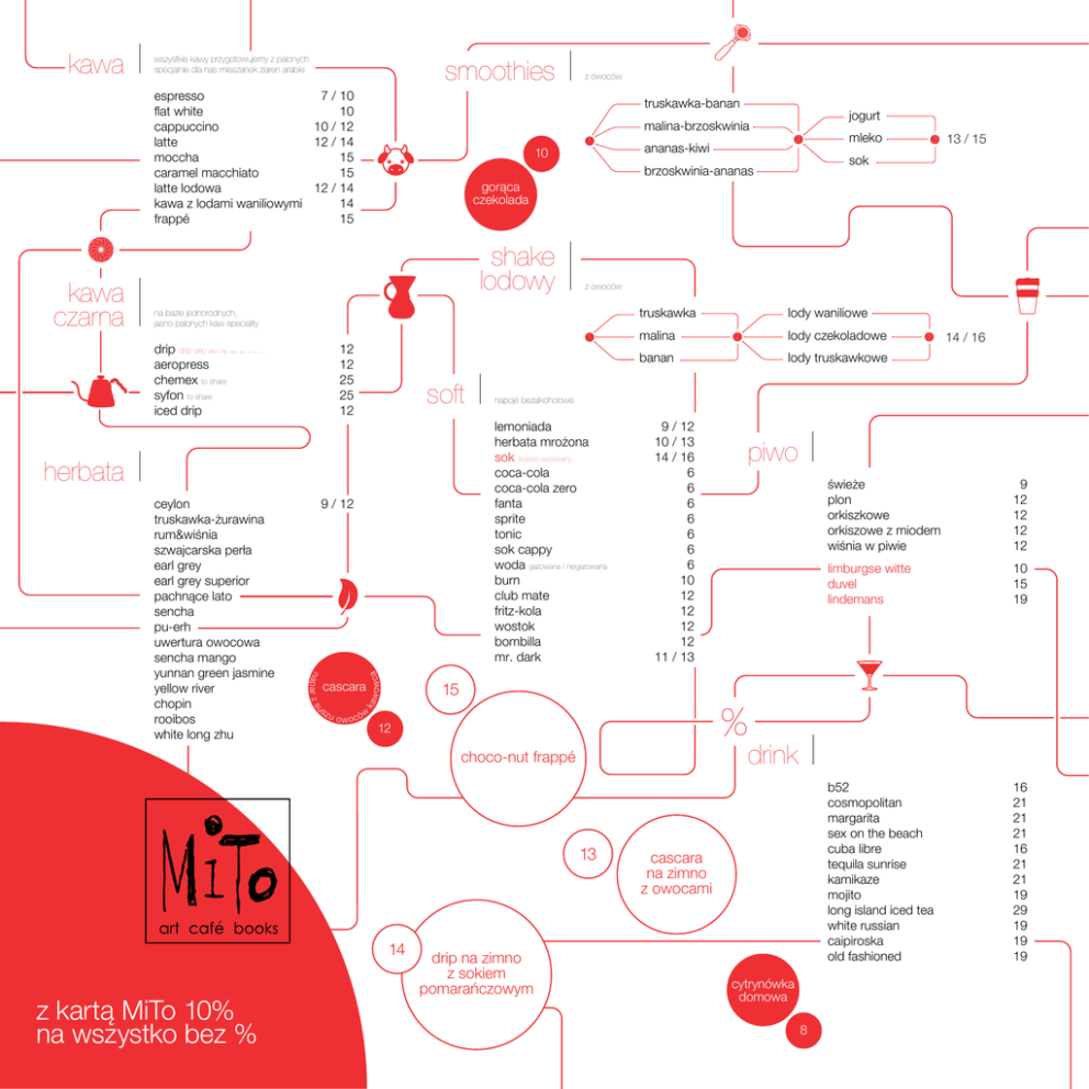 kawa smoothies wszystkie kawy przygotowujemy z palonych specjalnie dla nas mieszanek ziaren arabiki espresso 7 / 10 flat white 10 cappuccino 10 / 12 latte 12 / 14 moccha 15 caramel macchiato 15 latte lodowa 12 / 14 kawa z lodami waniliowymi 14 frappé 15 kawa czarna z owoców truskawka-banan 10 1 drip drip drip drip drip 1 12 12 25 25 12 drip nap ar z su wowca 9 / 12 9 / 12 10 / 13 14 / 16 6 6 6 6 6 6 6 10 12 12 12 12 11 / 13 2 lody czekoladowe 3 14 / 16 lody truskawkowe piwo świeże plon orkiszkowe orkiszowe z miodem wiśnia w piwie 9 12 12 12 12 limburgse witte duvel lindemans 10 15 19 b52 cosmopolitan margarita sex on the beach cuba libre tequila sunrise kamikaze mojito long island iced tea white russian caipiroska old fashioned 16 21 21 21 16 21 21 19 29 19 19 19 ka u o woców 12 drink choco-nut frappé 13 14 z kartą MiTo 10% na wszystko bez % sok 15 cascara sz 13 / 15 napoje bezalkoholowe lemoniada herbata mrożona sok świeżo wyciskany coca-cola coca-cola zero fanta sprite tonic sok cappy woda gazowana / niegazowana burn club mate fritz-kola wostok bombilla mr. dark herbata ceylon truskawka-żurawina rum&wiśnia szwajcarska perła earl grey earl grey superior pachnące lato sencha pu-erh uwertura owocowa sencha mango yunnan green jasmine yellow river chopin rooibos white long zhu malina banan soft 3 lody waniliowe truskawka drip mleko z owoców na bazie jednorodnych, jasno palonych kaw speciality drip drip drip drip aeropress chemex to share syfon to share iced drip 2 ananas-kiwi brzoskwinia-ananas gorąca czekolada shake lodowy jogurt malina-brzoskwinia drip na zimno z sokiem pomarańczowym cascara na zimno z owocami cytrynówka domowa 8 śniadanie #omnomnomnom owsianka lekko solona na mleku ze świeżymi owocami i migdałami kasza jaglana z masłem orzechowym, bananem i orzeszkami ziemnymi jogurt z musli i świeżymi owocami podawany z croissantem maślanym kanapka z wędzonym indykiem zapiekanym z serem, z roszponką, pomidorem i jajem sadzonym omlet z łososiem, awokado, twarożkiem, roszponką i limonką omlet z boczkiem, żółtym serem, roszponką i pomidorem chałka z pieca z kremem mascarpone i świeżymi owocami 22,5 rt ą MiT 12-23 o z ka 25 przystawka 8-23 z il e c h c e s z cukiernia danie 10 12 10 12 14 16 16 14 16 wypiekanie na miejscu, najlepiej. #tuczewitka croissant maślany croissant czekoladowy croissant malinowy tarta na słodko ciasto domowe zapytaj! tort bezowy deser lodowy 12-23 mały głód? hummus z pieczywem lub nachosami hummus ze świeżymi warzywami tosty z salsą pomidorową i bazylią tosty z mozzarellą, pesto i pomidorkami koktajlowymi tosty z camembertem, suszonymi pomidorami i czarnymi oliwkami tosty z masłem orzechowym, szczypiorkiem i pomidorem tosty z pastą z tuńczyka, żółtym serem i ogórkiem konserwowym kanapka z łososiem i roszponką kanapka z szynką serrano i roszponką śniadanie weekendowe je s 10 12 16 16 18 20 20 6 6 6 12 14 16 16 duży głód? zupa codziennie inna grillowana cukinia, bakłażan oraz papryka z serem feta i pistacjami na pęczaku kuskus z pomidorami, papryką, natką pietruszki, czarnymi oliwkami oraz czerwoną cebulą krewetki z pomidorkami koktajlowymi, natką pietruszki i limonką, podawane z pieczywem kula mozzarelli owinięta w szynkę serrano, zapieczona z salsą pomidorową burger z siekanej piersi kurczaka z warzywami z sosem lekko czosnkowym placki tortilli zapieczone z kurczakiem, mozzarellą i szpinakiem pieczona kaczka w sosie lekko czosnkowym na pieczywie z roszponką grillowany kurczak na sałacie rzymskiej z awokado i pomidorami kura w sosie z masła orzechowego na pieczonych ziemniakach z pomidorkami i awokado pierś kaczki z żurawiną na pieczonych łódeczkach ziemniaków z rozmarynem tarta na słono w kruchym cieście z sałatką 10 22 24 24 26 26 28 29 30 32 39 19 1. zrób zdjęcie jedzenia 2. otaguj @MiToART na 3. zapłać 10% mniej MiToMiTo 8-12 21 poniedziałek 21 wtorek 21 środa 24 czwartek 29 piątek 15 sobota / niedziela @MiToART