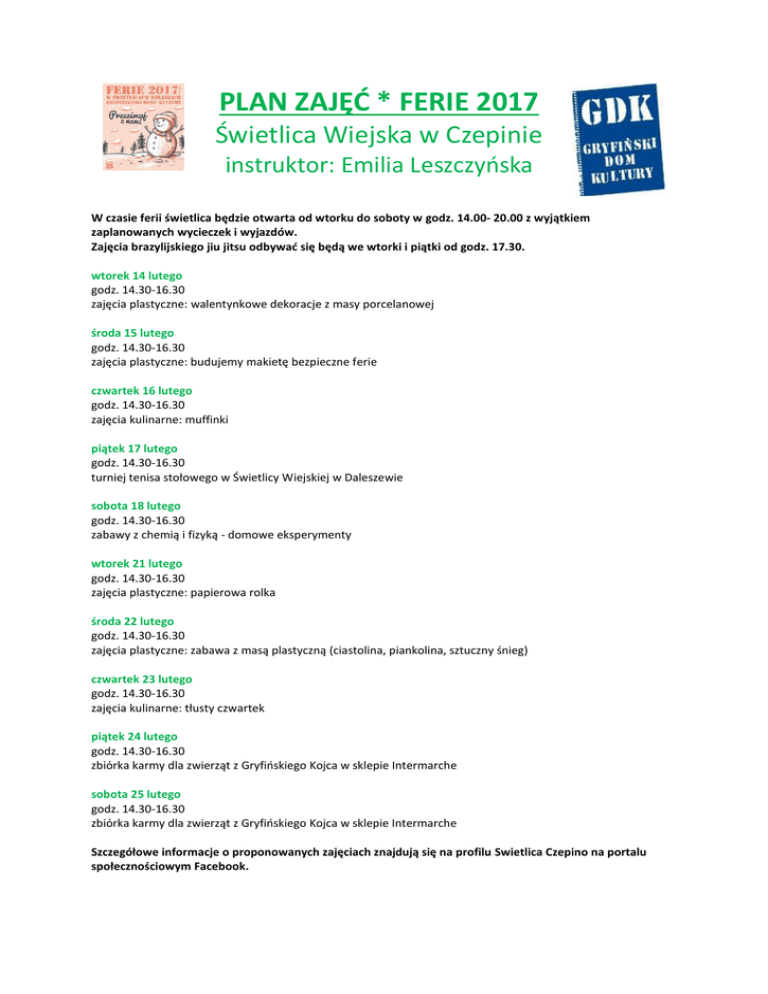 PLAN ZAJĘĆ * FERIE 2017 Świetlica Wiejska w Czepinie instruktor: Emilia Leszczyńska W czasie ferii świetlica będzie otwarta od wtorku do soboty w godz. 14.00- 20.00 z wyjątkiem zaplanowanych wycieczek i wyjazdów. Zajęcia brazylijskiego jiu jitsu odbywać się będą we wtorki i piątki od godz. 17.30. wtorek 14 lutego godz. 14.30-16.30 zajęcia plastyczne: walentynkowe dekoracje z masy porcelanowej środa 15 lutego godz. 14.30-16.30 zajęcia plastyczne: budujemy makietę bezpieczne ferie czwartek 16 lutego godz. 14.30-16.30 zajęcia kulinarne: muffinki piątek 17 lutego godz. 14.30-16.30 turniej tenisa stołowego w Świetlicy Wiejskiej w Daleszewie sobota 18 lutego godz. 14.30-16.30 zabawy z chemią i fizyką - domowe eksperymenty wtorek 21 lutego godz. 14.30-16.30 zajęcia plastyczne: papierowa rolka środa 22 lutego godz. 14.30-16.30 zajęcia plastyczne: zabawa z masą plastyczną (ciastolina, piankolina, sztuczny śnieg) czwartek 23 lutego godz. 14.30-16.30 zajęcia kulinarne: tłusty czwartek piątek 24 lutego godz. 14.30-16.30 zbiórka karmy dla zwierząt z Gryfińskiego Kojca w sklepie Intermarche sobota 25 lutego godz. 14.30-16.30 zbiórka karmy dla zwierząt z Gryfińskiego Kojca w sklepie Intermarche Szczegółowe informacje o proponowanych zajęciach znajdują się na profilu Swietlica Czepino na portalu społecznościowym Facebook.
