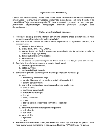 Ogólne Warunki Współpracy Ogólne warunki współpracy, zwane dalej OWW, mają zastosowanie do umów zawieranych przez Milenę Trojanowską prowadzącą działalność gospodarczą pod firmą Fabryka Flag Linea Milena Trojanowska (zwaną dalej FF Linea) z osobami fizycznymi, osobami prawnymi i jednostkami organizacyjnymi niebędącymi osobami prawnymi (zwanymi dalej Zamawiającym) §1 Ogólne warunki realizacji zamówień 1. Podstawę realizacji zlecenia stanowi zamówienie złoŜone drogą elektroniczną (e-mail) lub przez nasz elektroniczny formularz zamówień. 2. Zamówienie musi zawierać wszelkie informacje potrzebne do wykonania zlecenia, a w szczególności: a. nazwę/tytuł zamówienia, b. kolory (PMS, HKS, RAL, CMYK), c. rozmiar (jeŜeli nie będzie oznaczony to przyjmuje się, Ŝe pierwszy wymiar to szerokość, drugi wysokość), d. dokładną konfekcję/wykończenie e. adres dostawy, f. wskazanie umiejscowienia pliku do druku, jeŜeli nie jest dołączony do zamówienia 3. Zamówienie moŜe być wykonane w jednej z trzech wersji: a. z konfekcją/wykończeniem, b. cięte na wymiar, c. bez konfekcji/wykończenia. 4. Zamówienie powinno zawierać pełne informacje dotyczące konfekcji, tj.: a. tunel: • z taśmy czy z materiału flagi, • rozmiar (średnicy lub na płasko – są to 2 róŜne wielkości), • otwarty czy zamknięty. b. elementy mocujące jakie stosujemy w obszyciu flag to m.in.: • płaskie klipsy, • plastikowe karabińczyki, • metalowe karabińczyki, • D-ringi, • klipsy na sznurek. • oczka • Ŝabki z kółkiem (stosowane domyślnie) i bez kółek • inne c. banery drukowane na tekstyliach mogą mieć: • boki obszyte, • boki cięte d. banery PCV: • zgrzewane • cięte 5. Konfekcja niestandardowa, która jest dodatkowo płatna, np. boki cięte na gorąco i inne, musi być wyraźnie zaznaczona w zamówieniu. Banerów PCV nie tniemy na gorąco. 6. Dla uniknięcia nieporozumień, prosimy o dokładne i wyczerpujące podawanie danych dotyczących zamówienia. Ewentualne błędy w zamówieniu mogą skutkować przesunięciem terminu realizacji zlecenia. 7. Zamówienie uwaŜa się za przyjęte do realizacji wyłącznie w przypadku jego potwierdzenia przez FF Linea. 8. JeŜeli w projekcie mają zostać uŜyte kolory PMS, HKS lub RAL, naleŜy to zaznaczyć w zamówieniu. Kolory będące w pliku, a nieujęte w zamówieniu, mogą zostać nieuwzględnione przez nasze oprogramowanie. 9. JeŜeli zamówienie zawiera wiele layoutów, Zamawiający powinien to wyraźnie zaznaczyć. W przeciwnym wypadku FF Linea zastrzega sobie prawo do druku dowolnego layoutu w ilości sztuk podanej w zamówieniu. 10. Fabryka Flag Linea nie ma obowiązku przechowywania archiwum zamówień. 11. Nie ma moŜliwości realizacji zamówienia na podstawie numeru wcześniejszej faktury. Do powtórnej realizacji zamówienia wymagane jest wskazanie nazwy oraz daty realizacji poprzedniego. 12. Chcąc otrzymać te same kolory, przy powtarzaniu zamówienia, naleŜy podać nazwę poprzedniego zamówienia i datę jego realizacji. W przypadku braku tych informacji, nie gwarantujemy powtórzenia tych samych kolorów. 13. Wydruk zamówienia rozpoczynany jest po akceptacji wysłanego przez FF Linea do Zamawiającego szkicu (w postaci pliku PDF). Zamówienia realizowane w terminie 1-2 dniowym produkowane są bez akceptacji szkicu, chyba Ŝe Zamawiający wyraźnie tego zaŜąda. Opóźnienia w akceptacji szkicu automatycznie przesuwają termin produkcji oraz wysyłkę. 14. Zamawiający, akceptując przesłany przez FF Linea szkic, powinien zachować szczególną uwagę przy jego potwierdzaniu. FF Linea nie odpowiada za błędy w potwierdzonym szkicu. Potwierdzenie szkicu traktuje się jako ostateczną akceptację layoutu. 15. Przesłane przez FF Linea szkice powinny być przez Zamawiającego dokładnie sprawdzone. FF Linea nie odpowiada za elementy, które znikają podczas pracy z plikami. 16. Naniesienie zmian na plikach w formacie PDF, który otrzymujecie Państwo do akceptacji, wymaga powiadomienia FF Linea. Brak powiadomienia skutkuje nieuwzględnieniem zmian. 17. Wszelkie zmiany, wprowadzane do zamówienia po jego przyjęciu do realizacji wymagają poinformowania FF Linea w formie mailowej. Wprowadzenie zmian, o ile jest to moŜliwe, wymaga potwierdzenia ze strony FF Linea. Brak potwierdzenia ze strony FF Linea oznacza nieuwzględnienie zmian. 18. Towaru, niezgodnego z zamówieniem lub reklamowanego, nie moŜna uŜywać lub sprzedawać dalej. §2 Uwagi ogólne 1. FF Linea pracuje na platformie Microsoft Windows. 2. Siła wiatru jaką wytrzymują flagi lub banery produkowane w FF Linea to 55 km/h, zaś flagi plaŜowe – 35 km/h. 3. Wysyłane firmą kurierską zamówienia, drukowane na materiałach PCV do 2,5m szerokości, są domyślnie rolowane. Inny sposób pakowania wymaga wyraźnego zaznaczenia w zamówieniu. Szersze, rolowane zamówienia mogą być wysyłane przez firmę spedycyjną, wymaga to zaznaczenia w zamówieniu. Przy braku informacji w zamówieniu, zamówienia szersze niŜ 2,5m, domyślnie rolujemy i wysyłamy spedycją. Zamówienia na materiale PCV mogą być składane na wyraźne Ŝyczenie Zamawiającego. 4. Banery PCV są domyślnie zgrzewane dookoła i oczkowane co 50 cm. 5. Są dwa rodzaje druku PCV: do ekspozycji wewnętrznej, wysokiej jakości, mniej odporny na ścieranie oraz zewnętrznej, druk wielkoformatowy. 6. JeŜeli konfekcja banerów zawiera kije lub pręty, są one zawsze rolowane. 7. Banery z metalowymi prętami mają domyślnie cięte boki. 8. Banery z dekoru są rolowane tylko i wyłącznie, jeŜeli zostało to zaznaczone w zamówieniu. W innym przypadku są składane do kartonu. 9. Stosowane przez FF Linea w druku na tekstyliach i w druku PCV oczka mają średnicę 10mm. 10. Drukowane w FF Linea na tekstyliach flagi i banery są zawsze przezierne. Procent prześwitu zaleŜy od wybranego materiału oraz drukowanych layoutów. 11. FF Linea domyślnie robi t