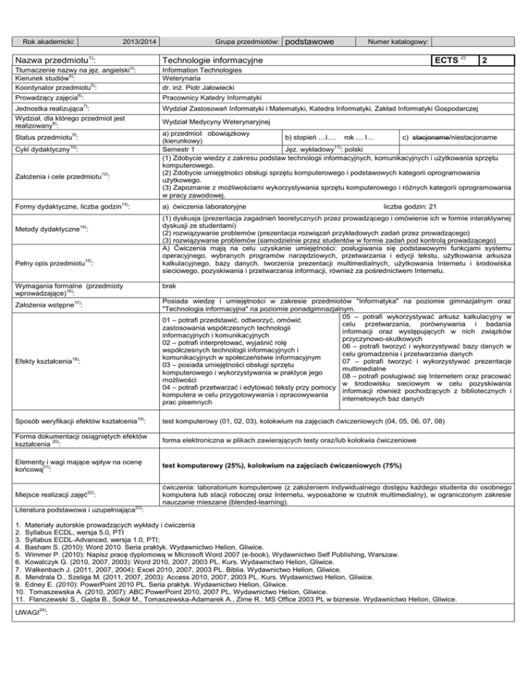 Rok akademicki: Grupa przedmiotów: 2013/2014 Nazwa przedmiotu1): podstawowe Numer katalogowy: ECTS 2) Technologie informacyjne 3) Tłumaczenie nazwy na jęz. angielski : Kierunek studiów4): Koordynator przedmiotu5): Information Technologies Weterynaria dr. inż. Piotr Jałowiecki Prowadzący zajęcia6): Pracownicy Katedry Informatyki 7) Jednostka realizująca : Wydział Zastosowań Informatyki i Matematyki, Katedra Informatyki, Zakład Informatyki Gospodarczej Wydział, dla którego przedmiot jest realizowany8): Wydział Medycyny Weterynaryjnej Status przedmiotu9): Cykl dydaktyczny10): Założenia i cele przedmiotu12): Formy dydaktyczne, liczba godzin13): Metody dydaktyczne14): Pełny opis przedmiotu15): Wymagania formalne (przedmioty wprowadzające)16): Założenia wstępne17): Efekty kształcenia18): 2 a) przedmiot obowiązkowy b) stopień …I…. rok … I… c) stacjonarne/niestacjonarne (kierunkowy) Semestr 1 Jęz. wykładowy11): polski (1) Zdobycie wiedzy z zakresu podstaw technologii informacyjnych, komunikacyjnych i użytkowania sprzętu komputerowego. (2) Zdobycie umiejętności obsługi sprzętu komputerowego i podstawowych kategorii oprogramowania użytkowego. (3) Zapoznanie z możliwościami wykorzystywania sprzętu komputerowego i różnych kategorii oprogramowania w pracy zawodowej. a) ćwiczenia laboratoryjne liczba godzin: 21 (1) dyskusja (prezentacja zagadnień teoretycznych przez prowadzącego i omówienie ich w formie interaktywnej dyskusji ze studentami) (2) rozwiązywanie problemów (prezentacja rozwiązań przykładowych zadań przez prowadzącego) (3) rozwiązywanie problemów (samodzielnie przez studentów w formie zadań pod kontrolą prowadzącego) A) Ćwiczenia mają na celu uzyskanie umiejętności: posługiwania się podstawowymi funkcjami systemu operacyjnego, wybranych programów narzędziowych, przetwarzania i edycji tekstu, użytkowania arkusza kalkulacyjnego, bazy danych, tworzenia prezentacji multimedialnych, użytkowania Internetu i środowiska sieciowego, pozyskiwania i przetwarzania informacji, również za pośrednictwem Internetu. brak Posiada wiedzę i umiejętności w zakresie przedmiotów "Informatyka" na poziomie gimnazjalnym oraz "Technologia informacyjna" na poziomie ponadgimnazjalnym. 05 – potrafi wykorzystywać arkusz kalkulacyjny w 01 – potrafi przedstawić, odtworzyć, omówić celu przetwarzania, porównywania i badania zastosowania współczesnych technologii informacji oraz występujących w nich związków informacyjnych i komunikacyjnych przyczynowo-skutkowych 02 – potrafi interpretować, wyjaśnić rolę 06 – potrafi tworzyć i wykorzystywać bazy danych w współczesnych technologii informacyjnych i celu gromadzenia i przetwarzania danych komunikacyjnych w społeczeństwie informacyjnym 07 – potrafi tworzyć i wykorzystywać prezentacje 03 – posiada umiejętności obsługi sprzętu multimedialne komputerowego i wykorzystywania w praktyce jego 08 – potrafi posługiwać się Internetem oraz pracować możliwości w środowisku sieciowym w celu pozyskiwania 04 – potrafi przetwarzać i edytować teksty przy pomocy informacji również pochodzących z bibliotecznych i komputera w celu przygotowywania i opracowywania internetowych baz danych prac pisemnych Sposób weryfikacji efektów kształcenia19): test komputerowy (01, 02, 03), kolokwium na zajęciach ćwiczeniowych (04, 05, 06, 07, 08) Forma dokumentacji osiągniętych efektów kształcenia 20): forma elektroniczna w plikach zawierających testy oraz/lub kolokwia ćwiczeniowe Elementy i wagi mające wpływ na ocenę końcową21): test komputerowy (25%), kolokwium na zajęciach ćwiczeniowych (75%) Miejsce realizacji zajęć22): ćwiczenia: laboratorium komputerowe (z założeniem indywidualnego dostępu każdego studenta do osobnego komputera lub stacji roboczej oraz Internetu, wyposażone w rzutnik multimedialny), w ograniczonym zakresie nauczanie mieszane (blended-learning). Literatura podstawowa i uzupełniająca23): 1. Materiały autorskie prowadzących wykłady i ćwiczenia 2. Syllabus ECDL, wersja 5.0, PTI 3. Syllabus ECDL-Advanced, wersja 1.0, PTI; 4. Basham S. (2010): Word 2010. Seria praktyk. Wydawnictwo Helion, Gliwice. 5. Wimmer P. (2010): Napisz pracę dyplomową w Microsoft Word 2007 (e-book), Wydawnictwo Self Publishing, Warszaw. 6. Kowalczyk G. (2010, 2007, 2003): Word 2010, 2007, 2003 PL. Kurs. Wydawnictwo Helion, Gliwice. 7. Walkenbach J. (2011, 2007, 2004): Excel 2010, 2007, 2003 PL. Biblia. Wydawnictwo Helion, Gliwice. 8. Mendrala D., Szeliga M. (2011, 2007, 2003): Access 2010, 2007, 2003 PL. Kurs. Wydawnictwo Helion, Gliwice. 9. Edney E. (2010): PowerPoint 2010 PL. Seria praktyk. Wydawnictwo Helion, Gliwice. 10. Tomaszewska A. (2010, 2007): ABC PowerPoint 2010, 2007 PL. Wydawnictwo Helion, Gliwice. 11. Flanczewski S., Gajda B., Sokół M., Tomaszewska-Adamarek A., Zime R.: MS Office 2003 PL w biznesie. Wydawnictwo Helion, Gliwice. UWAGI24): Wskaźniki ilościowe charakteryzujące moduł/przedmiot25) : Technologie Informacyjne Szacunkowa sumaryczna liczba godzin pracy studenta (kontaktowych i pracy własnej) niezbędna dla osiągnięcia zakładanych efektów kształcenia18): Razem Łączna liczba punktów ECTS, którą student uzyskuje na zajęciach wymagających bezpośredniego udziału nauczycieli akademickich: Łączna liczba punktów ECTS, którą student uzyskuje w ramach zajęć o charakterze praktycznym, takich jak zajęcia laboratoryjne, projektowe, itp.: 60 h 1,1 ECTS 1,5 ECTS Szacunkowa sumaryczna liczba godzin pracy studenta (kontaktowych i pracy własnej) niezbędna dla osiągnięcia zakładanych efektów kształcenia18 Wykłady Ćwiczenia laboratoryjne Dokończenie zadań prowadzonych podczas ćwiczeń Przygotowanie do sprawdzianów Udział w konsultacjach Przygotowanie do egzaminu Obecność na egzaminie Razem Łączna liczba punktów ECTS, którą student uzyskuje na zajęciach wymagających bezpośredniego udziału nauczycieli ak
