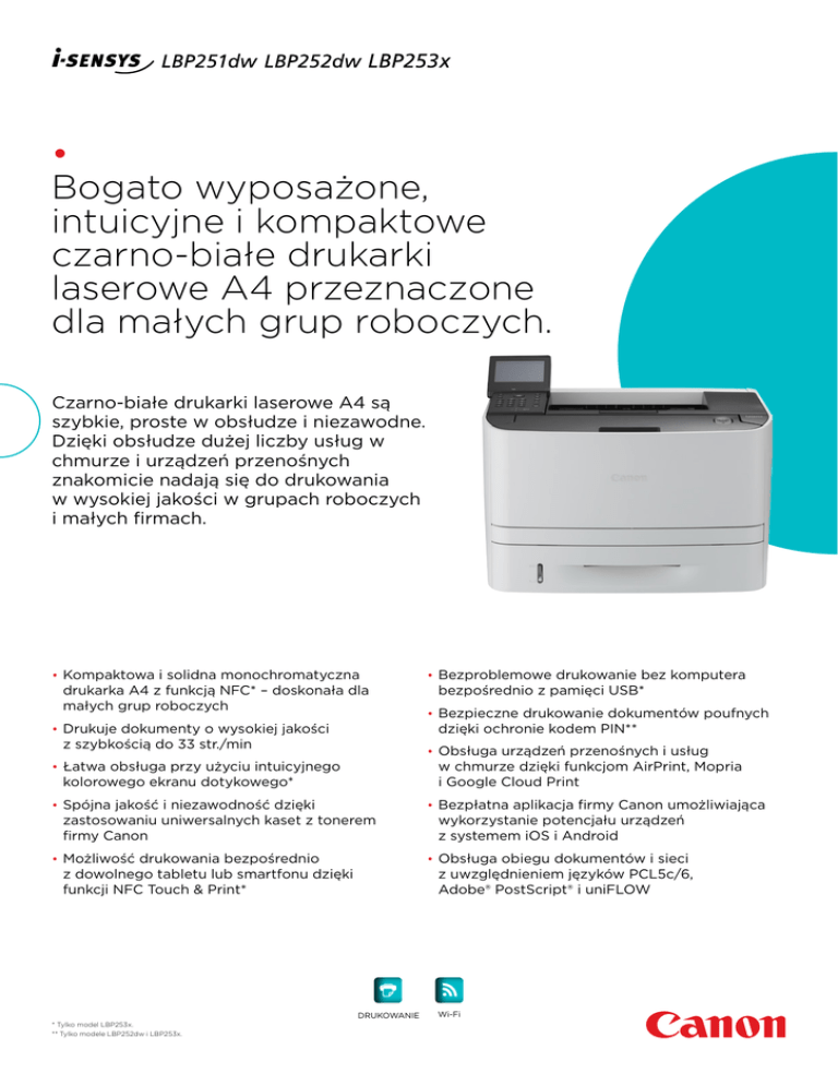 • Bogato wyposażone, intuicyjne i kompaktowe czarno-białe drukarki laserowe A4 przeznaczone dla małych grup roboczych. Czarno-białe drukarki laserowe A4 są szybkie, proste w obsłudze i niezawodne. Dzięki obsłudze dużej liczby usług w chmurze i urządzeń przenośnych znakomicie nadają się do drukowania w wysokiej jakości w grupach roboczych i małych firmach. • Kompaktowa i solidna monochromatyczna drukarka A4 z funkcją NFC* – doskonała dla małych grup roboczych • Drukuje dokumenty o wysokiej jakości • Bezproblemowe drukowanie bez komputera bezpośrednio z pamięci USB* • Bezpieczne drukowanie dokumentów poufnych dzięki ochronie kodem PIN** z szybkością do 33 str./min • Obsługa urządzeń przenośnych i usług • Łatwa obsługa przy użyciu intuicyjnego w chmurze dzięki funkcjom AirPrint, Mopria i Google Cloud Print kolorowego ekranu dotykowego* • Spójna jakość i niezawodność dzięki • Bezpłatna aplikacja firmy Canon umożliwiająca • Możliwość drukowania bezpośrednio • Obsługa obiegu dokumentów i sieci zastosowaniu uniwersalnych kaset z tonerem firmy Canon z dowolnego tabletu lub smartfonu dzięki funkcji NFC Touch & Print* z uwzględnieniem języków PCL5c/6, Adobe® PostScript® i uniFLOW DRUKOWANIE * Tylko model LBP253x. ** Tylko modele LBP252dw i LBP253x. wykorzystanie potencjału urządzeń z systemem iOS i Android Wi-Fi • Dane techniczne Poziom hałasu MECHANIZM DRUKARKI Szybkość drukowania LBP251dw: Jednostronne: tryb normalny – do 30 str./min (A4) Dwustronne: do 16 obr./min (A4) Moc akustyczna3: Praca: 69,5 dB (LBP251dw), 70,6 dB (LBP252dw, LBP253x) Tryb gotowości: poniżej poziomu słyszalności LBP252dw, LBP253x: Jednostronne: do 33 str./min (A4) Dwustronne: do 16,8 obr./min (A4) Ciśnienie akustyczne3: Praca: 53 dB Tryb gotowości: poniżej poziomu słyszalności Metoda drukowania Monochromatyczny druk laserowy Jakość wydruku Maks. 1200 × 1200 dpi Rozdzielczość drukowania Maks. 600 × 600 dpi Czas nagrzewania Około 16 s lub mniej od włączenia zasilania Czas wydruku pierwszej strony Około 6 s Zalecany nakład miesięczny LBP251dw: 750–2500 stron miesięcznie Wymiary (szer. × dł. × wys.) LBP251dw, LBP252dw: 400 × 377 × 298 mm LBP253x: 403 × 377 × 317 mm Masa Około 12,4 kg Środowisko pracy Temperatura: od 10 do 30°C Wilgotność: 20–80% wilgotności względnej (bez kondensacji) Panel sterowania LBP251dw, LBP252dw: 5-wierszowy ekran LCD LBP253x: kolorowy ekran dotykowy LCD 8,9 cm LBP252dw, LBP253x: 750–3000 stron miesięcznie Kontroler Szybkość procesora 525 MHz Cykl pracy Maks. 50 000 stron miesięcznie1 Pamięć Marginesy wydruku 5 mm od góry, dołu, lewej i prawej LBP251dw: 512 MB LBP252dw, LBP253x: 1 GB Zaawansowane funkcje drukowania LBP251dw, LBP252dw, LBP253x: Obsługa Google Cloud Print iOS: AirPrint, aplikacja Canon PRINT Business Android: certyfikat Mopria, wtyczka Canon Print Service, aplikacja Canon PRINT Business Języki obsługi drukarki LBP251dw, LBP252dw, LBP253x: UFRII (Ultra Fast Rendering), PCL5e, PCL6 LBP252dw, LBP253x: Bezpieczne drukowanie LBP253x: Drukowanie z pamięci USB (JPEG/TIFF/PDF) Touch & Print (NFC) LBP252dw, LBP253x: Adobe® PostScript Czcionki 93 czcionki PCL, 136 czcionek PS (LBP252dw, LBP253x) Interfejs i opcje połączeń USB 2.0 High-Speed, 10BASE-T/100 BASE-TX/1000BASE-T, łączność bezprzewodowa 802.11b/g/n, bezpośrednie połączenie bezprzewodowe Oprogramowanie i zarządzanie drukarką LBP251dw, LBP252dw, LBP253x: Zdalny interfejs użytkownika (RUI), narzędzie SSID Tool, zarządzanie identyfikatorami działów, narzędzie Toner Status Tool Konsola administracyjna iW: oparte na serwerze oprogramowanie do centralnego zarządzania flotą urządzeń. eMaintenance: wbudowany RDS pozwala korzystać z usług eMaintenance, takich jak odczyty liczników, automatyczne zarządzanie materiałami eksploatacyjny i zdalna diagnostyka. OBSŁUGA NOŚNIKÓW Podajnik papieru (standardowy) Kaseta o pojemności 250 arkuszy Taca uniwersalna na 50 arkuszy Podajnik papieru (opcjonalny) Kaseta o pojemności 500 arkuszy Odbiornik papieru Wydrukiem do dołu: na 150 arkuszy; wydrukiem do góry: na 1 arkusz Typy nośników Papier zwykły, papier makulaturowy, papier o dużej gramaturze, etykiety, koperty, pocztówki Rozmiary nośników Kaseta (standardowa i opcjonalna) A5, A6, LGL, LTR, EXECUTIVE, STATEMENT, FOOLSCAP, 16K; rozmiary niestandardowe (szerokość: od 105,0 do 215,9 mm; długość: od 148,0 do 355,6 mm) Taca uniwersalna: A4, B5, A5, A6, LGL, LTR, EXECUTIVE, STATEMENT, FOOLSCAP, 16K, koperty COM-10, Monarch, DL, C5, karty indeksowe Rozmiary niestandardowe (szerokość: od 76,2 do 215,9 mm; długość: od 127,0 do 355,6 mm) Gramatura nośników Kaseta (standardowa i opcjonalna): od 60 do 120 g/m² Podajnik uniwersalny: 60–163 g/m² Drukowanie dwustronne Automatyczne (tylko A4 / LTR / LGL) Charakterystyka ogólna LBP253x: Zgodność z technologią uniFLOW, wbudowany klient logowania do urządzeń uniFLOW Zgodność z systemami operacyjnymi Materiały eksploatacyjne Kasety uniwersalne 220–240 V (±10%), 50/60 Hz (±2 Hz) Pobór mocy Maks.: około 1150 W lub mniej Praca: około 520 W lub mniej (LBP251dw), 550 W lub mniej (LBP252dw, LBP253x) Tryb gotowości: około 12,1 W lub mniej Tryb uśpienia: około 1 W lub mniej2 Zasilanie wyłączone: 0,1 W lub mniej Standardowe zużycie energii (TEC): 1,1 kWh/tydzień (LBP251dw), 1,2 kWh/tydzień (LBP252dw, LBP253x) Czas bezczynności przed przejściem w tryb uśpienia: 3–60 min (domyślnie 3 min) Czas bezczynności przed automatycznym wyłączeniem: 4 godz. (domyślnie) Canon Inc. canon.com Canon Europe canon-europe.com Wersja polska © Canon Europa N.V., 2015 Standardowa: kaseta 719 (2100 stron5)6 O wysokiej wydajności: kaseta 719 H (6400 stron5)6 Akcesoria / wyposażenie dodatkowe Elementy Wymagania dotyczące zasilania Windows® 10 / Windows® 8.1 / Windows® 8 / Windows® 7 / Server® 2012R2 / Server® 2012 / Ser
