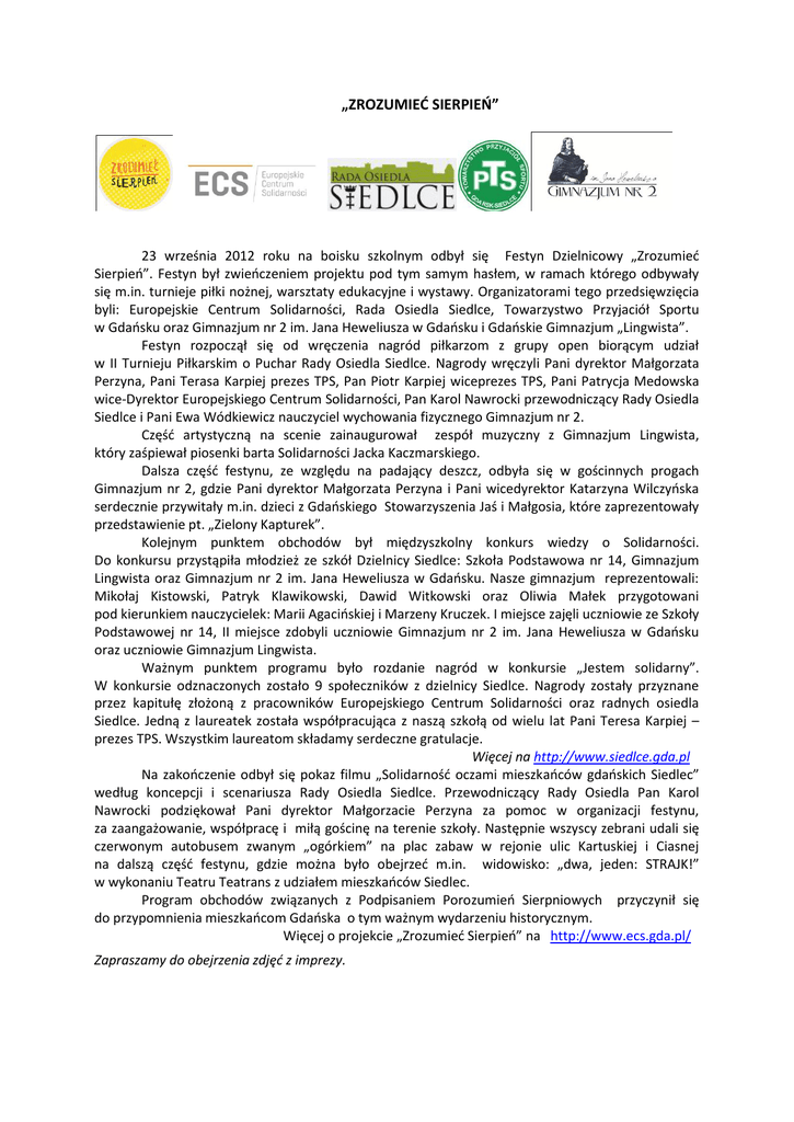 „ZROZUMIEĆ SIERPIEŃ” 23 września 2012 roku na boisku szkolnym odbył się Festyn Dzielnicowy „Zrozumieć Sierpień”. Festyn był zwieńczeniem projektu pod tym samym hasłem, w ramach którego odbywały się m.in. turnieje piłki nożnej, warsztaty edukacyjne i wystawy. Organizatorami tego przedsięwzięcia byli: Europejskie Centrum Solidarności, Rada Osiedla Siedlce, Towarzystwo Przyjaciół Sportu w Gdańsku oraz Gimnazjum nr 2 im. Jana Heweliusza w Gdańsku i Gdańskie Gimnazjum „Lingwista”. Festyn rozpoczął się od wręczenia nagród piłkarzom z grupy open biorącym udział w II Turnieju Piłkarskim o Puchar Rady Osiedla Siedlce. Nagrody wręczyli Pani dyrektor Małgorzata Perzyna, Pani Terasa Karpiej prezes TPS, Pan Piotr Karpiej wiceprezes TPS, Pani Patrycja Medowska wice-Dyrektor Europejskiego Centrum Solidarności, Pan Karol Nawrocki przewodniczący Rady Osiedla Siedlce i Pani Ewa Wódkiewicz nauczyciel wychowania fizycznego Gimnazjum nr 2. Część artystyczną na scenie zainaugurował zespół muzyczny z Gimnazjum Lingwista, który zaśpiewał piosenki barta Solidarności Jacka Kaczmarskiego. Dalsza część festynu, ze względu na padający deszcz, odbyła się w gościnnych progach Gimnazjum nr 2, gdzie Pani dyrektor Małgorzata Perzyna i Pani wicedyrektor Katarzyna Wilczyńska serdecznie przywitały m.in. dzieci z Gdańskiego Stowarzyszenia Jaś i Małgosia, które zaprezentowały przedstawienie pt. „Zielony Kapturek”. Kolejnym punktem obchodów był międzyszkolny konkurs wiedzy o Solidarności. Do konkursu przystąpiła młodzież ze szkół Dzielnicy Siedlce: Szkoła Podstawowa nr 14, Gimnazjum Lingwista oraz Gimnazjum nr 2 im. Jana Heweliusza w Gdańsku. Nasze gimnazjum reprezentowali: Mikołaj Kistowski, Patryk Klawikowski, Dawid Witkowski oraz Oliwia Małek przygotowani pod kierunkiem nauczycielek: Marii Agacińskiej i Marzeny Kruczek. I miejsce zajęli uczniowie ze Szkoły Podstawowej nr 14, II miejsce zdobyli uczniowie Gimnazjum nr 2 im. Jana Heweliusza w Gdańsku oraz uczniowie Gimnazjum Lingwista. Ważnym punktem programu było rozdanie nagród w konkursie „Jestem solidarny”. W konkursie odznaczonych zostało 9 społeczników z dzielnicy Siedlce. Nagrody zostały przyznane przez kapitułę złożoną z pracowników Europejskiego Centrum Solidarności oraz radnych osiedla Siedlce. Jedną z laureatek została współpracująca z naszą szkołą od wielu lat Pani Teresa Karpiej – prezes TPS. Wszystkim laureatom składamy serdeczne gratulacje. Więcej na http://www.siedlce.gda.pl Na zakończenie odbył się pokaz filmu „Solidarność oczami mieszkańców gdańskich Siedlec” według koncepcji i scenariusza Rady Osiedla Siedlce. Przewodniczący Rady Osiedla Pan Karol Nawrocki podziękował Pani dyrektor Małgorzacie Perzyna za pomoc w organizacji festynu, za zaangażowanie, współpracę i miłą gościnę na terenie szkoły. Następnie wszyscy zebrani udali się czerwonym autobusem zwanym „ogórkiem” na plac zabaw w rejonie ulic Kartuskiej i Ciasnej na dalszą część festynu, gdzie można było obejrzeć m.in. widowisko: „dwa, jeden: STRAJK!” w wykonaniu Teatru Teatrans z udziałem mieszkańców Siedlec. Program obchodów związanych z Podpisaniem Porozumień Sierpniowych przyczynił się do przypomnienia mieszkańcom Gdańska o tym ważnym wydarzeniu historycznym. Więcej o projekcie „Zrozumieć Sierpień” na http://www.ecs.gda.pl/ Zapraszamy do obejrzenia zdjęć z imprezy.