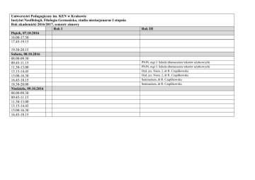 Uniwersytet Pedagogiczny im. KEN w Krakowie Instytut Neofilologii, Filologia Germańska, studia niestacjonarne I stopnia Rok akademicki 2016/2017, semestr zimowy Rok I Piątek, 07.10.2016 16.00-17.30 17.45-19.15 19.30-20.15 Sobota, 08.10.2016 08.00-09.30 09.45-11.15 11.30-13.00 13.15-14.45 15.00-16.30 16.45-18.15 18.30-20.00 Niedziela, 09.10.2016 08.00-09.30 09.45-11.15 11.30-13.00 13.15-14.45 15.00-16.30 16.45-18.15 Rok III PNJN, mgr J. Sekuła (tłumaczenie tekstów użytkowych) PNJN, mgr J. Sekuła (tłumaczenie tekstów użytkowych) Dyd. jez. Niem. 2, dr R. Czaplikowska Dyd. jez. Niem. 2, dr R. Czaplikowska Seminarium, dr R. Czaplikowska Seminarium, dr R. Czaplikowska Uniwersytet Pedagogiczny im. KEN w Krakowie Instytut Neofilologii, Filologia Germańska, studia niestacjonarne I stopnia Rok akademicki 2016/2017, semestr zimowy Rok I Piątek, 14.10.2016 Rok III 16.00-17.30 17.45-19.15 19.30-20.15 Sobota, 15.10.2016 08.00-09.30 09.45-11.15 11.30-13.00 13.15-14.45 15.00-16.30 16.45-18.15 18.30-20.00 Niedziela, 16.10.2015 08.00-09.30 09.45-11.15 11.30-13.00 13.15-14.45 15.00-16.30 16.45-18.15 Historia j. niem. z elementami gram. hist., dr S. Dusza Historia j. niem. z elementami gram. hist., dr S. Dusza Dyd. jez. Niem. 2, dr R. Czaplikowska Dyd. jez. Niem. 2, dr R. Czaplikowska PNJN, dr R. Czaplikowska (redakcja tekstów) PNJN, dr R. Czaplikowska (redakcja tekstów) Historia literatury niemieckojęzycznej 3, dr A. Bednarowska, w. Historia literatury niemieckojęzycznej 3, dr A. Bednarowska, w. Uniwersytet Pedagogiczny im. KEN w Krakowie Instytut Neofilologii, Filologia Germańska, studia niestacjonarne I stopnia Rok akademicki 2016/2017, semestr zimowy Rok I Piątek, 21.10.2016 16.00-17.30 17.45-19.15 19.30-20.15 Sobota, 22.10.2016 08.00-09.30 09.45-11.15 11.30-13.00 13.15-14.45 15.00-16.30 16.45-18.15 18.30-20.00 Niedziela, 23.10.2016 08.00-09.30 09.45-11.15 11.30-13.00 13.15-14.45 15.00-16.30 16.45-18.15 Rok III PNJN, dr R. Czaplikowska (redakcja tekstów) PNJN, dr R. Czaplikowska (redakcja tekstów) Dyd. jez. Niem. 2, dr R. Czaplikowska Dyd. jez. Niem. 2, dr R. Czaplikowska PNJN, mgr J. Sekuła (tłumaczenie tekstów użytkowych) PNJN, mgr J. Sekuła (tłumaczenie tekstów użytkowych) Historia literatury niemieckojęzycznej 3, dr A. Bednarowska, w. Historia literatury niemieckojęzycznej 3, dr A. Bednarowska, w. Uniwersytet Pedagogiczny im. KEN w Krakowie Instytut Neofilologii, Filologia Germańska, studia niestacjonarne I stopnia Rok akademicki 2016/2017, semestr zimowy Rok I Piątek, 04.11.2016 16.00-17.30 17.45-19.15 19.30-20.15 Sobota, 05.11.2016 08.00-09.30 09.45-11.15 11.30-13.00 13.15-14.45 15.00-16.30 16.45-18.15 18.30-20.15 Niedziela, 06.11.2016 08.00-09.30 09.45-11.15 11.30-13.00 13.15-14.45 15.00-16.30 16.45-18.15 PNJN, Gram. Prakt., dr S. Dusza PNJN, Gram. Prakt., dr S. Dusza PNJN, Gram. Prakt., dr S. Dusza PNJN, Roz. Mowy, mgr. J. Sekuła PNJN, Roz. Mowy, mgr. J. Sekuła PNJN, Roz. Tekstu, mgr. J. Sekuła PNJN, Roz. Tekstu, mgr. J. Sekuła PNJN, Pisanie, dr K. Sowa-Bacia PNJN, Konwersacje, dr K. Sowa-Bacia Rok III PNJN, mgr J. Sekuła (tłumaczenie tekstów użytkowych) PNJN, mgr J. Sekuła (tłumaczenie tekstów użytkowych) Historia j. niem. z elementami gram. hist., dr S. Dusza Historia j. niem. z elementami gram. hist., dr S. Dusza Dyd. jez. Niem. 2, dr R. Czaplikowska Dyd. jez. Niem. 2, dr R. Czaplikowska Od 09.00 Historia literatury niemieckojęzycznej 3, dr A. Bednarowska, w. Historia literatury niemieckojęzycznej 3, dr A. Bednarowska, (ćw.) Historia literatury niemieckojęzycznej 3, dr A. Bednarowska, (ćw.) Uniwersytet Pedagogiczny im. KEN w Krakowie Instytut Neofilologii, Filologia Germańska, studia niestacjonarne I stopnia Rok akademicki 2016/2017, semestr zimowy Rok I Piątek, 18.11.2016 PNJN, Fon. Praktyczna I, dr T. Szybisty 16.00-17.30 PNJN, Fon. Praktyczna I, dr T. Szybisty 17.45-19.15 PNJN, Fon. Praktyczna I, dr T. Szybisty 19.30-20.15 Sobota, 19.11.2016 08.00-09.30 PNJN, Krajoznawstwo, mgr B. Marmol 09.45-11.15 PNJN, Krajoznawstwo, mgr B. Marmol 11.30-13.00 PNJN, Roz. Mowy, mgr. J. Sekuła 13.15-14.45 PNJN, Roz. Mowy, mgr. J. Sekuła 15.00-16.30 16.45-18.15 18.30-20.00 Niedziela, 20.11.2016 PNJN, Roz. Tekstu, mgr. J. Sekuła 08.00-09.30 09.45-11.15 11.30-13.00 PNJN, Roz. Tekstu, mgr. J. Sekuła PNJN, Pisanie, dr K. Sowa-Bacia 13.15-14.45 15.00-16.30 16.45-18.15 18.30-20.00 PNJN, Konwersacje, dr K. Sowa-Bacia PNJN, Krajoznawstwo, mgr B. Marmol PNJN, Krajoznawstwo, mgr B. Marmol Rok III PNJN, mgr J. Sekuła (tłumaczenie tekstów użytkowych) PNJN, mgr J. Sekuła (tłumaczenie tekstów użytkowych) Dyd. jez. Niem. 2, dr R. Czaplikowska Dyd. jez. Niem. 2, dr R. Czaplikowska Seminarium, dr R. Czaplikowska Seminarium, dr R. Czaplikowska Od 09.00 Historia literatury niemieckojęzycznej 3, dr A. Bednarowska, w. Historia literatury niemieckojęzycznej 3, dr A. Bednarowska, (ćw.) Uniwersytet Pedagogiczny im. KEN w Krakowie Instytut Neofilologii, Filologia Germańska, studia niestacjonarne I stopnia Rok akademicki 2016/2017, semestr zimowy Rok I Rok III GOp., Dr M. Filar GOp., Dr M. Filar PNJN, Roz. Mowy, mgr. J. Sekuła PNJN, Roz. Mowy, mgr. J. Sekuła PNJN, Gram. Prakt., dr S. Dusza PNJN, Gram. Prakt., dr S. Dusza Dyd. jez. Niem. 2, dr R. Czaplikowska Dyd. jez. Niem. 2, dr R. Czaplikowska Dyd. jez. Niem. 2, dr R. Czaplikowska Historia j. niem. z elementami gram. hist., dr S. Dusza Historia j. niem. z elementami gram. hist., dr S. Dusza PNJN, mgr J. Sekuła (tłumaczenie tekstów użytkowych) PNJN, mgr J. Sekuła (tłumaczenie tekstów użytkowych) Piątek, 25.11.2016 16.00-17.30 17.45-19.15 19.30-20.15 Sobota, 26.11.2016 08.00-09.30 09.45-11.15 11.30-13.00 13.15-14.45 15.00-16.30 16.45-18.15 18.30-20.00 Niedziela, 27.11.2016 Od 09:00Historia literatury niemieckojęzycznej 3, dr A. Bednarowska, w. Historia literatury niemieckojęzycznej 3, dr A. Bednarowska, (ćw.) 08.00-09.30 09.45-11.15 11.30-13.00 13.15-14.45 15.00-16.30 16.45-18.15 PNJN, Pisanie, dr K. So