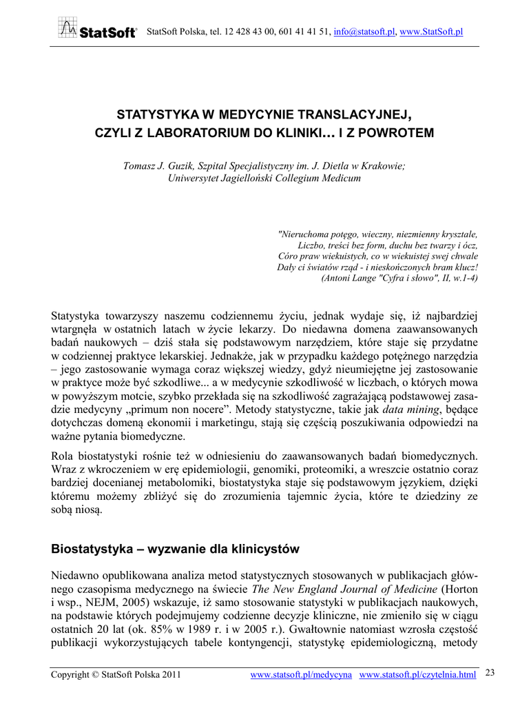 StatSoft Polska, tel. 12 428 43 00, 601 41 41 51, [email protected], www.StatSoft.pl STATYSTYKA W MEDYCYNIE TRANSLACYJNEJ, CZYLI Z LABORATORIUM DO KLINIKI... I Z POWROTEM Tomasz J. Guzik, Szpital Specjalistyczny im. J. Dietla w Krakowie; Uniwersytet Jagielloński Collegium Medicum "Nieruchoma potęgo, wieczny, niezmienny krysztale, Liczbo, treści bez form, duchu bez twarzy i ócz, Córo praw wiekuistych, co w wiekuistej swej chwale Dały ci światów rząd - i nieskończonych bram klucz! (Antoni Lange "Cyfra i słowo", II, w.1-4) Statystyka towarzyszy naszemu codziennemu życiu, jednak wydaje się, iż najbardziej wtargnęła w ostatnich latach w życie lekarzy. Do niedawna domena zaawansowanych badań naukowych – dziś stała się podstawowym narzędziem, które staje się przydatne w codziennej praktyce lekarskiej. Jednakże, jak w przypadku każdego potężnego narzędzia – jego zastosowanie wymaga coraz większej wiedzy, gdyż nieumiejętne jej zastosowanie w praktyce może być szkodliwe... a w medycynie szkodliwość w liczbach, o których mowa w powyższym motcie, szybko przekłada się na szkodliwość zagrażającą podstawowej zasadzie medycyny „primum non nocere”. Metody statystyczne, takie jak data mining, będące dotychczas domeną ekonomii i marketingu, stają się częścią poszukiwania odpowiedzi na ważne pytania biomedyczne. Rola biostatystyki rośnie też w odniesieniu do zaawansowanych badań biomedycznych. Wraz z wkroczeniem w erę epidemiologii, genomiki, proteomiki, a wreszcie ostatnio coraz bardziej docenianej metabolomiki, biostatystyka staje się podstawowym językiem, dzięki któremu możemy zbliżyć się do zrozumienia tajemnic życia, które te dziedziny ze sobą niosą. Biostatystyka – wyzwanie dla klinicystów Niedawno opublikowana analiza metod statystycznych stosowanych w publikacjach głównego czasopisma medycznego na świecie The New England Journal of Medicine (Horton i wsp., NEJM, 2005) wskazuje, iż samo stosowanie statystyki w publikacjach naukowych, na podstawie których podejmujemy codzienne decyzje kliniczne, nie zmieniło się w ciągu ostatnich 20 lat (ok. 85% w 1989 r. i w 2005 r.). Gwałtownie natomiast wzrosła częstość publikacji wykorzystujących tabele kontyngencji, statystykę epidemiologiczną, metody Copyright © StatSoft Polska 2011 www.statsoft.pl/medycyna www.statsoft.pl/czytelnia.html 23 StatSoft Polska, tel. 12 428 43 00, 601 41 41 51, [email protected], www.StatSoft.pl analizy przeżycia, wieloraką regresję, porównania wielokrotne i analizę mocy (tabela 1). Liczba różnych metod statystycznych stosowanych w badaniach klinicznych (w przeliczeniu na 1 artykuł) zwiększyła się z 1,9 w roku 1979, poprzez 2,7 w roku 1989, do 4,2 w roku 2005! Tabela 1. Stosowanie wybranych metod statystycznych w publikacjach medycznych w NEJM w latach 1978/79 oraz 2004/2005 (zmodyfikowano na podstawie Horton i wsp., 2005). Metoda statystyczna Artykuły oryginalne zawierające metody 1978/79 2004/2005 Brak metod statystycznych lub tylko statystyki opisowe 27% 13% Test t-Studenta 44% 26% Korelacje Pearsona 12% 3% Regresja liniowa prosta 8% 6% Poprawki i standaryzacja 3% 1% Korelacje nieparametryczne 4% 5% Transformacje 7% 10% Tabele wielodzielcze 4% 13% Analiza wariancji (ANOVA) 8% 16% Porównania wielokrotne 3% 23% Testy nieparametryczne 11% 27% Statystyki epidemiologiczne 10% 35% Analiza mocy testu i szacowanie liczebności próby 3% 39% Tabele kontyngencji 27% 53% Regresja wieloraka 5% 51% Metody analizy przeżycia 11% 61% Analiza czułości 0 6% Analiza danych z powtarzanymi pomiarami - 12% Autorzy tego opracowania konkludują, że nieustannie zwiększające się użycie coraz bardziej zaawansowanych metod biostatystycznych w publikacjach medycznych może utrudniać rozumienie wyników badań przez klinicystów, a przez to spowolnić wprowadzanie wyników do praktyki. Jednakże rozwiązaniem tego dylematu nie jest paradoksalnie uparte stosowanie jedynie najprostszych metod statystycznych, lecz konieczność zmian w nauczaniu medycyny i samej biostatystyki w medycynie, które przybliżą lekarzom i naukowcom siłę, jaką dać im może znajomość bardziej zaawansowanych technik statystycznych i ich umiejętne stosowanie. 24 www.statsoft.pl/czytelnia.html www.statsoft.pl/medycyna Copyright © StatSoft Polska 2011 StatSoft Polska, tel. 12 428 43 00, 601 41 41 51, [email protected], www.StatSoft.pl Konieczność poszerzenia naszej wiedzy statystycznej wynika z kilku ważnych przesłanek. Po pierwsze podejmowanie decyzji klinicznych staje się coraz bardziej złożonym procesem wymagającym umiejętnej interpretacji wyników badań naszego pacjenta w kontekście literatury naukowej. Po drugie, rola klinicysty jako odbiorcy wiedzy publikowanej w periodykach naukowych nieustannie ewoluuje. Coraz częściej stajemy wobec konieczności oceny sposobu zaplanowania badania oraz analizy statystycznej, gdyż są one najważniejszymi elementami decydującymi o wiarygodności prezentowanych danych klinicznych. Co więcej, narastająca liczba periodyków naukowych prowadzi do upośledzenia jakości publikacji ukazujących się w nich, pozostawiając odbiorcy ocenę, w jakim stopniu wiarygodne są prezentowane analizy. Po trzecie coraz trudniej jest uzyskać prostą i szybką radę ekspertów biostatystyki, których wiele instytucji (nawet instytucji naukowych) w Polsce niestety nadal nawet nie zatrudnia. Badanie ankietowe przeprowadzone wśród pracowników jednego z wiodących centrów medycznych w USA (Mayo Clinic) przez West i Ficalora (Mayo Clin Proc, 2007) wskazuje na to, iż ponad 75% pracowników medycznych stwierdza, iż obecny poziom kształcenia medycznego nie zapewnia odpowiedniej wiedzy w zakresie biostatystyki dla zapewnienia potrzeb codziennej praktyki klinicznej i tak zwanego nieustawicznego kształcenia, poprzez korzystanie z nowych danych naukowych. Nawet pracownicy o znacznym doświadczeniu w prowadzeniu badań naukowych,
