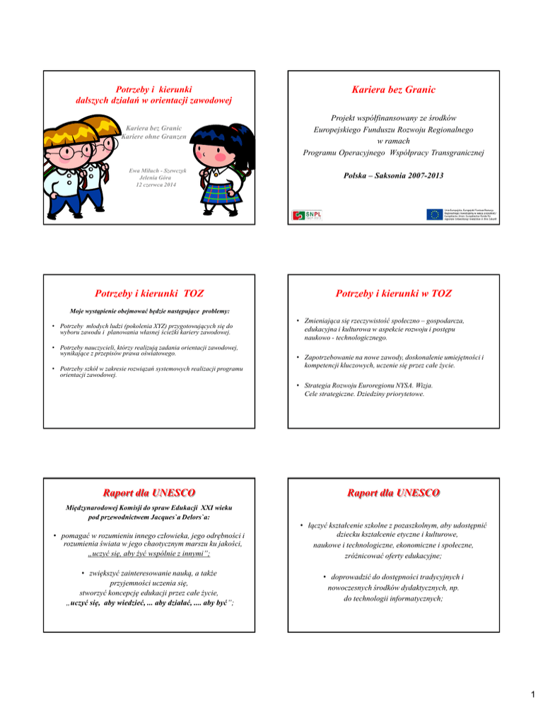 Potrzeby i kierunki dalszych działań w orientacji zawodowej Kariera bez Granic Kariere ohne Granzen Ewa Miłuch - Szewczyk Jelenia Góra 12 czerwca 2014 Potrzeby i kierunki TOZ Kariera bez Granic Projekt współfinansowany ze środków Europejskiego Funduszu Rozwoju Regionalnego w ramach Programu Operacyjnego Współpracy Transgranicznej Polska – Saksonia 2007-2013 Potrzeby i kierunki w TOZ Moje wystąpienie obejmować będzie następujące problemy: • Potrzeby młodych ludzi (pokolenia XYZ) przygotowujących się do wyboru zawodu i planowania własnej ścieżki kariery zawodowej. • Potrzeby nauczycieli, którzy realizują zadania orientacji zawodowej, wynikające z przepisów prawa oświatowego. • Potrzeby szkół w zakresie rozwiązań systemowych realizacji programu orientacji zawodowej. • Zmieniająca się rzeczywistość społeczno – gospodarcza, edukacyjna i kulturowa w aspekcie rozwoju i postępu naukowo - technologicznego. • Zapotrzebowanie na nowe zawody, doskonalenie umiejętności i kompetencji kluczowych, uczenie się przez całe życie. • Strategia Rozwoju Euroregionu NYSA. Wizja. Cele strategiczne. Dziedziny priorytetowe. Raport dla UNESCO Raport dla UNESCO Międzynarodowej Komisji do spraw Edukacji XXI wieku pod przewodnictwem Jacques`a Delors`a: • pomagać w rozumieniu innego człowieka, jego odrębności i rozumienia świata w jego chaotycznym marszu ku jakości, „uczyć się, aby żyć wspólnie z innymi”; • zwiększyć zainteresowanie nauką, a także przyjemności uczenia się, stworzyć koncepcję edukacji przez całe życie, „uczyć się, aby wiedzieć, ... aby działać, .... aby być”; • łączyć kształcenie szkolne z pozaszkolnym, aby udostępnić dziecku kształcenie etyczne i kulturowe, naukowe i technologiczne, ekonomiczne i społeczne, zróżnicować oferty edukacyjne; • doprowadzić do dostępności tradycyjnych i nowoczesnych środków dydaktycznych, np. do technologii informatycznych; 1 Raport dla UNESCO • nie wpływać na reformy edukacyjne z góry, ale pozyskać uczestnictwo społeczności lokalnych, rozsądnie decentralizować oświatę, co „sprzyja zwiększeniu odpowiedzialności i zdolności innowacyjnej każdej placówki szkolnej”; • wskazywać na trwałość takich wartości w edukacji, jak dostępność do niej, równość szans, wspomaganie młodych ludzi w rozwiązywaniu ich problemów dorastającego pokolenia; Pokolenie X Przedstawiciele pokolenia X to jednostki, które rozpoczęły swoją karierę w latach 90-tych. Cenią pracę jako wartość, bowiem zapewnia godny byt, rozszerza możliwości rozwoju indywidualnego i awansu społecznego, niejednokrotnie wygrywając w rankingu wartości z życiem osobistym. Indywidualny sukces = ciężka praca. Pokolenie Y Pokolenie Y Pojęcie Generacji Y jest relatywnie nowe, pierwszy raz pojawiło się w amerykańskim magazynie Advertising Age w 1993 roku, jako określenie ostatniej generacji, której przedstawiciele urodzili się w dwudziestym wieku. Generacja Y występuje nie tylko w krajach Ameryki Północnej, czy Europie Zachodniej. To zjawisko społeczne zostało dostrzeżone również w Polsce. Według danych GUS pokolenie Milenium stanowi aż 29% ludności Polski. Pokolenie Y, które wchodzi obecnie na rynek, nauczone doświadczeniem rodziców, sprzeciwia się takiej postawie. Pokolenie Y ma nieco inne aspiracje, cenią sobie równowagę między życiem osobistym, a zawodowym. Praca nie musi stanowić najważniejszy element ich życia. Dbają o swój rozwój w innym, szerszym kontekście, nie tylko zawodowym. Pokolenie Z Pokolenie Z Pokolenie Z, jest na szczycie piramidy społecznej, czyli osoby urodzone po 1996 roku. W okresie prenatalnym słuchały muzyki z iPoda czy iPhona, którą rodzice dostarczali im przy pomocy słuchawek. Od kołyski bawią się cybergadżetami, w przedszkolu stają się użytkownikami Internetu, a nawet blogerami. Jako kilkuletnie brzdące są doświadczonymi graczami gier komputerowych – grają na PC-tach, konsolach, komórkach... Pokolenie Z nie jest skłonne do wygłaszania manifestów i kroczenia w pochodach. Ich opinie są raczej wyważone „To, czym odznacza się pokolenie Z, nie wzięło się znikąd. Przecież nie urodziliśmy się tacy. To świat chce, abyśmy za nim nadążyli. Czym innym są te hashtagi (słowa lub krótkie wyrażenia poprzedzone znakiem "#„) jak nie przełożeniem na życie codzienne, tego wszystkiego, co wkładają nam do głowy w szkole? Tam nie uczą nas samodzielnego, kreatywnego myślenia, tylko używania haseł, słów "kluczy". Aleksandra Agata Leja-Werschner, Gazeta Wyborcza 2011. 2 Kompetencje kluczowe Kompetencje kluczowe Na kompetencje składają się: Kompetencje określają związek między naszymi indywidualnymi zdolnościami i cechami osobowości a cechami wymaganymi do sprawnego wykonywania zadań zawodowych (definicja Miedzynarodowej Organizacji Pracy) Planować, organizować i oceniać uczenie się. Dokonywać oceny swoich oczekiwań i potrzeb Skutecznie porozumiewać się językiem ojczystym Kompetencje kluczowe Uczestniczyć aktywnie w życiu społecznym Współpracować z grupą i pracować zespołowo. Pracować zadaniowo, metodą projektu Korzystać z różnych źródeł informacji Skutecznie komunikować się językiem obcym Odnosić do praktyki zdobytą wiedzę i umiejętności Rozwiązywać problemy w twórczy sposób Analizować i rozpoznawać sytuacje trudne Zarządzać swoimi zasobami i kompetencjami • Umiejętności – wszystko to, co potrafimy, co nabywamy w ciągu naszego życia, nasze zdolnosci i talent. • Wiedza - ogół informacji o otaczającej nas rzeczywistości wraz z umiejętnością ich wykorzystywania; • Kwalifikacje – formalne potwierdzenie nabytych umiejętności i wiedzy, a są to: dyplomy, certyfikaty, uprawnienia. • Cechy psychofizyczne - mogą być wrodzone lub nabyte, to: osobowość, inteligencja, odporność na stres, postawa, reakcje i z