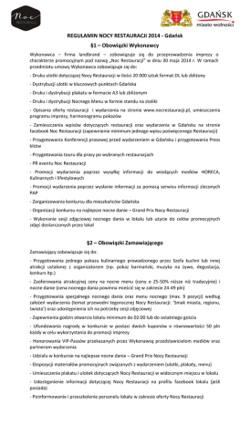 REGULAMIN NOCY RESTAURACJI 2014 - Gdańsk §1 – Obowiązki Wykonawcy Wykonawca – firma landbrand – zobowiązuje się do przeprowadzenia imprezy o charakterze promocyjnym pod nazwą „Noc Restauracji” w dniu 30 maja 2014 r. W ramach przedmiotu umowy Wykonawca zobowiązuje się do: - Druku ulotki dotyczącej Nocy Restauracji w ilości 20 000 sztuk format DL lub zbliżony - Dystrybucji ulotki w kluczowych punktach Gdańska - Druku i dystrybucji plakatu w formacie A3 lub zbliżonym - Druku i dystrybucji Nocnego Menu w formie standu na stoliki - Opisania oferty restauracji i wydarzenia na stronie www.nocrestauracji.pl, umieszczenia programu imprezy, harmonogramu pokazów - Zamieszczenia wpisów dotyczących restauracji oraz wydarzenia w Gdańsku na stronie facebook Noc Restauracji (zapewnienie minimum jednego wpisu poświęconego Restauracji) - Przygotowania Konferencji prasowej przed wydarzeniem w Gdańsku i przygotowania Press kitów - Przygotowania touru dla prasy po wybranych restauracjach - PR eventu Noc Restauracji - Promocji wydarzenia poprzez wysyłkę informacji do wiodących mediów HORECA, Kulinarnych i lifestylowych - Promocji wydarzenia poprzez wysłanie informacji za pomocą serwisu informacji zleconych PAP - Zorganizowania konkursu dla mieszkańców Gdańska - Organizacji konkursu na najlepsze nocne danie – Grand Prix Nocy Restauracji - Wykonanie sesji zdjęciowej nocnego dania w lokalu lub użycie do celów promocyjnych zdjęć dostarczonych przez lokal §2 – Obowiązki Zamawiającego Zamawiający zobowiązuje się do: - Przygotowania jednego pokazu kulinarnego prowadzonego przez Szefa kuchni lub innej atrakcji ustalonej z organizatorem (np. pokaz barmański, muzyka na żywo, degustacja, konkurs itp.) - Zaoferowania atrakcyjnej ceny na nocne menu (ceny o 25-50% niższe niż tradycyjnie) i nocne danie (cena nocnego dania powinna mieścić się w zakresie 24-49 pln) - Przygotowania specjalnego nocnego dania oraz menu nocnego (max. 9 pozycji) według założeń wydarzenia (temat przewodni tegorocznej Nocy Restauracji: ‘Smak miasta, regionu, świata’) oraz udostępnienia ich na potrzeby sesji zdjęciowej - Zapewnienia godzin otwarcia lokalu minimum do 02:00 lub do ostatniego gościa - Ufundowania nagrody w konkursie w postaci dwóch kuponów o równowartości 50 pln każdy w celu wykorzystania do promocji imprezy - Honorowania VIP-Passów przekazanych przez Wykonawcę przedstawicielom mediów oraz partnerom wydarzenia - Udziału w konkursie na najlepsze nocne danie – Grand Prix Nocy Restauracji - Ekspozycji materiałów promocyjnych związanych z wydarzeniem (ulotki, plakaty, menu) - Umieszczenia plakatu i ulotek dotyczących Nocy Restauracji w widocznym miejscu w lokalu - Udostępnienie informacji dotyczącej Nocy Restauracji na profilu facebook lokalu (jeśli posiada) - Poinformowanie i przeszkolenie personelu lokalu w zakresie oferty Nocy Restauracji