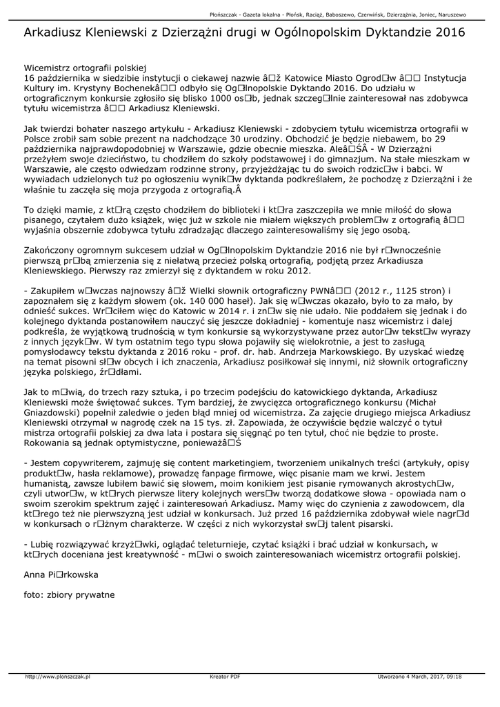 Płońszczak - Gazeta lokalna - Płońsk, Raciąż, Baboszewo, Czerwińsk, Dzierzążnia, Joniec, Naruszewo Arkadiusz Kleniewski z Dzierzążni drugi w Ogólnopolskim Dyktandzie 2016 Wicemistrz ortografii polskiej 16 października w siedzibie instytucji o ciekawej nazwie „Katowice Miasto OgrodÃłw – Instytucja Kultury im. Krystyny Bochenek― odbyło się OgÃłlnopolskie Dyktando 2016. Do udziału w ortograficznym konkursie zgłosiło się blisko 1000 osÃłb, jednak szczegÃłlnie zainteresował nas zdobywca tytułu wicemistrza – Arkadiusz Kleniewski. Jak twierdzi bohater naszego artykułu - Arkadiusz Kleniewski - zdobyciem tytułu wicemistrza ortografii w Polsce zrobił sam sobie prezent na nadchodzące 30 urodziny. Obchodzić je będzie niebawem, bo 29 października najprawdopodobniej w Warszawie, gdzie obecnie mieszka. Ale‌ - W Dzierzążni przeżyłem swoje dzieciństwo, tu chodziłem do szkoły podstawowej i do gimnazjum. Na stałe mieszkam w Warszawie, ale często odwiedzam rodzinne strony, przyjeżdżając tu do swoich rodzicÃłw i babci. W wywiadach udzielonych tuż po ogłoszeniu wynikÃłw dyktanda podkreślałem, że pochodzę z Dzierzążni i że właśnie tu zaczęła się moja przygoda z ortografią. To dzięki mamie, z ktÃłrą często chodziłem do biblioteki i ktÃłra zaszczepiła we mnie miłość do słowa pisanego, czytałem dużo książek, więc już w szkole nie miałem większych problemÃłw z ortografią – wyjaśnia obszernie zdobywca tytułu zdradzając dlaczego zainteresowaliśmy się jego osobą. Zakończony ogromnym sukcesem udział w OgÃłlnopolskim Dyktandzie 2016 nie był rÃłwnocześnie pierwszą prÃłbą zmierzenia się z niełatwą przecież polską ortografią, podjętą przez Arkadiusza Kleniewskiego. Pierwszy raz zmierzył się z dyktandem w roku 2012. - Zakupiłem wÃłwczas najnowszy „Wielki słownik ortograficzny PWN― (2012 r., 1125 stron) i zapoznałem się z każdym słowem (ok. 140 000 haseł). Jak się wÃłwczas okazało, było to za mało, by odnieść sukces. WrÃłciłem więc do Katowic w 2014 r. i znÃłw się nie udało. Nie poddałem się jednak i do kolejnego dyktanda postanowiłem nauczyć się jeszcze dokładniej - komentuje nasz wicemistrz i dalej podkreśla, że wyjątkową trudnością w tym konkursie są wykorzystywane przez autorÃłw tekstÃłw wyrazy z innych językÃłw. W tym ostatnim tego typu słowa pojawiły się wielokrotnie, a jest to zasługą pomysłodawcy tekstu dyktanda z 2016 roku - prof. dr. hab. Andrzeja Markowskiego. By uzyskać wiedzę na temat pisowni słÃłw obcych i ich znaczenia, Arkadiusz posiłkował się innymi, niż słownik ortograficzny języka polskiego, źrÃłdłami. Jak to mÃłwią, do trzech razy sztuka, i po trzecim podejściu do katowickiego dyktanda, Arkadiusz Kleniewski może świętować sukces. Tym bardziej, że zwycięzca ortograficznego konkursu (Michał Gniazdowski) popełnił zaledwie o jeden błąd mniej od wicemistrza. Za zajęcie drugiego miejsca Arkadiusz Kleniewski otrzymał w nagrodę czek na 15 tys. zł. Zapowiada, że oczywiście będzie walczyć o tytuł mistrza ortografii polskiej za dwa lata i postara się sięgnąć po ten tytuł, choć nie będzie to proste. Rokowania są jednak optymistyczne, ponieważâ€Ś - Jestem copywriterem, zajmuję się content marketingiem, tworzeniem unikalnych treści (artykuły, opisy produktÃłw, hasła reklamowe), prowadzę fanpage firmowe, więc pisanie mam we krwi. Jestem humanistą, zawsze lubiłem bawić się słowem, moim konikiem jest pisanie rymowanych akrostychÃłw, czyli utworÃłw, w ktÃłrych pierwsze litery kolejnych wersÃłw tworzą dodatkowe słowa - opowiada nam o swoim szerokim spektrum zajęć i zainteresowań Arkadiusz. Mamy więc do czynienia z zawodowcem, dla ktÃłrego też nie pierwszyzną jest udział w konkursach. Już przed 16 października zdobywał wiele nagrÃłd w konkursach o rÃłżnym charakterze. W części z nich wykorzystał swÃłj talent pisarski. - Lubię rozwiązywać krzyżÃłwki, oglądać teleturnieje, czytać książki i brać udział w konkursach, w ktÃłrych doceniana jest kreatywność - mÃłwi o swoich zainteresowaniach wicemistrz ortografii polskiej. Anna PiÃłrkowska foto: zbiory prywatne http://www.plonszczak.pl Kreator PDF Utworzono 4 March, 2017, 09:18