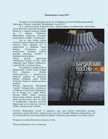 "Bardauskaja Vosień 2011" W dniach 21-23 października już po raz 18 odbędzie się Festiwal Białoruskiej Poezji Śpiewanej i Piosenki Autorskiej "Bardauskaja Vosień 2011". W 6 miejscowościach białostocczyzny zagrają najlepsi przedstawiciele białoruskiej poezji śpiewanej i piosenki autorskiej. Koncerty w ramach festiwalu odbędą się w Bielsku Podlaskim, Białymstoku, Hajnówce, Szczytach Dzięciołowie, Gródku i Teremiskach. Jak co roku ważną częścią festiwalu będzie konkurs dla młodych twórców, który odbędzie się 21 października w Bielskim Domu Kultury. Zwycięzców części konkursowej poznamy podczas koncertu galowego również w Bielskim Domu Kultury. Wśród gwiazd tegorocznej "Bardauskaj Vosieni" są min. znany białoruski bard Wiktar Szałkiewicz, zespół Re1ikt, czy Bosae Sonca. W niedzielę 23 października w Białostockim Teatrze Lalek wystąpi W-Z Orkiestra i Źmicier Wajciuszkiewicz z premierowym pokazem projektu na podstawie tekstów polskiego poety Rafała Wojaczka. Będzie to polska premiera projektu. Podczas tegorocznej "Bardauskaj Vosieni" wystąpią także wykonawcy z Podlasia, a wśród nich Aleh Kabzar, Ilo & friends, czy zespół RIMA. Koncert RIMY będzie premierą akustycznego albumu zespołu, który ukaże się pod koniec roku. W piątek 21 października widzowie festiwalu będą mogli po raz pierwszy usłyszeć RIMĘ w akustycznym wydaniu. Festiwal "Bardauskaja Vosień" to najstarszy tego typu festiwal białoruskiej piosenki autorskiej i poezji śpiewanej. Organizowany jest przez Związek Młodzieży Białoruskiej. Od lat na festiwalowej scenie prezentują się najlepsi wykonawcy prezentujący ten rodzaj muzyki. Wstęp na wszystkie festiwalowe koncerty wolny. Więcej informacji na www.vosien.org Program XVIII Festiwalu Białoruskiej Poezji Śpiewanej i Piosenki Autorskiej "Bardauskaja Vosień 2011" 21.10.2011 (piątek) 18:00 - 21:30 Bielski Dom Kultury (Bielsk Podlaski) Część Konkursowa Daryja Kadamskaja Źmicier Vajciuškievič Aleh Kabzar RIMA 22.10.2011 (sobota) 15:00 Szczyty-Dzięciołowo (Centrum Edukacji i Promocji Kultury Białoruskiej) Daryja Kadamskaja 15:00 Teremiski (Uniwersytet Powszechny) Jauhien Baryšnikau 18:00 - 21:30 Bielski Dom Kultury (Bielsk Podlaski) Koncert Laureatów Jauhien Baryšnikau Bosae Sonca Viktar Šalkievič Re1ikt 18:00 Gródek (Gminne Centrum Kultury) Źmicier Vajciuškievič 23.10.2011 (niedziela) 15:00 - 17:30 Białystok (Białostocki Teatr Lalek) Laureat Grand Prix ILO & Friends W-Z Orkiestra & Źmicier Vajciuškievič 18:00 Hajnówka (Muzeum i Ośrodek Kultury Białoruskiej) Re1ikt