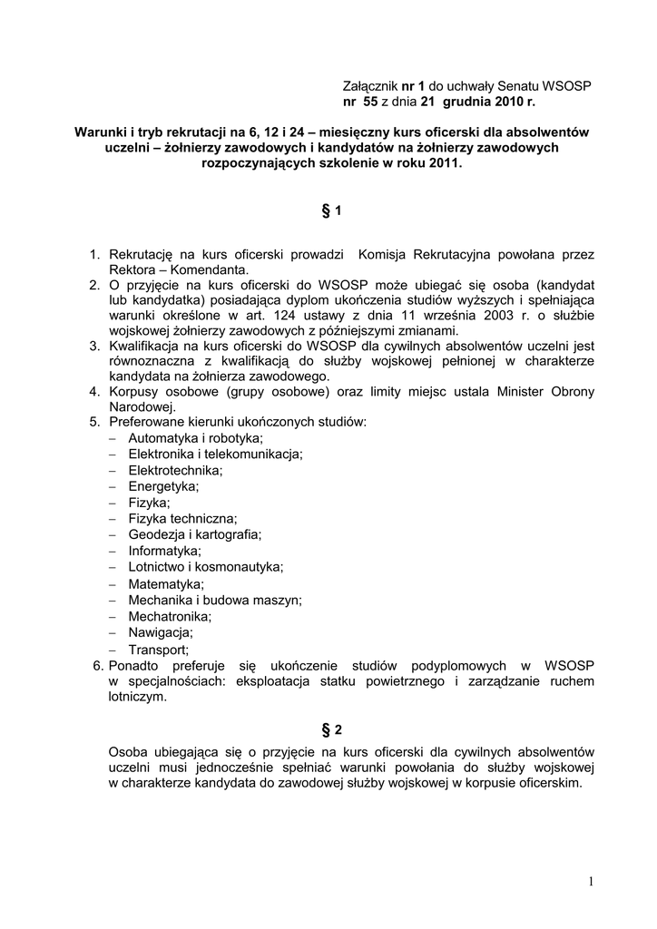 Załącznik nr 1 do uchwały Senatu WSOSP nr 55 z dnia 21 grudnia 2010 r. Warunki i tryb rekrutacji na 6, 12 i 24 – miesięczny kurs oficerski dla absolwentów uczelni – Ŝołnierzy zawodowych i kandydatów na Ŝołnierzy zawodowych rozpoczynających szkolenie w roku 2011. §1 1. Rekrutację na kurs oficerski prowadzi Komisja Rekrutacyjna powołana przez Rektora – Komendanta. 2. O przyjęcie na kurs oficerski do WSOSP moŜe ubiegać się osoba (kandydat lub kandydatka) posiadająca dyplom ukończenia studiów wyŜszych i spełniająca warunki określone w art. 124 ustawy z dnia 11 września 2003 r. o słuŜbie wojskowej Ŝołnierzy zawodowych z późniejszymi zmianami. 3. Kwalifikacja na kurs oficerski do WSOSP dla cywilnych absolwentów uczelni jest równoznaczna z kwalifikacją do słuŜby wojskowej pełnionej w charakterze kandydata na Ŝołnierza zawodowego. 4. Korpusy osobowe (grupy osobowe) oraz limity miejsc ustala Minister Obrony Narodowej. 5. Preferowane kierunki ukończonych studiów: − Automatyka i robotyka; − Elektronika i telekomunikacja; − Elektrotechnika; − Energetyka; − Fizyka; − Fizyka techniczna; − Geodezja i kartografia; − Informatyka; − Lotnictwo i kosmonautyka; − Matematyka; − Mechanika i budowa maszyn; − Mechatronika; − Nawigacja; − Transport; 6. Ponadto preferuje się ukończenie studiów podyplomowych w WSOSP w specjalnościach: eksploatacja statku powietrznego i zarządzanie ruchem lotniczym. §2 Osoba ubiegająca się o przyjęcie na kurs oficerski dla cywilnych absolwentów uczelni musi jednocześnie spełniać warunki powołania do słuŜby wojskowej w charakterze kandydata do zawodowej słuŜby wojskowej w korpusie oficerskim. 1 §3 1. Wymagane dokumenty: − wniosek o powołanie do słuŜby kandydackiej do Dyrektora Departamentu Kadr MON złoŜony poprzez Wojskową Komendę Uzupełnień zgodnie z Rozporządzeniem MON z dnia 12 marca 2010 roku w sprawie słuŜby wojskowej kandydatów na Ŝołnierzy zawodowych (Dz.U. Nr 61poz. 382 z dnia 14 kwietnia 2010 roku); − dyplom ukończenia studiów wyŜszych (dostarczony najpóźniej w dniu rozpoczęcia egzaminu); − Ŝyciorys (cv); − odpis skrócony aktu urodzenia; − zaświadczenie o niekaralności z Krajowego Rejestru Karnego; − potwierdzenie wniesienia opłaty rekrutacyjnej. 2. Dokumenty naleŜy składać do Dyrektora Departamentu Kadr MON poprzez Wojskową Komendę Uzupełnień w terminie określonym w decyzji MON o rekrutacji na 2011 rok. Dyplom ukończenia studiów wyŜszych lub zaświadczenie o ukończeniu studiów naleŜy dostarczyć najpóźniej w dniu stawienia się na postępowanie kwalifikacyjne. 3. Harmonogram postępowania rekrutacyjnego oraz wysokość opłaty rekrutacyjnej ustala Rektor - Komendant w swoim zarządzeniu uwzględniając zapisy stosownych rozporządzeń wydanych przez Ministra Obrony Narodowej. §4 1. Warunkiem dopuszczenia kandydata do postępowania kwalifikacyjnego jest pozytywny wynik specjalistycznych badań lekarskich, określający predyspozycje do podjęcia szkolenia w wybranej specjalności – w charakterze kandydata na Ŝołnierza zawodowego i uzyskanie odpowiednio grup zdrowia: − Z-1A – pilot samolotu odrzutowego (naddźwiękowego); − Z-1B – pilot samolotu odrzutowego (poddźwiękowego); − Z-1C – pilot samolotu transportowego, śmigłowca; − Z - III – pozostałe specjalności zgodnie z decyzją MON. 2. Badania lotniczo – lekarskie dla kandydatów na specjalność pilotaŜ przebiegają w trzech etapach: − etap I – badania w Terenowej Wojskowej Komisji Lekarskiej i Pracowni Psychologicznej orzekające o zdolności do zawodowej słuŜby wojskowej, − etap II – badania specjalistyczne w Wojskowej Komisji Lotniczo – Lekarskiej (WKLL) w Dęblinie. Badania trwają trzy dni. Szkoła zapewnia odpłatnie zakwaterowanie i wyŜywienie. Kandydaci uznani przez WKLL w Dęblinie za zdolnych do słuŜby wojskowej w powietrzu kierowani są na dodatkowe badania specjalistyczne do Wojskowego Instytutu Medycyny Lotniczej (WIML) w Warszawie, − etap III – badania specjalistyczne w Wojskowym Instytucie Medycyny Lotniczej w Warszawie. 3. Kandydaci na specjalności naziemne kończą badania lekarskie na II etapie. 2 §5 1. Zasady naliczania punktów kwalifikacyjnych. Tabela 1. Ocena kandydata 1. 2. 3. 4. 5. 6. – 4 pkt. dostateczna dobra – 8 pkt. Ogólna ocena ukończenia bardzo dobra – 12 pkt. studiów dyplom z wyróŜnieniem – 16 pkt. Zgodność ukończonego kierunku studiów Niezgodność – 0 pkt. Ocena z preferowanymi kwalifikacji kierunkami Zgodność – 20 pkt. na podstawie i specjalnościami dyplomu Ocenia wymienionymi w §1 ust 5 ukończenia Komisja Ukończenie studiów uczelni Kwalifikacyjna podyplomowych w wyŜszej 10 – pkt. WSOSP zgodnie z § 1 ust.6 Kandydat moŜe uzyskać maksymalnie 30 pkt. 1. licencja pilota samolotowego Na podstawie (turystycznego) – 25 pkt. ksiąŜki lotów 2. nalot na samolotach: uwzględnia się do 10 godz. – 5 pkt. Udokumentowane doświadczenie sumę od 10 do 20 godz. (wylot lotnicze* wszystkich samodzielny – 15 pkt. elementów 3. szybowce III klasa – 5 pkt. doświadczenia licencja – 10 pkt. lotniczego skoki ze spadochronem – (max.40 pkt.) ilość skoków x 0,5 pkt. jednak nie więcej niŜ 5 pkt. Egzamin z języka angielskiego na min – 16,8 max – 24 pkt poziomie STANAG 6001 (2222) pfw – liczba punktów uzyskanych w teście ze sprawności fizycznej Testy sprawności fizycznej min – 6 pkt. max. – 24 pkt. (Tabela 2) Negatywny wynik rozmowy Ocenia kwalifikacyjnej – 0 pkt. Rozmowa kwalifikacyjna Komisja Pozytywny wynik rozmowy Kwalifikacyjna kwalifikacyjnej od 1 do 10 pkt. *- dotyczy specjalności pilotaŜ samolotu i śmigłowca. 2. W procesie kwalifikowania stosowany jest punktowy system przeliczania poszczególnych elementów składowych postępowania kwalifikacyjnego – kaŜdy z odpowiednią, przypisaną mu, maksymalną wagą punktową. 3 Wskaźnik kwalifikacy