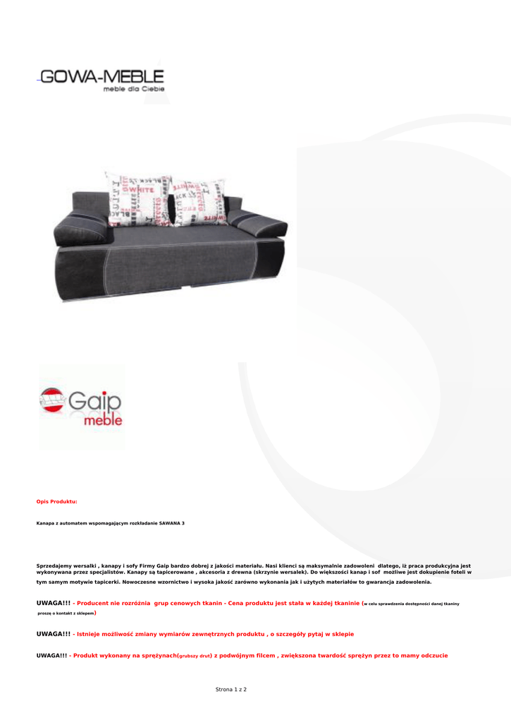 Opis Produktu: Kanapa z automatem wspomagającym rozkładanie SAWANA 3 Sprzedajemy wersalki , kanapy i sofy Firmy Gaip bardzo dobrej z jakości materiału. Nasi klienci są maksymalnie zadowoleni dlatego, iż praca produkcyjna jest wykonywana przez specjalistów. Kanapy są tapicerowane , akcesoria z drewna (skrzynie wersalek). Do większości kanap i sof możliwe jest dokupienie foteli w tym samym motywie tapicerki. Nowoczesne wzornictwo i wysoka jakość zarówno wykonania jak i użytych materiałów to gwarancja zadowolenia. UWAGA!!! - Producent nie rozróżnia grup cenowych tkanin - Cena produktu jest stała w każdej tkaninie (w celu sprawdzenia dostępności danej tkaniny proszę o kontakt z sklepem) UWAGA!!! - Istnieje możliwość zmiany wymiarów zewnętrznych produktu , o szczegóły pytaj w sklepie UWAGA!!! - Produkt wykonany na sprężynach(grubszy drut) z podwójnym filcem , zwiększona twardość sprężyn przez to mamy odczucie Strona 1 z 2 sztywności. Wymiary (głę./wys./dł.) : 90/85/197 Kolorystyka : Do wyboru Powierzchnia spania : 140x197 Mebel posiada: funkcje spania schowek - AUTOMAT WSPOMAGAJĄCY OTWIERANIE sprężyny Bonell Producent zapewnia: wykonanie mebli w różnych barwach tkanin lub skóry ekologicznej dopasowanie wymiarów do Państwa potrzeb Produkt fabrycznie nowy . GWARANCJA 24 MIESIĘCY!!! Pamiętaj by podczas składania zamówienia w polu "informacje dodatkowe" podać kolorystykę mebli i tapicerek zakupionych produktów. Kolory mogą różnić się od prezentowanych przez monitor, w szczególności typu LCD Strona 2 z 2
