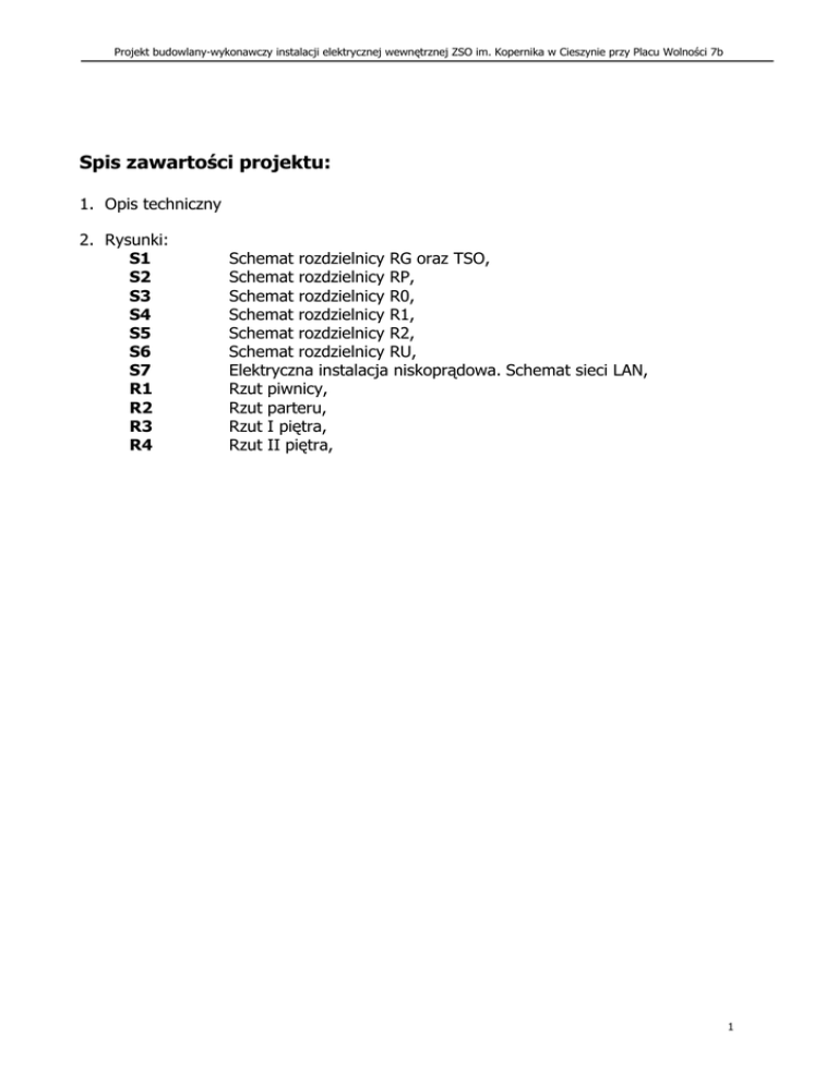Projekt budowlany-wykonawczy instalacji elektrycznej wewnętrznej ZSO im. Kopernika w Cieszynie przy Placu Wolności 7b Spis zawartości projektu: 1. Opis techniczny 2. Rysunki: S1 S2 S3 S4 S5 S6 S7 R1 R2 R3 R4 Schemat rozdzielnicy RG oraz TSO, Schemat rozdzielnicy RP, Schemat rozdzielnicy R0, Schemat rozdzielnicy R1, Schemat rozdzielnicy R2, Schemat rozdzielnicy RU, Elektryczna instalacja niskoprądowa. Schemat sieci LAN, Rzut piwnicy, Rzut parteru, Rzut I piętra, Rzut II piętra, 1 Projekt budowlany-wykonawczy instalacji elektrycznej wewnętrznej ZSO im. Kopernika w Cieszynie przy Placu Wolności 7b Spis treści opisu technicznego 1 2 Przedmiot opracowania..................................................................................................... 3 Zakres opracowania ......................................................................................................... 3 2.1 Instalacje i sieci elektryczne zewnętrzne ...................................................................... 3 2.2 Instalacje elektryczne wewnętrzne .............................................................................. 3 2.3 Podstawa opracowania .............................................................................................. 3 3 Stan istniejący ................................................................................................................. 4 4 Projektowane rozwiązania ................................................................................................. 4 4.1 DemontaŜe ............................................................................................................... 4 4.2 Zasilanie obiektu i bilans mocy obiektu ........................................................................ 5 4.3 Wyłącznik poŜarowy, wyłącznik główny ....................................................................... 5 4.4 Rozdzielnica główna, podrozdzielnice .......................................................................... 6 4.5 Gniazda elektryczne wysoko-prądowe i nisko-prądowe.................................................. 6 4.6 Instalacja niskoprądowa – sieć strukturalna LAN .......................................................... 7 4.7 Oświetlenie elektryczne .............................................................................................. 7 4.7.1 Oświetlenie podstawowe ..................................................................................... 7 4.7.2 Oświetlenie nocne ............................................................................................... 8 4.7.3 Oświetlenie ewakuacyjne. .................................................................................... 8 4.7.4 Oświetlenie zapasowe. ........................................................................................ 8 4.7.5 Oprawy oświetleniowe uŜyte w projekcie .............................................................. 9 4.8 Ochrona przeciwporaŜeniowa ..................................................................................... 9 4.9 Ochrona przeciwprzepięciowa ..................................................................................... 9 4.10 Ochrona odgromowa ............................................................................................... 10 4.11 Uziom ..................................................................................................................... 10 2 Projekt budowlany-wykonawczy instalacji elektrycznej wewnętrznej ZSO im. Kopernika w Cieszynie przy Placu Wolności 7b 1 Przedmiot opracowania Przedmiotem opracowania jest Projekt budowlany-wykonawczy remontu elektrycznej wewnętrznej ZSO im. Kopernika w Cieszynie przy Placu Wolności 7b. 2 2.1 instalacji Zakres opracowania Instalacje i sieci elektryczne zewnętrzne W zakresie opracowania instalacji i sieci elektrycznych zewnętrznych jest podłączenie istniejącego obwodu rogatki - szlabanu, która zasilana jest obecnie z obwodów gniazdowych pomieszczenia 17. Do podłączenia rogatki - szlabanu zostanie wykorzystany istniejący kabel ziemny, obecnie zasilany z obwodów gniazdowych. Kabel naleŜy wypiąć z obwodów gniazdowych i połączyć z projektowanym obwodem, zasilanym z rozdzielnicy RG. Połączenia kabla i projektowanego przewodu naleŜy dokonać w puszcze podtynkowej. 2.2 Instalacje elektryczne wewnętrzne W zakresie opracowania instalacji elektrycznych budynku są: • usunięcie opraw oświetleniowych w pomieszczeniach podlegających remontowi, • usunięcie gniazd i łączników elektrycznych w pomieszczeniach podlegających remontowi, • usunięcie przewodów obwodów ulegających likwidacji, które były wykonane jako natynkowe, • unieczynnienie przewodów obwodów ulegających likwidacji, które były wykonane jako podtynkowe, • usunięcie rozdzielnic elektrycznych istniejących: rozdzielnica główna, rozdzielnice poszczególnych kondygnacji (z wyłączeniem rozdzielnic poddasza i rozdzielnic sal komputerowych), rozdzielnice WC, • wymiana wlz zasilającego obiekt, • nowa rozdzielnica główna RG wraz z obwodami z niej zasilanymi oraz TSO (sterowanie oświetleniem), • nowa rozdzielnica RP (piwnica) wraz z obwodami z niej zasilanymi, • nowa rozdzielnica R0 (parter) wraz z obwodami z niej zasilanymi, • nowa rozdzielnica R1 (I piętro) wraz z obwodami z niej zasilanymi, • nowa rozdzielnica R2 (II piętro) wraz z obwodami z niej zasilanymi, • nowa rozdzielnica RU (usługi- pom. 102) wraz z obwodami z niej zasilanymi, • nowe lampy oświetleniowe we wszystkich pomieszczeniach i ciągach komunikacyjnych, z wyjątkiem pomieszczeń wyłączonych z remontu, • nowe gniazda i łączniki elektryczne we wszystkich pomieszczeniach i ciągach komunikacyjnych, z wyjątkiem pomieszczeń wyłączonych z remontu, • nowa instalacja elektryczna niskoprądowa – sieć okablowania strukturalnego LAN. 2.3 Podstawa opracowania Podstawę opracowania stanowią: ● zlecenie i wytyczn