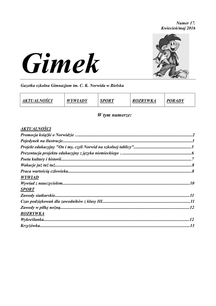 Numer 17. Kwiecień/maj 2016 Gimek Gazetka szkolna Gimnazjum im. C. K. Norwida w Bielsku AKTUALNOŚCI WYWIADY SPORT ROZRYWKA PORADY W tym numerze: AKTUALNOŚCI Promocja książki o Norwidzie …........................................................................................................2 Pojedynek na ilustracje.......................................................................................................................3 Projekt edukacyjny "On i my, czyli Norwid na szkolnej tablicy".....................................................5 Prezentacja projektu edukacyjny z języka niemieckiego …..............................................................6 Poeta kultury i historii........................................................................................................................7 Wakacje już tuż tuż..............................................................................................................................8 Praca wartością człowieka..................................................................................................................8 WYWIAD Wywiad z nauczycielem.....................................................................................................................10 SPORT Zawody siatkarskie............................................................................................................................11 Czas podziękowań dla zawodników z klasy III.................................................................................11 Zawody w piłkę nożną.......................................................................................................................12 ROZRYWKA Wykreślanka......................................................................................................................................12 Krzyżówka..........................................................................................................................................13 ►AKTUALNOŚCI Promocja książki o Norwidzie W czwartek 21 kwietnia 2016r. w Towarzystwie Naukowym Płockim, mieszczącym się przy placu Narutowicza 8 w Płocku, odbyło się spotkanie promocyjne książki Szkolne modele recepcji twórczości Cypriana Norwida do 2010 roku autorstwa Pani dr Wioletty Żórawskiej. Uczestniczyła w nim liczna grupa zaproszonych gości oraz uczniowie Gimnazjum im. Cypriana Kamila Norwida w Bielsku wraz z rodzicami. Słowo wstępne wygłosiła Pani prof. dr hab. Daniela Żuk, członek zarządu TNP. Pani profesor podziękowała Pani dr Wiolettcie Żórawskiej za trud podjęcia się badania recepcji twórczości Norwida. Następnie głos zabrała Pani dr Wioletta Żórawska. W swoim wystąpieniu omówiła główne zagadnienia utworu. Zaznaczyła, że książka jest nieco zmienioną wersją rozprawy doktorskiej, która powstała i obroniona została na wydziale Nauk Humanistycznych Uniwersytetu Kardynała Stefana Wyszyńskiego w Warszawie. Dyskusję panelową rozpoczął ks. prof. dr hab. Ireneusz Mroczkowski, który podkreślił, że poezja Norwida jest trudna do zrozumienia dla młodzieży, dlatego jest wdzięczny autorce, że podjęła się badań i opisu tego tematu. Na zakończenie głos zabrała Pani Dyrektor naszego Gimnazjum Pani Ewa Warabida, która stwierdziła, że Norwid żyje w naszym Gimnazjum. Podczas spotkania były wyświetlane slajdy z nazwiskiem oraz funkcją występującej osoby. Spotkanie uświetnili recytacją wierszy uczniowie klasy 3a: Jakub Olszewski i Sara Cieplik oraz absolwentka gimnazjum Dominika Żaczek, która zaśpiewała wiersz Norwida "Bema pamięci żałobny- rapsod". Były kwiaty, gratulacje oraz kolejka osób proszących o podpis z dedykacją. Krzysztof Kamiński Klasa IIB Gimek Nr 16 Styczeń/Luty 2016 2 1 Pojedynek na ilustracje W ramach projektu edukacyjnego "Ilustracje do lektur gimnazjalnych" grupa projektowa z klasy 2b ogłosiła konkurs plastyczny o zasięgu szkolnym. Uczniowie mieli za zadanie zilustrować w dowolnej technice dowolną lekturę omawianą w gimnazjum. Prace uczniów gimnazjum gromadzono w pracowni języka polskiego od listopada 2015 r. do końca lutego 2016r. W marcu br. powstała wystawa 22 prac plastycznych. Ilustracje oznaczone były numerami. W dniu 22 marca odbyło się głosowanie publiczności tzn. wszystkich uczniów gimnazjum na najlepszą pracę plastyczną. Oceny prac dokonała także komisja konkursowa w składzie: 1. Dyrektor gimnazjum Pani Ewa Warabida. 2. Opiekunka projektu edukacyjnego Pani dr Wioletta Żórawska. 3. Nauczyciel muzyki Pan Jarosław Miszewski. Po głosowaniu grupa projektowa szybko zliczyła i opublikowała wyniki głosowania, które wyglądały następująco: I miejsce – 47 głosów uzyskała praca nr 2 autorstwa Krzysztofa Kamińskiego ucznia klasy 2b. II miejsce – 36 głosów uzyskała praca nr 10 wykonana przez Wiktorię Rogowską uczennicę klasy 3c. III miejsce – 24 głosy uzyskała praca nr 8 w wykonaniu Patrycji Bilickiej uczennicy Gimek Nr 16 Styczeń/Luty 2016 3 1 klasy 3a. Następnie swoje wyniki ogłosiła komisja konkursowa I i III miejsce pokrywało się z werdyktem publiczności. Natomiast II miejsce komisja przyznała Alicji Zyzner uczennicy klasy 1d. Dyplomy reprodukcjami grafik profesora Alojzego Balcerzaka z książki "Bielski Norwid" autorstwa Pani dr Wioletty Żórawskiej zaprojektowane przez Łukasza Fabrykiewicza z klasy 2b otrzymali wszyscy uczestnicy konkursu. Był to ciekawy i fajny pomysł. Alicja Zyner ( autorka pracy) Z legend dawnego Egiptu B. Prusa Autor: Krzysztof Kamiński klasa II B Grupa projektowa Uczniowie klasy II B : Brudzyńska Oliwia, Chabowska Karolina, Dumowska Alicja, Fabrykiewicz Łukasz, Pietrzak Natalia, Pijanowska Karolina, Pijanowska Karolina (Kaja), Szymborski Przemysław, Żórawska Karolina Opiekun projektu Pani Wioletta Żórawska Alicja Dumowska ( autorka pracy wyróżnionej) „Dziady” cz. II A. Mickiewicza. Patrycja Bilicka z ilustracją