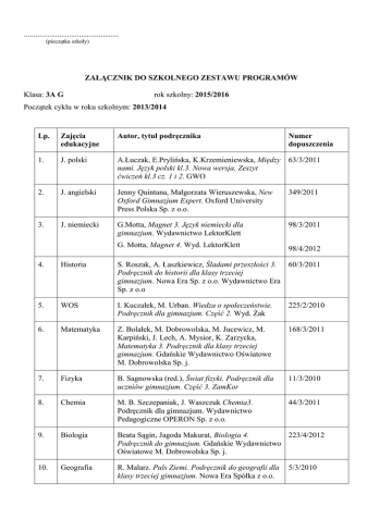................................................ (pieczątka szkoły) ZAŁĄCZNIK DO SZKOLNEGO ZESTAWU PROGRAMÓW Klasa: 3A G rok szkolny: 2015/2016 Początek cyklu w roku szkolnym: 2013/2014 Lp. Zajęcia edukacyjne Autor, tytuł podręcznika Numer dopuszczenia 1. J. polski A.Łuczak, E.Prylińska, K.Krzemieniewska, Między nami. Język polski kl.3. Nowa wersja, Zeszyt ćwiczeń kl.3 cz. 1 i 2. GWO 63/3/2011 2. J. angielski Jenny Quintana, Małgorzata Wieruszewska, New Oxford Gimnazjum Expert. Oxford University Press Polska Sp. z o.o. 349/2011 3. J. niemiecki G.Motta, Magnet 3. Język niemiecki dla gimnazjum. Wydawnictwo LektorKlett 98/3/2011 G. Motta, Magnet 4. Wyd. LektorKlett 98/4/2012 4. Historia S. Roszak, A. Łaszkiewicz, Śladami przeszłości 3. Podręcznik do historii dla klasy trzeciej gimnazjum. Nowa Era Sp. z o.o. Wydawnictwo Era Sp. z o.o 60/3/2011 5. WOS I. Kuczałek, M. Urban. Wiedza o społeczeństwie. Podręcznik dla gimnazjum. Część 2. Wyd. Żak 225/2/2010 6. Matematyka Z. Bolałek, M. Dobrowolska, M. Jucewicz, M. Karpiński, J. Lech, A. Mysior, K. Zarzycka, Matematyka 3. Podręcznik dla klasy trzeciej gimnazjum. Gdańskie Wydawnictwo Oświatowe M. Dobrowolska Sp. j. 168/3/2011 7. Fizyka B. Sagnowska (red.), Świat fizyki. Podręcznik dla uczniów gimnazjum. Część 3. ZamKor 11/3/2010 8. Chemia M. B. Szczepaniak, J. Waszczuk Chemia3. Podręcznik dla gimnazjum. Wydawnictwo Pedagogiczne OPERON Sp. z o.o. 44/3/2011 9. Biologia Beata Sągin, Jagoda Makurat, Biologia 4. 223/4/2012 Podręcznik do gimnazjum. Gdańskie Wydawnictwo Oświatowe M. Dobrowolska Sp. j. 10. Geografia R. Malarz. Puls Ziemi. Podręcznik do geografii dla klasy trzeciej gimnazjum. Nowa Era Spółka z o.o. 5/3/2010 11. Muzyka Wacław Panek, Świat muzyki. Podręcznik dla gimnazjum. Wydawnictwa Szkolne i Pedagogiczne Sp. z o.o. 81/2009 12. Plastyka L. Frydzińska, B. Marcinkowska, Kraina sztuki. Podręcznik do plastyki dla gimnazjum. Wyd. Szk. PWN 154/2009 13. Edukacja dla J. Słoma, G. Zając, Żyję i działam bezpiecznie, bezpieczeństwa Podręcznik z ćwiczeniami dla kl. 1-3 gimnazjum. Nowa Era Spółka z o.o. 14. W-f Brak podręcznika - 15 Religia J. Szpet, Jackowiak D. Żyć w miłości Boga, Księgarnia Św. Wojciecha AZ-33-01/10PO-3/13 17/2009 Uczeń obowiązany jest posiadać wyposażenie szkolne: zeszyty, materiały piśmienne, kalkulator, przyrządy geometryczne itp. Na zajęciach z wychowania fizycznego obowiązuje strój sportowy: spodenki gimnastyczne, koszulka, obuwie sportowe inne na salę gimnastyczną i na boisko, skarpetki oraz dres. Zalecane jest korzystanie przez ucznia z pomocy dydaktycznych poszerzających wiedzę z danego przedmiotu, na przykład zbiory zadań, zeszyty ćwiczeń, słowniki, atlasy itp, wskazane przez uczących nauczycieli. .................................................................. (data, pieczęć i podpis dyrektora szkoły)