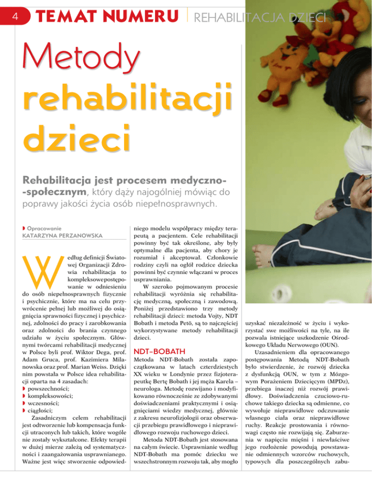 4 TEMAT NUMERU rehabilitacja dzieci Metody rehabilitacji dzieci Rehabilitacja jest procesem medyczno-społecznym, który dąży najogólniej mówiąc do poprawy jakości życia osób niepełnosprawnych. » Opracowanie Katarzyna Perzanowska W edług definicji Światowej Organizacji Zdrowia rehabilitacja to kompleksowe postępowanie w odniesieniu do osób niepełnosprawnych fizycznie i psychicznie, które ma na celu przywrócenie pełnej lub możliwej do osiągnięcia sprawności fizycznej i psychicznej, zdolności do pracy i zarobkowania oraz zdolności do brania czynnego udziału w życiu społecznym. Głównymi twórcami rehabilitacji medycznej w Polsce byli prof. Wiktor Dega, prof. Adam Gruca, prof. Kazimiera Milanowska oraz prof. Marian Weiss. Dzięki nim powstała w Polsce idea rehabilitacji oparta na 4 zasadach: powszechności; kompleksowości; wczesności; ciągłości; Zasadniczym celem rehabilitacji jest odtworzenie lub kompensacja funkcji utraconych lub takich, które wogóle nie zostały wykształcone. Efekty terapii w dużej mierze zależą od systematyczności i zaangażowania usprawnianego. Ważne jest więc stworzenie odpowied- niego modelu współpracy między terapeutą a pacjentem. Cele rehabilitacji powinny być tak określone, aby były optymalne dla pacjenta, aby chory je rozumiał i akceptował. Członkowie rodziny czyli na ogłół rodzice dziecka powinni być czynnie włączani w proces usprawniania. W szeroko pojmowanym procesie rehabilitacji wyróżnia się rehabilitację medyczną, społeczną i zawodową. Poniżej przedstawiono trzy metody rehabilitacji dzieci: metoda Vojty, NDT Bobath i metoda Petö, są to najczęściej wykorzystywane metody rehabilitacji dzieci. NDT-Bobath Metoda NDT-Bobath została zapoczątkowana w latach czterdziestych XX wieku w Londynie przez fizjoterapeutkę Bertę Bobath i jej męża Karela – neurologa. Metodę rozwijano i modyfikowano równocześnie ze zdobywanymi doświadczeniami praktycznymi i osiągnięciami wiedzy medycznej, głównie z zakresu neurofizjologii oraz obserwacji przebiegu prawidłowego i nieprawidłowego rozwoju ruchowego dzieci. Metoda NDT-Bobath jest stosowana na całym świecie. Usprawnianie według NDT-Bobath ma pomóc dziecku we wszechstronnym rozwoju tak, aby mogło uzyskać niezależność w życiu i wykorzystać swe możliwości na tyle, na ile pozwala istniejące uszkodzenie Ośrodkowego Układu Nerwowego (OUN). Uzasadnieniem dla opracowanego postępowania Metodą NDT-Bobath było stwierdzenie, że rozwój dziecka z dysfunkcją OUN, w tym z Mózgowym Porażeniem Dziecięcym (MPDz), przebiega inaczej niż rozwój prawidłowy. Doświadczenia czuciowo-ruchowe takiego dziecka są odmienne, co wywołuje nieprawidłowe odczuwanie własnego ciała oraz nieprawidłowe ruchy. Reakcje prostowania i równowagi często nie rozwijają się. Zaburzenia w napięciu mięśni i niewłaściwe jego rozłożenie powodują powstawanie odmiennych wzorców ruchowych, typowych dla poszczególnych zabu- rehabilitacja dzieci TEMAT NUMERU rzeń. Pierwsze nieprawidłowe objawy dotyczą zwykle kontroli głowy i tułowia. Następnie rozwijają się nieprawidłowe ruchy w dystalnych częściach ciała. Dominują wzorce zgięciowe i wyprostne, a rozwój ruchów rotacyjnycch jest znacznie upośledzony. W związku z powyższym główne zasady usprawniania według koncepcji NDT-Bobath obejmują: wpływanie na napięcie mięśni poprzez obniżanie napięcia wzmożonego i podwyższanie obniżonego, hamowanie nieprawidłowych odruchów oraz wyzwalanie ruchów w formie najbardziej jak to jest tylko możliwe zbliżonej do prawidłowych, co zostaje osiągnięte poprzez wspomaganie i prowadzenie ruchu z punktów kluczowych, czyli punktów kon- troli ruchu, którymi są: głowa,obręcz barkowa , obręcz miedniczna i inne części ciała, oraz wykorzystywanie i utrwalanie zdobytych umiejętności ruchowych w codziennych czynnościach. Terapeuta ćwiczy całe ciało dziecka, a nie porusza wybranymi kończynami. Dzięki temu dostarcza odpowiednich doznań czuciowych i ruchowych, a dziecko jest dynamicznie aktywizowane. Pomoc przy wykonywaniu ruchu powinna być taka, aby zapewniała maksymalny i aktywny udział dziecka, a jednocześnie nie wywoływała nieprawidłowych odpowiedzi wynikających ze zbyt dużego wysiłku czy stresu. Każdy ruch jest odpowiednio przygotowywany i połączony z przemieszczaniem ciężaru ciała i środka ciężkości. Rodzaj, tempo i rytm ćwiczeń dobiera się indywidualnie. Podczas ćwiczeń dziecko nie powinno płakać, gdyż płacz zmniejsza skuteczność działań terapeutycznych oraz powinno mieć zapewnione pełne poczucie bezpieczeństwa, co warunkuje osiągnięcie współpracy i akceptacji z prowadzącym ćwiczenia. Mimo, że zajęcia prowadzi się najczęściej indywidualnie, ich celem jest zawsze przygotowanie dziecka do uczestniczenia w normalnym życiu rodzinnym i społecznym. To indywidualne podejście daje możliwość uwzględnienia potrzeb psychologicznych dziecka, stopnia jego sprawności, występujących zaburzeń, warunków rodzinnych i środowiskowych. Jak już było wspomniane, usprawnianie według koncepcji NDT-Bobath 5 6 TEMAT NUMERU rehabilitacja dzieci jest szczególnie przydatne w leczeniu niemowląt i dzieci, ponieważ może być łatwo włączone w ich biologiczny rytm dnia. Prawidłowo wykonywane zabiegi pielęgnacyjne, karmienie, noszenie dziecka, czy zabawa z nim są odpowiednimi momentami do utrwalania ruchów ćwiczonych przez fizjoterapeutę. Odpowiednio przeszkoleni rodzice i opiekunowie, którzy zrozumieją problemy i trudności występujące u ich dziecka kontynuują ćwiczenia w warunkach domowych. Za szkolenie rodziców odpowiedzialny jest lekarz prowadzący i fizjoterapeuta. Metoda Vojty Terapia metodą Vojty ma zastosowanie w terapii noworodków dzieci młodzieży i dorosłych. Kluczem do zrozumienia metody vojty są wrodzone wzorce ruchowe. Są one zakodowane genetycznie, dostępne