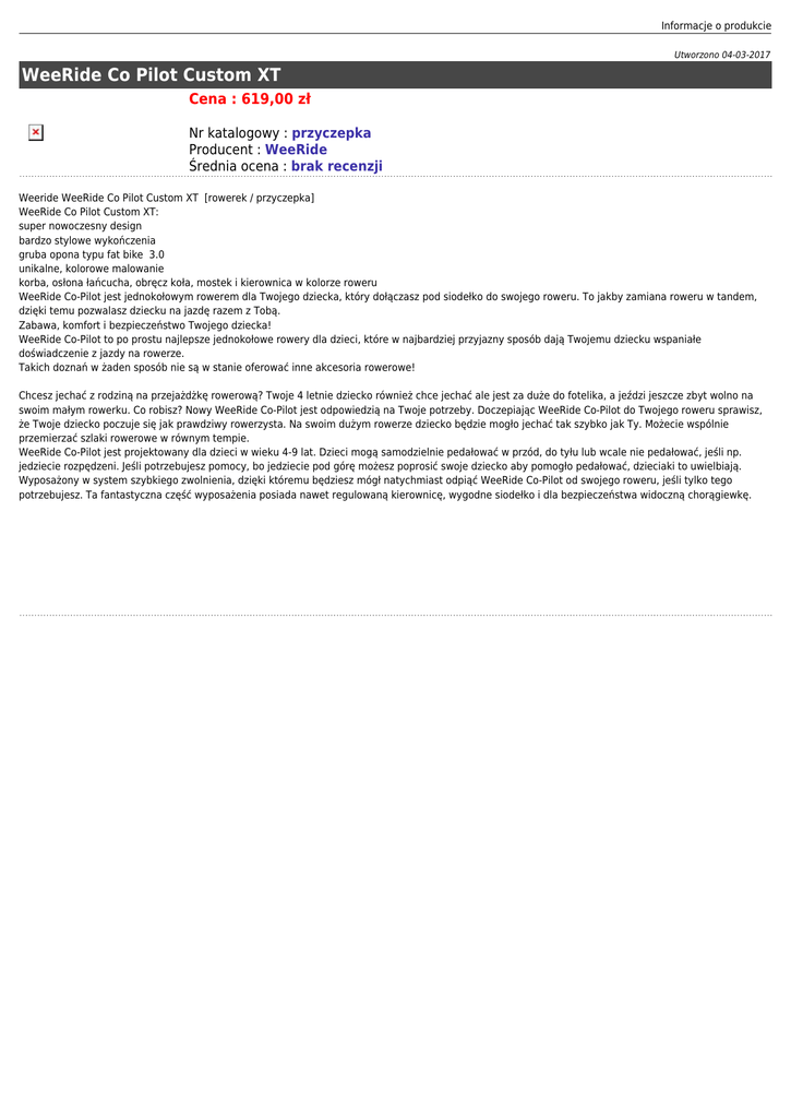 Informacje o produkcie Utworzono 04-03-2017 WeeRide Co Pilot Custom XT Cena : 619,00 zł Nr katalogowy : przyczepka Producent : WeeRide Średnia ocena : brak recenzji Weeride WeeRide Co Pilot Custom XT [rowerek / przyczepka] WeeRide Co Pilot Custom XT: super nowoczesny design bardzo stylowe wykończenia gruba opona typu fat bike 3.0 unikalne, kolorowe malowanie korba, osłona łańcucha, obręcz koła, mostek i kierownica w kolorze roweru WeeRide Co-Pilot jest jednokołowym rowerem dla Twojego dziecka, który dołączasz pod siodełko do swojego roweru. To jakby zamiana roweru w tandem, dzięki temu pozwalasz dziecku na jazdę razem z Tobą. Zabawa, komfort i bezpieczeństwo Twojego dziecka! WeeRide Co-Pilot to po prostu najlepsze jednokołowe rowery dla dzieci, które w najbardziej przyjazny sposób dają Twojemu dziecku wspaniałe doświadczenie z jazdy na rowerze. Takich doznań w żaden sposób nie są w stanie oferować inne akcesoria rowerowe! Chcesz jechać z rodziną na przejażdżkę rowerową? Twoje 4 letnie dziecko również chce jechać ale jest za duże do fotelika, a jeździ jeszcze zbyt wolno na swoim małym rowerku. Co robisz? Nowy WeeRide Co-Pilot jest odpowiedzią na Twoje potrzeby. Doczepiając WeeRide Co-Pilot do Twojego roweru sprawisz, że Twoje dziecko poczuje się jak prawdziwy rowerzysta. Na swoim dużym rowerze dziecko będzie mogło jechać tak szybko jak Ty. Możecie wspólnie przemierzać szlaki rowerowe w równym tempie. WeeRide Co-Pilot jest projektowany dla dzieci w wieku 4-9 lat. Dzieci mogą samodzielnie pedałować w przód, do tyłu lub wcale nie pedałować, jeśli np. jedziecie rozpędzeni. Jeśli potrzebujesz pomocy, bo jedziecie pod górę możesz poprosić swoje dziecko aby pomogło pedałować, dzieciaki to uwielbiają. Wyposażony w system szybkiego zwolnienia, dzięki któremu będziesz mógł natychmiast odpiąć WeeRide Co-Pilot od swojego roweru, jeśli tylko tego potrzebujesz. Ta fantastyczna część wyposażenia posiada nawet regulowaną kierownicę, wygodne siodełko i dla bezpieczeństwa widoczną chorągiewkę.