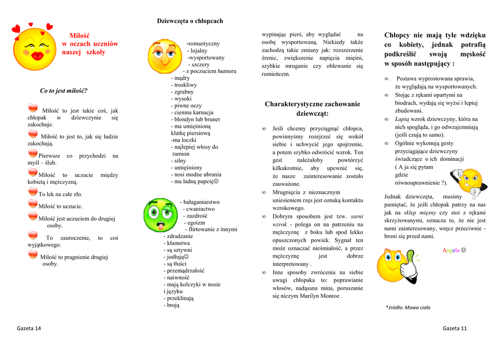 Dziewczęta o chłopcach Miłość w oczach uczniów naszej szkoły Co to jest miłość? Miłość to jest takie coś, jak chłopak w dziewczynie się zakochuje. Miłość to jest to, jak się ludzie zakochują. Pierwsze myśl – ślub. co przychodzi Miłość to uczucie kobietą i męŜczyzną. na między -romantyczny - lojalny -wysportowany - szczery - z poczuciem humoru - mądry - troskliwy - zgrabny - wysoki - piwne oczy - ciemna karnacja - blondyn lub brunet - ma umięśnioną klatkę piersiową -ma loczki - najlepiej włosy do ramion - silny - umięśniony - nosi modne ubrania - ma ładną pupcię☺ Miłość to uczucie. Miłość jest uczuciem do drugiej osoby. to Miłość to pragnienie drugiej osoby. Gazeta 14 coś - bałaganiarstwo - cwaniactwo - zazdrość - egoizm - flirtowanie z innymi - zdradzanie - kłamstwa - są sztywni - jodłują☺ - są tłuści - przemądrzałość - naiwność - mają kolczyki w nosie i języku - przeklinają - broją Chłopcy nie mają tyle wdzięku co kobiety, jednak potrafią podkreślić swoją męskość w sposób następujący : • • Charakterystyczne zachowanie dziewcząt: • • To lek na całe zło. To zauroczenie, wyjątkowego. wypinając pierś, aby wyglądać na osobę wysportowaną. Niekiedy takŜe zachodzą takie zmiany jak: rozszerzenie źrenic, zwiększenie napięcia mięśni, szybkie mruganie czy oblewanie się rumieńcem. • • Jeśli chcemy przyciągnąć chłopca, powinnyśmy rozejrzeć się wokół siebie i uchwycić jego spojrzenie, a potem szybko odwrócić wzrok. Ten gest naleŜałoby powtórzyć kilkakrotnie, aby upewnić się, Ŝe nasze zainteresowanie zostało zauwaŜone. Mrugnięcia z nieznacznym uniesieniem rzęs jest oznaką kontaktu wzrokowego. Dobrym sposobem jest tzw. sarni wzrok - polega on na patrzeniu na męŜczyznę z boku lub spod lekko opuszczonych powiek. Sygnał ten moŜe oznaczać nieśmiałość, a przez męŜczyznę jest dobrze interpretowany . Inne sposoby zwrócenia na siebie uwagi chłopaka to: poprawianie włosów, nadąsana mina, poruszanie się niczym Marilyn Monroe . • • Postawa wyprostowana sprawia, Ŝe wyglądają na wysportowanych. Stojąc z rękami opartymi na biodrach, wydają się wyŜsi i lepiej zbudowani. Łapią wzrok dziewczyny, która na nich spogląda, i go odwzajemniają (jeśli czują to samo). Ogólnie wykonują gesty przyciągające dziewczyny świadczące o ich dominacji ( A ja się pytam gdzie równouprawnienie ?). Jednak dziewczęta, musimy pamiętać, Ŝe jeśli chłopak patrzy na nas jak na sklep mięsny czy stoi z rękami skrzyŜowanymi, oznacza to, Ŝe nie jest nami zainteresowany, wręcz przeciwnie broni się przed nami. Angela ☺ *źródło: Mowa ciała Gazeta 11