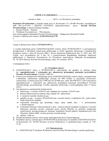UMOWA Nr (PROJEKT) ……………………. zawarta w dniu ………………2015 r. we Wrocławiu, pomiędzy: Powiatem Wrocławskim z siedzibą władz przy ul. Kościuszki 131; 50-440 Wrocław, posiadającym NIP: 897-16-47-961 i REGON: 931934816, reprezentowanym przez Zarząd Powiatu Wrocławskiego w imieniu którego działają: 1. Roman Potocki – Starosta 2. Waldemar Szczykutowicz – Wicestarosta, przy kontrasygnacie Skarbnika Powiatu Wrocławskiego – Małgorzaty Dreiseitel-Cieślik zwanym w dalszej treści umowy ZAMAWIAJĄCYM a …………………………………………………………………………………………………………, zwaną w dalszej treści umowy WYKONAWCĄ w wyniku dokonania przez ZAMAWIAJĄCEGO wyboru oferty WYKONAWCY w prowadzonym postępowaniu o udzielenie zamówienia publicznego w trybie zapytania ofertowego z pominięciem przepisów ustawy z dnia 29 stycznia 2004 r. Prawo Zamówień Publicznych (Dz. U. 2013, poz. 907 z późn. zm.) na podstawie art. 4 pkt. 8), z zastosowaniem Regulaminu udzielania zamówień publicznych w Starostwie Powiatowym we Wrocławiu stanowiącym Załącznik do zarządzenia Nr 38 /2014 Starosty Powiatu Wrocławskiego z dnia 02 września 2014 r. o następującej treści: § 1. Przedmiot umowy 1. ZAMAWIAJĄCY zleca, a WYKONAWCA zobowiązuje się zgodnie ze złoŜoną ofertą do zaprojektowania i wykonania gry planszowej promującej potencjał przyrodniczy Powiatu Wrocławskiego w liczbie 1 000 szt. 2. Umowa jest następstwem dokonanego przez ZAMAWIAJĄCEGO wyboru oferty z postępowania o udzielenie zamówienia publicznego poniŜej 30 000 EURO w przedziale kwotowym: zamówienie o wartości powyŜej 5 000 euro do 20 000 euro, znak: SP.FPR.0533.3.2015 pod nazwą zaprojektowanie i wykonanie gry planszowej promującej potencjał przyrodniczy Powiatu Wrocławskiego, prowadzonego w trybie zapytania ofertowego i rozstrzygniętego dnia 17 marca 2015 r. 3. Gra planszowa o parametrach technicznych: • plansza gry - wymiary 470x475 mm, składana do wymiaru: 235x475 mm • plansza lakierowana na tekturze litej, nadruk 4/0 - pełen kolor • w zestawie 4 pionki i kostka do gry • pudełko na grę - wymiary 495x245x40 mm, wieczko karton z nadrukiem 4/0 - pełen kolor, denko karton bez nadruku • wykonanie koncepcji gry (przebieg, etapy, opisy zadań, itp.) – w porozumieniu z Zamawiającym • wykonanie ilustracji wykorzystanych w grze - umieszczonych następnie na planszy i wieczku (ilustracje autorskie ręcznie wykonane przez artystę Plastyka na potrzeby niniejszego zamówienia), przedstawiających elementy krajobrazu dwóch parków krajobrazowych oraz Obszarów Natura 2000, z terenu powiatu wrocławskiego • nakład: 1 000 szt. 4. Projekt przedmiotu umowy musi zostać zaakceptowany przez Zamawiającego. 5. Przedmiot umowy zostanie przez WYKONAWCĘ dostarczony do siedziby ZAMAWIAJĄCEGO: ul. Kościuszki 131, 50-440 Wrocław na koszt Wykonawcy w godzinach pracy urzędu, tj. 7.4515.45. § 2. Dokumentacja 1. ZAMAWIAJĄCY przekaŜe Wykonawcy herb Powiatu Wrocławskiego w postaci graficznej. 1. 2. § 3. Odpowiedzialność osobowa Osobą odpowiedzialną za nadzorowanie realizacji umowy ze strony ZAMAWIAJĄCEGO jest ………………………………………. Osobą/mi odpowiedzialną/ymi za nadzorowanie realizacji umowy ze strony WYKONAWCY jest ……………………………… § 4. Termin realizacji 1. WYKONAWCA zobowiązany jest wykonać opracowanie projektu i przedstawić go do korekty merytorycznej ZAMAWIAJĄCEMU w terminie ……………………………. 2. ZAMAWIAJĄCY zobowiązany jest w terminie 2 dni roboczych zgłosić uwagi bądź zastrzeŜenia, które WYKONAWCA zobowiązany jest wziąć pod uwagę. 3. W przypadku zgłoszenia przez ZAMAWIAJĄCEGO uwag bądź zastrzeŜeń, WYKONAWCA zobowiązany jest w terminie 3 dni roboczych przedstawić projekty uwzględniając uwagi i zastrzeŜenia, co nie ma wpływu na termin określony w ust. 4 niniejszego paragrafu. 4. Termin realizacji zamówienia ustala się na dzień do 04 maja 2015 r. § 5. Odbiór przedmiotu umowy 1. WYKONAWCA zgłosi do odbioru wykonany przedmiot umowy, o którym mowa w § 1 na 3 dni robocze przed dostarczeniem w miejsce wskazane w § 1 ust. 5 umowy. 2. Odbiór przedmiotu umowy, o którym mowa w § 1, nastąpi po wcześniejszym zaakceptowaniu przez ZAMAWIAJĄCEGO. 3. Odbiór przedmiotu umowy, o którym mowa w § 1 odbędzie się na podstawie Protokołu zdawczo–odbiorczego podpisanego przez WYKONAWCĘ i przez osobę wymienioną w § 3 ze strony ZAMAWIAJĄCEGO. 4. Podpisany przez obie strony Protokół zdawczo-odbiorczy będzie stanowił podstawę do wystawienia faktury / rachunku* przez WYKONAWCĘ. 5. W przypadku stwierdzenia, Ŝe dostarczony przedmiot umowy, o którym mowa w § 1: a) nie jest kompletny, b) posiada wady, błędy ZAMAWIAJĄCY odmówi odbioru przedmiotu umowy, sporządzając protokół zawierający przyczyny odmowy odbioru. ZAMAWIAJĄCY wyznaczy następnie termin dostarczenia przedmiotu umowy wolnego od wad i usterek oraz kompletnego, a procedura czynności odbioru zostanie powtórzona. § 6. Wynagrodzenie 1. ZAMAWIAJĄCY zobowiązuje się zapłacić WYKONAWCY naleŜność za przedmiot umowy określony w § 1 w kwocie ……………brutto (słownie: ……………………………………), tj. według ceny ofertowej podanej przez WYKONAWCĘ w formularzu oferty. Kwota brutto podana przez Wykonawcę na formularzu oferty zawiera wszystkie koszty związane z wykonaniem przedmiotu umowy. 2. Wynagrodzenie będzie płatne w terminie 14 dni od daty otrzymania od WYKONAWCY prawidłowo wystawionej faktury / rachunku*, po uprzednim spełnieniu warunków, o których mowa w § 5 umowy. 3. ZAMAWIAJĄCY zobowiązuje się zapłacić naleŜność na rachunek bankowy WYKONAWCY podany na fakturze /rachunku*. Zapłata nastąpi w dniu obciąŜenia konta bankowego ZAMAWIAJĄCEGO. § 7. Kary umowne i odstąpienie od umowy 1. Strony ustalają następuj