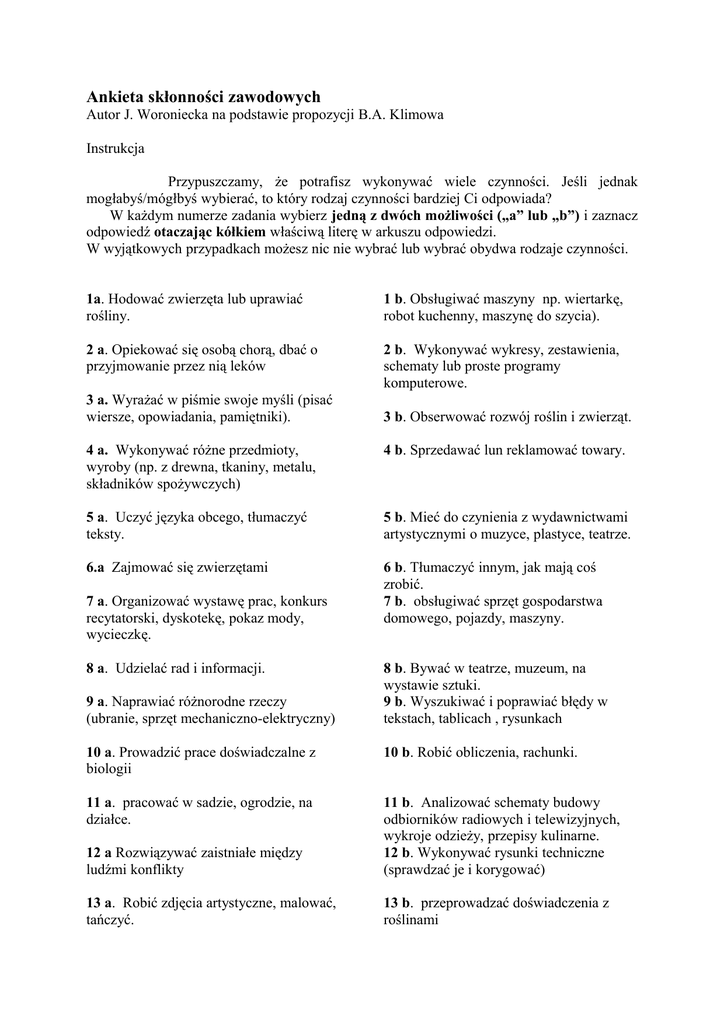 Ankieta skłonności zawodowych Autor J. Woroniecka na podstawie propozycji B.A. Klimowa Instrukcja Przypuszczamy, że potrafisz wykonywać wiele czynności. Jeśli jednak mogłabyś/mógłbyś wybierać, to który rodzaj czynności bardziej Ci odpowiada? W każdym numerze zadania wybierz jedną z dwóch możliwości („a” lub „b”) i zaznacz odpowiedź otaczając kółkiem właściwą literę w arkuszu odpowiedzi. W wyjątkowych przypadkach możesz nic nie wybrać lub wybrać obydwa rodzaje czynności. 1a. Hodować zwierzęta lub uprawiać rośliny. 1 b. Obsługiwać maszyny np. wiertarkę, robot kuchenny, maszynę do szycia). 2 a. Opiekować się osobą chorą, dbać o przyjmowanie przez nią leków 2 b. Wykonywać wykresy, zestawienia, schematy lub proste programy komputerowe. 3 a. Wyrażać w piśmie swoje myśli (pisać wiersze, opowiadania, pamiętniki). 3 b. Obserwować rozwój roślin i zwierząt. 4 a. Wykonywać różne przedmioty, wyroby (np. z drewna, tkaniny, metalu, składników spożywczych) 4 b. Sprzedawać lun reklamować towary. 5 a. Uczyć języka obcego, tłumaczyć teksty. 5 b. Mieć do czynienia z wydawnictwami artystycznymi o muzyce, plastyce, teatrze. 6.a Zajmować się zwierzętami 6 b. Tłumaczyć innym, jak mają coś zrobić. 7 b. obsługiwać sprzęt gospodarstwa domowego, pojazdy, maszyny. 7 a. Organizować wystawę prac, konkurs recytatorski, dyskotekę, pokaz mody, wycieczkę. 8 a. Udzielać rad i informacji. 9 a. Naprawiać różnorodne rzeczy (ubranie, sprzęt mechaniczno-elektryczny) 8 b. Bywać w teatrze, muzeum, na wystawie sztuki. 9 b. Wyszukiwać i poprawiać błędy w tekstach, tablicach , rysunkach 10 a. Prowadzić prace doświadczalne z biologii 10 b. Robić obliczenia, rachunki. 11 a. pracować w sadzie, ogrodzie, na działce. 12 a Rozwiązywać zaistniałe między ludźmi konflikty 11 b. Analizować schematy budowy odbiorników radiowych i telewizyjnych, wykroje odzieży, przepisy kulinarne. 12 b. Wykonywać rysunki techniczne (sprawdzać je i korygować) 13 a. Robić zdjęcia artystyczne, malować, tańczyć. 13 b. przeprowadzać doświadczenia z roślinami 14 a Naprawiać urządzenia i aparaturę medyczną 14 b. Nieść pomoc poszkodowanym w wypadkach 15 a. Skrupulatnie wykonywać powierzoną pracę. 15 b. Wyrażać własne przeżycia przez rysunek, muzykę, wiersz. 16 a. Wykonywać analizy laboratoryjne. 16 b. Przyjmować i leczyć chorych, rozmawiać z nimi. 17 a. Zmieniać wystrój, ozdabiać swoje otoczenie. 17 b. Montować i naprawiać różne mechanizmy, przyrządy, maszyny (np. samochody, rowery) 18 a. Prowadzić wycieczki do teatru, muzeum, rajdy turystyczne itp. 18 b. Dyskutować na tematy związane z architekturą i sztuką. 19 a. Reperować uszkodzoną zabawkę, żelazko lub inny sprzęt. 19 b. Przerysowywać rysunki, napisy, mapy. 20 a. Walczyć ze szkodnikami i chorobami roślin 20 b. Obsługiwać komputery, pisać na maszynie. 21 a. Przebywać wśród ludzi, udzielać im pomocy i świadczyć drobne usługi 21 b. Składać różne urządzenia, majsterkować. 22 a. Planować wydatki, sporządzać bilans kosztów 22 b. Być na wsi i brać udział w zajęciach gospodarskich. 23 a. Lepić z gliny lub Modliny. 23 b. Wędrować i obserwować naturę. 24 a. Porządkować notatki, dokumenty, rachunki. 24 b. Czytać czasopisma i książki o tematyce technicznej. 25 a. Zawierać nowe znajomości. 25 b. Rysować, grać na instrumencie, deklamować. Arkusz odpowiedzi do Ankiety skłonności zawodowych I II III IV V 1a 3b 6a 10 a 11 a 13 a 16 a 20 a 22 b 23 b - 1b 4a 7b 9a 11 b 14 a 17 b 19 a 21 b 24 b 2a 4b 6b 8a 12 a 14 a 16 b 18 a 21 a 25 a 2b 5a 9b 10 b 12 b 15 a 19 b 20 b 22 a 24 a - 3a 5b 7a 8b 13 a 15 b 17 a 18 b 23 a 25 b Razem Razem Razem Razem Razem Podsumuj liczbę wyborów w kolumnach pionowych. Uzyskane wyniki różnicują Twoje skłonności do pracy w poszczególnych grupach zawodowych. Kolumna I to zawody związane z przyrodą. Kolumna II to zawody związane z techniką. Kolumna III to zawody związane z pracą z ludźmi. Kolumna IV to zawody związane z pracą z danymi, liczbami Kolumna V to zawody związane z działalności artystyczną. Jeśli chcesz uzyskać więcej informacji, poznać lepiej swoje możliwości, poznać zawody, zgłoś się do doradcy zawodowego w Poradni Psychologiczno-Pedagogicznej w Wieruszowie.