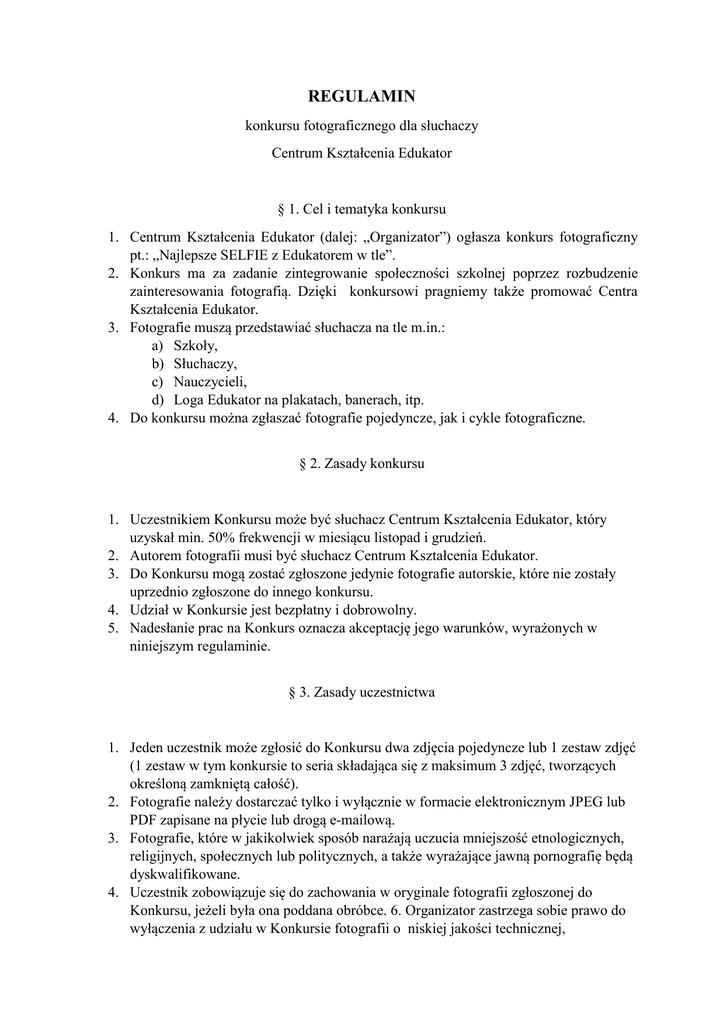 REGULAMIN konkursu fotograficznego dla słuchaczy Centrum Kształcenia Edukator § 1. Cel i tematyka konkursu 1. Centrum Kształcenia Edukator (dalej: „Organizator”) ogłasza konkurs fotograficzny pt.: „Najlepsze SELFIE z Edukatorem w tle”. 2. Konkurs ma za zadanie zintegrowanie społeczności szkolnej poprzez rozbudzenie zainteresowania fotografią. Dzięki konkursowi pragniemy także promować Centra Kształcenia Edukator. 3. Fotografie muszą przedstawiać słuchacza na tle m.in.: a) Szkoły, b) Słuchaczy, c) Nauczycieli, d) Loga Edukator na plakatach, banerach, itp. 4. Do konkursu można zgłaszać fotografie pojedyncze, jak i cykle fotograficzne. § 2. Zasady konkursu 1. Uczestnikiem Konkursu może być słuchacz Centrum Kształcenia Edukator, który uzyskał min. 50% frekwencji w miesiącu listopad i grudzień. 2. Autorem fotografii musi być słuchacz Centrum Kształcenia Edukator. 3. Do Konkursu mogą zostać zgłoszone jedynie fotografie autorskie, które nie zostały uprzednio zgłoszone do innego konkursu. 4. Udział w Konkursie jest bezpłatny i dobrowolny. 5. Nadesłanie prac na Konkurs oznacza akceptację jego warunków, wyrażonych w niniejszym regulaminie. § 3. Zasady uczestnictwa 1. Jeden uczestnik może zgłosić do Konkursu dwa zdjęcia pojedyncze lub 1 zestaw zdjęć (1 zestaw w tym konkursie to seria składająca się z maksimum 3 zdjęć, tworzących określoną zamkniętą całość). 2. Fotografie należy dostarczać tylko i wyłącznie w formacie elektronicznym JPEG lub PDF zapisane na płycie lub drogą e-mailową. 3. Fotografie, które w jakikolwiek sposób narażają uczucia mniejszość etnologicznych, religijnych, społecznych lub politycznych, a także wyrażające jawną pornografię będą dyskwalifikowane. 4. Uczestnik zobowiązuje się do zachowania w oryginale fotografii zgłoszonej do Konkursu, jeżeli była ona poddana obróbce. 6. Organizator zastrzega sobie prawo do wyłączenia z udziału w Konkursie fotografii o niskiej jakości technicznej, przesłanych w złym formacie oraz fotografii, które w inny sposób naruszają niniejszy regulamin. 5. Prace nadesłane na konkurs nie będą zwracane autorom. 6. Fotografie można nadsyłać na Konkurs jako przesyłkę pocztową lub przesyłkę kurierską (na koszt nadsyłającego) do siedziby Organizatora na adres: Centrum Kształcenia Edukator ul. Orylska 3 06-400 Ciechanów „Konkurs fotograficzny” lub dostarczyć w zaadresowanej kopercie (tak jak powyżej) do sekretariatu szkoły lub dostarczyć drogą e-mailową. 7. Prace konkursowe należy przesłać w nieprzekraczalnym terminie do dnia 22.12.2014r. (decyduje data stempla pocztowego). 8. Fotografie nadesłane po terminie nie będą brane pod uwagę w Konkursie. 9. Prace powinny być opatrzone na odwrocie metryczką zawierającą: tytuł zestawu, imię i nazwisko słuchacza, klasa, adres e-mail, telefon kontaktowy. 10. Ponadto każdy uczestnik konkursu obowiązany jest dołączyć oświadczenie (załącznik nr 1) 11. Ze względu na udział w Konkursie uczestników nieletnich należy załączyć pisemną zgodę rodziców na przetwarzanie danych osobowych w celach związanych z rozstrzygnięciem konkursu i wystawą (załącznik nr 2) 12. Uczestnik Konkursu przyjmuje na siebie wszelkie roszczenia jakiejkolwiek natury, które osoby trzecie mogłyby kierować przeciwko organizatorom konkursu. § 4. Nagrody 1. Autorom najlepszych zdjęć zostaną przyznane atrakcyjne nagrody rzeczowe. 2. Wszyscy uczestnicy otrzymają dyplom za udział w Konkursie. 3. Lista nagrodzonych autorów fotografii zostanie opublikowana na stronie internetowej. § 5. Komisja oceniająca 1. Organizator powołuje Komisję Oceniającą Konkursu. 2. Komisja zastrzega sobie prawo do przyznawania miejsc exaequo. Decyzje jury będą ostateczne. 3. Zadaniem Komisji oceniającej jest: a) kwalifikacja zgłoszonych fotografii do udziału w Konkursie, b) ocena zgłoszonych fotografii, c) przyznanie nagród, d) wybór fotografii przeznaczonych na wystawę i nagrodzonych drukiem w prasie lokalnej. 4. Przy ocenie zdjęć uwzględnia się: a) kryteria merytoryczne, b) wartość artystyczną, c) jakość techniczną i poziom estetyczny prac. 5. Zwycięzcy Konkursu zostaną powiadomieni o wynikach przez Organizatora listownie, mailowo lub telefonicznie. 6. Wyniki Konkursu zostaną podane w terminie nie przekraczającym 31.01.2014r. na stronie internetowej Organizatora. 7. Termin oficjalnego ogłoszenia wyników i wręczenia nagród rzeczowych zostanie umieszczony na stronie internetowej Organizatora. 7. Zwycięzcy i wyróżnieni otrzymają listowne zawiadomienie. § 6. Wystawa pokonkursowa Reprodukcje fotografii nagrodzonych i wyróżnionych w konkursie zostaną wystawione w Szkole, w której organizowany jest konkurs. § 7. Dodatkowe informacje Dodatkowych informacji na temat konkursu udziela Pani Olga Rykaczewska tel: 503 652 305 e-mail: [email protected]