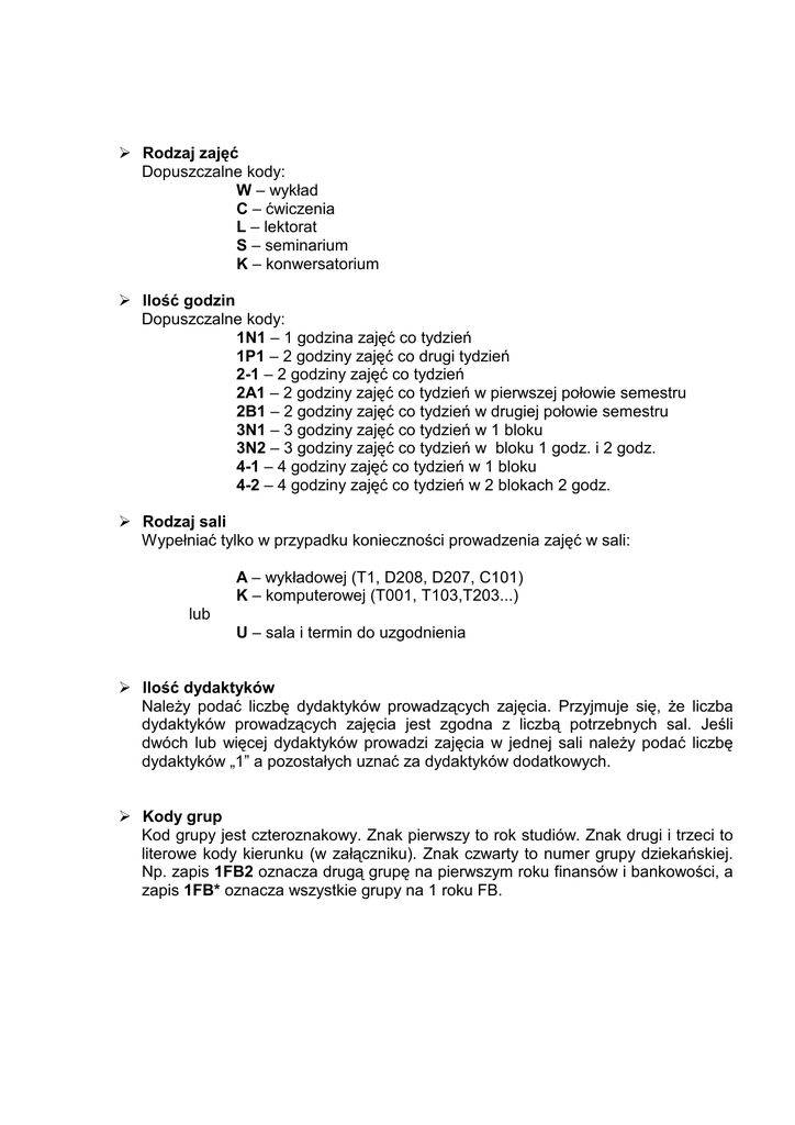 Rodzaj zajęć Dopuszczalne kody: W – wykład C – ćwiczenia L – lektorat S – seminarium K – konwersatorium Ilość godzin Dopuszczalne kody: 1N1 – 1 godzina zajęć co tydzień 1P1 – 2 godziny zajęć co drugi tydzień 2-1 – 2 godziny zajęć co tydzień 2A1 – 2 godziny zajęć co tydzień w pierwszej połowie semestru 2B1 – 2 godziny zajęć co tydzień w drugiej połowie semestru 3N1 – 3 godziny zajęć co tydzień w 1 bloku 3N2 – 3 godziny zajęć co tydzień w bloku 1 godz. i 2 godz. 4-1 – 4 godziny zajęć co tydzień w 1 bloku 4-2 – 4 godziny zajęć co tydzień w 2 blokach 2 godz. Rodzaj sali Wypełniać tylko w przypadku konieczności prowadzenia zajęć w sali: A – wykładowej (T1, D208, D207, C101) K – komputerowej (T001, T103,T203...) lub U – sala i termin do uzgodnienia Ilość dydaktyków NaleŜy podać liczbę dydaktyków prowadzących zajęcia. Przyjmuje się, Ŝe liczba dydaktyków prowadzących zajęcia jest zgodna z liczbą potrzebnych sal. Jeśli dwóch lub więcej dydaktyków prowadzi zajęcia w jednej sali naleŜy podać liczbę dydaktyków „1” a pozostałych uznać za dydaktyków dodatkowych. Kody grup Kod grupy jest czteroznakowy. Znak pierwszy to rok studiów. Znak drugi i trzeci to literowe kody kierunku (w załączniku). Znak czwarty to numer grupy dziekańskiej. Np. zapis 1FB2 oznacza drugą grupę na pierwszym roku finansów i bankowości, a zapis 1FB* oznacza wszystkie grupy na 1 roku FB.