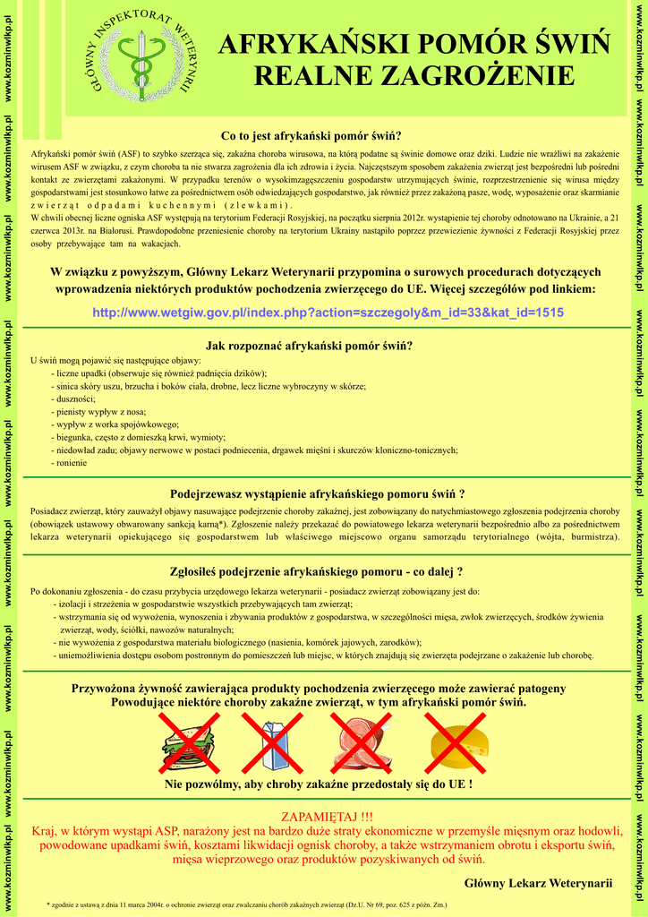 ÓWNY I N GŁ www.kozminwlkp.pl www.kozminwlkp.pl Co to jest afrykański pomór świń? Afrykański pomór świń (ASF) to szybko szerząca się, zakaźna choroba wirusowa, na którą podatne są świnie domowe oraz dziki. Ludzie nie wrażliwi na zakażenie wirusem ASF w związku, z czym choroba ta nie stwarza zagrożenia dla ich zdrowia i życia. Najczęstszym sposobem zakażenia zwierząt jest bezpośredni lub pośredni kontakt ze zwierzętami zakażonymi. W przypadku terenów o wysokimzagęszczeniu gospodarstw utrzymujących świnie, rozprzestrzenienie się wirusa między gospodarstwami jest stosunkowo łatwe za pośrednictwem osób odwiedzających gospodarstwo, jak również przez zakażoną pasze, wodę, wyposażenie oraz skarmianie . zwierząt odpadami kuchennymi (zlewkami). W chwili obecnej liczne ogniska ASF występują na terytorium Federacji Rosyjskiej, na początku sierpnia 2012r. wystąpienie tej choroby odnotowano na Ukrainie, a 21 czerwca 2013r. na Białorusi. Prawdopodobne przeniesienie choroby na terytorium Ukrainy nastąpiło poprzez przewiezienie żywności z Federacji Rosyjskiej przez osoby przebywające tam na wakacjach. . W związku z powyższym, Główny Lekarz Weterynarii przypomina o surowych procedurach dotyczących wprowadzenia niektórych produktów pochodzenia zwierzęcego do UE. Więcej szczegółów pod linkiem: www.kozminwlkp.pl www.kozminwlkp.pl www.kozminwlkp.pl Podejrzewasz wystąpienie afrykańskiego pomoru świń ? Posiadacz zwierząt, który zauważył objawy nasuwające podejrzenie choroby zakaźnej, jest zobowiązany do natychmiastowego zgłoszenia podejrzenia choroby (obowiązek ustawowy obwarowany sankcją karną*). Zgłoszenie należy przekazać do powiatowego lekarza weterynarii bezpośrednio albo za pośrednictwem lekarza weterynarii opiekującego się gospodarstwem lub właściwego miejscowo organu samorządu terytorialnego (wójta, burmistrza). . Zgłosiłeś podejrzenie afrykańskiego pomoru - co dalej ? Przywożona żywność zawierająca produkty pochodzenia zwierzęcego może zawierać patogeny Powodujące niektóre choroby zakaźne zwierząt, w tym afrykański pomór świń. Główny Lekarz Weterynarii * zgodnie z ustawą z dnia 11 marca 2004r. o ochronie zwierząt oraz zwalczaniu chorób zakaźnych zwierząt (Dz.U. Nr 69, poz. 625 z późn. Zm.) www.kozminwlkp.pl ZAPAMIĘTAJ !!! Kraj, w którym wystąpi ASP, narażony jest na bardzo duże straty ekonomiczne w przemyśle mięsnym oraz hodowli, powodowane upadkami świń, kosztami likwidacji ognisk choroby, a także wstrzymaniem obrotu i eksportu świń, mięsa wieprzowego oraz produktów pozyskiwanych od świń. www.kozminwlkp.pl Nie pozwólmy, aby chroby zakaźne przedostały się do UE ! www.kozminwlkp.pl Po dokonaniu zgłoszenia - do czasu przybycia urzędowego lekarza weterynarii - posiadacz zwierząt zobowiązany jest do: - izolacji i strzeżenia w gospodarstwie wszystkich przebywających tam zwierząt; - wstrzymania się od wywożenia, wynoszenia i zbywania produktów z gospodarstwa, w szczególności mięsa, zwłok zwierzęcych, środków żywienia zwierząt, wody, ściółki, nawozów naturalnych; - nie wywożenia z gospodarstwa materiału biologicznego (nasienia, komórek jajowych, zarodków); - uniemożliwienia dostępu osobom postronnym do pomieszczeń lub miejsc, w których znajdują się zwierzęta podejrzane o zakażenie lub chorobę. www.kozminwlkp.pl www.kozminwlkp.pl U świń mogą pojawić się następujące objawy: - liczne upadki (obserwuje się również padnięcia dzików); - sinica skóry uszu, brzucha i boków ciała, drobne, lecz liczne wybroczyny w skórze; - duszności; - pienisty wypływ z nosa; - wypływ z worka spojówkowego; - biegunka, często z domieszką krwi, wymioty; - niedowład zadu; objawy nerwowe w postaci podniecenia, drgawek mięśni i skurczów kloniczno-tonicznych; - ronienie www.kozminwlkp.pl www.kozminwlkp.pl www.kozminwlkp.pl Jak rozpoznać afrykański pomór świń? www.kozminwlkp.pl http://www.wetgiw.gov.pl/index.php?action=szczegoly&m_id=33&kat_id=1515 www.kozminwlkp.pl www.kozminwlkp.pl AFRYKAŃSKI POMÓR ŚWIŃ REALNE ZAGROŻENIE www.kozminwlkp.pl www.kozminwlkp.pl K TO R AT ERYNRI I ET W E SP