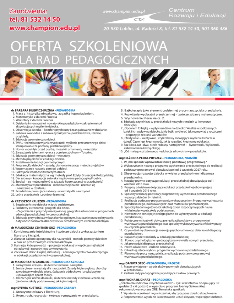 Zamówienia: tel. 81 532 14 50 www.champion.edu.pl OFERTA SZKOLENIOWA DLA RAD PEDAGOGICZNYCH dr BARBARA BILEWICZ-KUŹNIA - PEDAGOGIKA 1. P raca z historyjką obrazkową, zagadką i opowiadaniem. 2. Matematyka z darami Froebla 3. Warsztaty z darami Froebla. 4. Działania innowacyjne i nowatorskie przedszkola w zakresie metod aktywizujących myślenie dziecka. 5. Obserwacja dziecka - komfort psychiczny i zaangażowanie w działanie. 6. Zabawa swobodna a zabawa dydaktyczna- podobieństwa, różnice, przykłady. 7. Edukacja geometryczna dzieci. 8. T WAL- technika rozwijania wyobraźni i myślenia przestrzennego dzieci stemplowanie za pomocą plastikowej karty. 9. Horror vacui- lęk przed pustką, mozaiki i ornamenty - warsztaty 10. Zarządzanie talentami -praca z uczniem zdolnym – Tutoring. 11. Edukacja geometryczna dzieci – warsztaty. 12. Metoda projektów w edukacji dziecka. 13. Kształtowanie intuicji geometrycznych. 14. Program „Ku dziecku” – zasady, planowanie pracy, metoda projektów. 15. Wspomaganie rozwoju pamięci u dzieci. 16. Rozwijanie zdolności twórczych dzieci. 17. Edukacja matematyczna wg metody prof. Edyty Gruszczyk-Kolczyńskiej. 18. Dar zabawy - koncepcja autorska inspirowana pedagogiką Froebla. 19. Eureka! - co można odkryć w zabawie heurystycznej w przedszkolu? 20. Matematyka w przedszkolu - niekonwencjonalnie -uczenie się i nauczanie w działaniu. 21. Przedszkole promujące zabawy - warsztaty dla nauczycieli. 22. Leśne przedszkola i „outdoor learning.” dr KRZYSZTOF KRUSZKO - PEDAGOGIKA 1. Bezpieczeństwo dziecka w życiu codziennym. 2. Podstawy astronomii i geografii dla dzieci. - Zagadnienia z przyrody nieożywionej, geografii i astronomii w programach edukacji przedszkolnej i wczesnoszkolnej. 3. Edukacja przyrodnicza w kształceniu ogólnym. Nauczanie przez odkrywanie. Aktywność badawcza dzieci w wieku przedszkolnym i wczesnoszkolnym. dr MAŁGORZATA CENTNER-GUZ - PEDAGOGIKA 1. K ombinowanie intelektualne i twórcze dzieci z wykorzystaniem literatury i książki. 2. Warsztat bajkoterapeutyczny dla nauczycieli - metoda pomocy dzieciom w okresie przedszkolnym i wczesnoszkolnym. 3. I lustracja, która prowadzi - potencjał edukacyjny współczesnej książki obrazkowej i sposoby jego wykorzystania. 4. Z aciekawić dzieci książką i literaturą - animacja czytelnictwa dziecięcego w edukacji przedszkolnej i wczesnoszkolnej. dr Małgorzata Samujło– PEDAGOGIKA SZKOLNA 1. Zarządzanie czasem - skuteczne techniki i narzędzia. 2. Emisja głosu - warsztaty dla nauczycieli. Zasady higieny głosu, choroby zawodowe w obrębie głosu, ćwiczenia oddechowe i artykulacyjne usprawniające aparat mowy. 3. Jak zachęcić ucznia do nauki, skuteczne metody i techniki uczenia się (zarówno szkoły podstawowej, jak i gimnazjum). mgr SYLWIA KUSTOSZ – PEDAGOGIKA ZABAWY 1. Kreatywne zabawy z literaturą. 2. Rytm, ruch, recytacja - twórcze rymowanie w przedszkolu. 3. Bajkoterapia jako element codziennej pracy nauczyciela przedszkola. 4. Rozwijanie wyobraźni przestrzennej - twórcze zabawy matematyczne. 5. Wychowanie literackie cz. 2. 6. Edukacja czytelnicza w przedszkolu i nowych trendach w literaturze dziecięcej. 7. „Opowiem Ci bajkę – wpływ mediów na dziecko.” Analiza współczesnych bajek i ich wpływ na dziecko, jakie bajki wybierać, jak rozmawiać z rodzicami – propozycje zebrań i warsztatów. 8. „Efektywnie – kreatywnie , czyli zabawy rozwijające myślenie twórcze u dzieci.” Czym jest kreatywność, jak ją rozwijać, kreatywna edukacja. 9. Raz i dwa, raz i dwa, niech radosny nastrój trwa! – Rymowanki, Wyliczanki, Zabawianki na każdą okazję. 10. „Od małego coś zdrowego - edukacja zdrowotna w przedszkolu. mgr ELŻBIETA PEŁKA-PRYSZCZ – PEDAGOGIKA, NADZÓR 1. W jaki sposób wprowadzać nową podstawę programową? 2. W ykorzystanie nowego programu wychowania przedszkolnego do realizacji podstawy programowej obowiązującej od 1 września 2017 roku. 3. O bserwacja rozwoju dziecka w wieku przedszkolnym i diagnoza przedszkolna. 4. Przepisy prawne dotyczące edukacji przedszkolnej obowiązujące od 1 września 2016 roku. 5. Przepisy oświatowe dotyczące edukacji przedszkolnej obowiązujące od 1 września 2016 roku. 6. Sposoby realizacji podstawy programowej wychowania przedszkolnego w pracy z dziećmi 6 - letnimi. 7. Realizacja podstawy programowej z wykorzystaniem Programu wychowania przedszkolnego „Kolorowa tęcza” oraz materiałów pomocniczych. 8. Sposoby badania gotowości szkolnej dzieci rozpoczynających naukę w klasie pierwszej szkoły podstawowej. 9. Nowoczesne koncepcje pedagogiczne do wykorzystania w edukacji przedszkolnej. 10. P raktyczne wskazówki dotyczące realizacji podstawy programowej wychowania przedszkolnego oraz sposoby wykorzystywania efektów pracy nauczyciela przedszkola. 11. C zym różni się obserwacja rozwoju psychoruchowego dziecka od diagnozy przedszkolnej. 12. N ajważniejsze standardy w edukacji przedszkolnej 13. Pomoc psychologiczno - pedagogiczna w świetle nowych przepisów. 14. Jak prowadzić diagnozę przedszkolną? 15. Prawo oświatowe - zadania nauczyciela. 16. O trudnej sztuce wyboru programu wychowania przedszkolnego. 17. P lanowanie pracy nauczyciela, a realizacja podstawy programowej wychowania przedszkolnego. mgr DANUTA STEĆ - PEDAGOGIKA, NADZÓR 1. Prawo oświatowe - wybór aktów prawnych obowiązujących w przedszkolu. 2. Zadania rady pedagogicznej wynikające z aktów prawnych. mgr IWONA BLICHARZ – PEDAGOGIKA „Szkoła dla rodziców i wychowawców” – cykl warsztatów obejmujący 30 godzin (5 x 6 godzin) w oparciu o program Joanny Sakowskiej rekomendowany przez ORE. Tematyka spotkań: 1. Wyrażanie oczekiwań i ograniczeń tak, aby były przez dziecko akceptowane. 2. R ozpoznawanie, wyrażanie i akceptowanie uczuć; aktywne, wspierające słuchanie. 3. Motywowanie dziecka do współdziałania. Modyfikowanie niepożądanych zachowań. 4. Rozwiązywanie problemów i kon