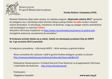 Drodzy Rodzice i Sympatycy SPOS, Niewielu Rodziców zdaje sobie sprawę, że rządowy program ,,Wyprawka szkolna 2012'' uprawnia do ubiegania się o refundację części kosztów zakupu podręczników nie tylko osoby o skrajnie niskich dochodach. O refundację, niezależnie od dochodu, mogą się ubiegać rodziny wielodzietne czyli posiadające co najmniej 3 dzieci. Wszystkie informacje znajdziecie na http://www.rzecznikrodzicow.pl/zwrot‐za‐podreczniki . Szczególnie polecamy uzasadnienia do wniosków ! W Krakowie wnioski składa się w szkole. Szkoła ma obowiązek przekazać listę do MOPS do 6‐go września 2012 (czwartek). W załączeniu przesyłamy: ‐ Informacja MOPS ‐ Wzór wniosku w gminie Kraków Wzory wniosków dla rodziców i szkół w gminie Kraków dostępne są także na stronie http://www.portaledukacyjny.krakow.pl/index.php?type=pliki&id=97. Dziękujemy Stowarzyszeniu i Fundacji Rzecznik Praw Rodziców za przygotowanie informacji i materiałów dla Rodziców. http://rzecznikrodzicow.pl/ Pozdrawiam, Magdalena Gwózdek www.spos.org.pl Dofinansowanie do zakupu podręczników. Nie wyrzucaj paragonu! Miejski Ośrodek Pomocy Społecznej w Krakowie informuje, że na podstawie Rządowego programu pomocy uczniom w 2012 r. - „Wyprawka szkolna”, istnieje możliwość uzyskania dofinansowania do zakupu podręczników. Dofinansowanie przysługuje rozpoczynającym w roku szkolnym 2012/2013 naukę: 1. uczniom klas I szkoły podstawowej pochodzącym z rodzin, w których dochód na osobę nie przekracza 504 zł netto na osobę w rodzinie (kryterium dochodowe zapisane w ustawie o świadczeniach rodzinnych) 2. uczniom klas II-IV szkoły podstawowej pochodzącym z rodzin, w których dochód nie przekracza 351 zł netto na osobę w rodzinie (kryterium dochodowe zapisane w ustawie o pomocy społecznej) 3. uczniom klas I szkoły ponadgimnazjalnej: zasadniczej szkoły zawodowej, liceum ogólnokształcącym i technikum, pochodzącym z rodzin, w których dochód nie przekracza 351 zł netto na osobę w rodzinie (kryterium dochodowe zapisane w ustawie o pomocy społecznej) 4. uczniom pochodzącym z rodzin niespełniających kryterium dochodowego, o którym mowa w art. 8 ust. 1 pkt 2 ustawy z dnia 12 marca 2004 r. o pomocy społecznej, w przypadkach określonych w art. 7 ustawy z dnia 12 marca 2004 r. o pomocy społecznej, na podstawie decyzji dyrektora szkoły, do której uczęszcza uczeń, z wyłączeniem uczniów klas I szkoły podstawowej. Liczba uczniów, którym zostanie udzielona pomoc w tym trybie nie może przekroczyć w danej gminie 5% ogólnej liczby uczniów 5. uczniom słabowidzącym, niesłyszącym, z upośledzeniem umysłowym w stopniu lekkim, uczniom z niepełnosprawnościami sprzężonymi, w przypadku gdy jedną z niepełnosprawności jest niepełnosprawność wymieniona wyżej, którzy posiadają orzeczenie o potrzebie kształcenia specjalnego, o którym mowa w art. 71b ust. 3 ustawy z dnia 7 września 1991 r. o systemie oświaty, uczęszczający w roku szkolnym 2012/2013 do szkół podstawowych, gimnazjów i szkół ponadgimnazjalnych. Wysokość planowanego dofinansowania określona w Rządowym programie pomocy uczniom w 2012 r. – „Wyprawka szkolna” wynosi: - do kwoty 180 zł - dla uczniów klas I-III szkoły podstawowej - do kwoty 210 zł - dla uczniów klas IV szkoły podstawowej oraz niepełnosprawnych uczniów klas IV-VI szkoły podstawowej - do kwoty 325 zł - dla niepełnosprawnych uczniów gimnazjum - do kwoty 352 zł - dla uczniów klasy I szkół ponadgimnazjalnych i niepełnosprawnych uczniów szkół ponadgimnazjalnych Wnioski należy składać w szkole, do której uczeń będzie uczęszczał w roku szkolnym 2012/2013. Szczegółowe informacje można uzyskać w szkole, do której uczeń będzie uczęszczać w roku szkolnym 2012/2013 lub w MOPS w Krakowie, Dział Koordynacji Pracy Filii, pok. 109, tel. 12 616 54 71. Do 6 września szkoły muszą przekazać do MOPS listy dzieci, którym przysługuje dofinansowanie. Osoba ubiegająca się o pomoc, powinna złożyć wniosek, do którego należy dołączyć zaświadczenie o wysokości dochodów. W uzasadnionych przypadkach do wniosku można dołączyć zamiast zaświadczenia o wysokości dochodów oświadczenie o wysokości dochodów. W przypadku ubiegania się o pomoc dla ucznia zamieszkałego na terenie Gminy Miejskiej Kraków, którego rodzina korzysta ze świadczeń pieniężnych z pomocy społecznej w formie zasiłku stałego lub okresowego, wystarczy oświadczenie. W przypadku ubiegania się o pomoc dla ucznia klasy I szkoły podstawowej lub I klasy ogólnokształcącej szkoły muzycznej I stopnia, którego rodzina korzysta ze świadczeń rodzinnych, można przedłożyć zamiast zaświadczenia o wysokości dochodów – zaświadczenie o korzystaniu ze świadczeń rodzinnych w formie zasiłku rodzinnego lub dodatku do zasiłku rodzinnego. Rodzice dzieci niepełnosprawnych zamiast zaświadczenia o wysokości dochodów, do wniosku dołączają kopię orzeczenia o potrzebie kształcenia specjalnego, wydanego przez publiczną poradnię psychologiczno-pedagogiczną. Dowodem zakupu podręczników jest faktura VAT wystawiona imiennie na ucznia, rodzica, prawnego opiekuna, rodzica zastępczego lub rachunek, paragon. Możliwe jest również złożenie oświadczenie o zakupie podręczników. Kraków, ……………….. WNIOSEK o przyznanie dofinansowania na zakup podręczników dla ucznia klasy ……….. …………………………………………………………… (nazwa szkoły/placówki oświatowej) I. Dane wnioskodawcy: 1. Imię i nazwisko …………………………………………………….………………… 2. Adres zamieszkania ……………………………………………….………………….. 3. Numer telefonu …………………………………………………….…………………. II. Dane osobowe ucznia: 1. Imię i nazwisko ucznia ……………………