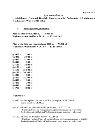 Załącznik Nr 7 Sprawozdanie z działalności Gminnej Komisji Rozwiązywania Problemów Alkoholowych w Zduńskiej Woli w 2010 roku I. Sprawozdanie finansowe. Plan dochodów na 2010 r. – 75.000 zł Wykonanie dochodów w 2010 r. – 83.614,10 zł Plan wydatków po zmianach na 2010 r. – 75.000 zł Wykonanie wydatków w 2010 r. – 51.851,95 zł § 3020 § 3030 § 4010 § 4040 § 4110 § 4120 § 4170 § 4210 § 4220 § 4300 § 4410 § 4430 § 4440 § 4700 - 1.300 zł - 3.000 zł - 8.300 zł - 1.200 zł - 2.500 zł 400 zł - 15.500 zł - 10.300 zł - 1.000 zł - 24.300 zł - 1.200 zł 300 zł 900 zł - 4.800 zł Wykonanie: § 3030 - różne wydatki na rzecz osób fizycznych - 1.587,00 zł (diety członków GKRPA), § 4110 - składki na ubezpieczenie społeczne - 1.257,72 zł (składki społeczne od wynagrodzenia opiekuna pracującego w świetlicy środowiskowej w Zduńskiej Woli zatrudnionego na umowę - zlecenie), § 4120 - składki na Fundusz Pracy - 202,86 zł (składki na Fundusz Pracy od wynagrodzenia opiekuna pracującego w świetlicy środowiskowej w Zduńskiej Woli zatrudnionego na umowę - zlecenie), § 4170 - wynagrodzenia bezosobowe - 15.450,00 zł (umowy - zlecenia dla osoby prowadzącej punkt konsultacyjny dla ofiar przemocy, dla opiekuna pracującego w świetlicy środowiskowej w Zduńskiej Woli, dla pełnomocnika ds. realizacji gminnego programu profilaktyki i rozwiązywania problemów alkoholowych, dla terapeuty prowadzącego terapię osób współuzależnionych i dotkniętych przemocą, dla psychologa i psychiatry /biegłych sądowych/ badających osoby kierowane), § 4210 - zakup materiałów i wyposażenia - 9.985,06 zł (zakupy związane z organizacją imprez okolicznościowych, finansowanie programów profilaktycznych realizowanych w szkołach, prenumeraty czasopism o charakterze profilaktycznym, zakup sprzętu dla Poradni dla Osób z Problemami Alkoholowymi w Zduńskiej Woli oraz Komendy Powiatowej Policji w Zduńskiej Woli), § 4300 - zakup usług pozostałych - 18.204,31 zł (wsparcie realizowanych w szkołach programów z promocji zdrowia, opłacenie udziału dzieci w spektaklu profilaktycznym, pokrycie kosztów wypoczynku letniego dla dzieci i młodzieży z rodzin dysfunkcyjnych oraz opłacenie udziału dzieci w profilaktycznych wakacjach „Wędrujące Artystyczne Lato”), § 4410 - podróże służbowe - 85,00 zł (delegacje dla członka GKRPA – udział w szkoleniu w Załęczu Wielkim z zakresu przeciwdziałania przemocy w rodzinie oraz z zakresu przeciwdziałania alkoholizmowi organizowanym przez Regionalne Centrum Polityki Społecznej w Łodzi), § 4430 - różne opłaty i składki - 280,00 zł (opłaty za koszty sądowe dotyczące wszczęcia postępowania wobec osób zgłoszonych), § 4700 - szkolenia pracowników - 4.800,00 zł (opłata za szkolenie prowadzone przez specjalistów ze Stowarzyszenia „Niebieska Linia” z Warszawy dla gminnych pedagogów szkolnych, członków GKRPA, pracowników socjalnych GOPS i dzielnicowych KPP w Zduńskiej Woli z zakresu przeciwdziałania przemocy w rodzinie i tworzenia zespołów interdyscyplinarnych). Razem wykonanie: - 51.851,95 zł. II. Sprawozdanie rzeczowe Gminny Program Profilaktyki i Rozwiązywania Problemów Alkoholowych, Przeciwdziałania Narkomanii oraz Przeciwdziałania Przemocy w Rodzinie na 2010 rok został przyjęty Uchwałą Nr XLVII/308/09 z dnia 30 grudnia 2009 r. Program obejmuje działania związane z profilaktyką i rozwiązywaniem problemów alkoholowych, problemów narkomanii oraz problemów związanych ze zjawiskiem przemocy w rodzinie. Zgodnie z nim Gminna Komisja Rozwiązywania Problemów Alkoholowych podejmowała następujące działania: 1. Finansowanie świetlicy środowiskowej w Zduńskiej Woli – zatrudnienie specjalisty na umowę – zlecenie na okres 6 miesięcy (ogólny koszt 9.740,58 zł). Uczęszczało do niej 22 podopiecznych w większości z rodzin z problemem alkoholowym. Świetlica jest prowadzona przez Stowarzyszenie na rzecz Osób Niepełnosprawnych w Zduńskiej Woli. Wszystkie dzieci brały udział w zajęciach opiekuńczo - wychowawczych, korekcyjnych oraz profilaktycznych. 2. Współpraca z instytucjami i stowarzyszeniami: - zakup od Towarzystwa Walki z Kalectwem w Zduńskiej Woli dla dzieci z terenu naszej gminy biletów na spektakl o charakterze profilaktycznym w Domu Kultury „Lokator" - 2.000 zł, - współorganizowano z Klubem Abstynentów „Wola" w Zduńskiej Woli VIII Festynu Trzeźwości „Trzeźwy maj - dobry maj" - 450 zł, - współorganizowano ze Stowarzyszeniem na rzecz Pomocy Dzieciom i Młodzieży „Razem Łatwiej” w Izabelowie bal karnawałowy dla dzieci z rodzin z problemem alkoholowym, który odbył się 8 lutego 2010 roku w Szkole Podstawowej w Wojsławicach - 201,40 zł, - współorganizowanie ze Stowarzyszeniem Abstynentów Klubu Abstynenta im. Jana Pawła II działającego we wsi Czechy VIII Rocznicowego Integracyjnego Spotkania Trzeźwościowego - 800 zł, - doposażono Poradnię dla Osób z Problemami Alkoholowymi w Zduńskiej Woli w materiały niezbędne do terapii oraz w sprzęt komputerowy wsparcie w wys. 2.400 zł, - doposażono Komendę Powiatową Policji w Zduńskiej Woli w sprzęt elektroniczny w postaci kamery - wsparcie w wysokości 1.049 zł. 3. Pomoc osobom nadużywającym alkohol: - w ciągu roku wezwano 66 osób, w stosunku do których wpłynęły wnioski o wszczęcie postępowania w sprawie skierowania na leczenie odwykowe; przeprowadzano z nimi rozmowy mające na celu nakłonienie ich do leczenia odwykowego i podjęcia terapii. Ponadto przeprowadzono także szereg rozmów interwencyjnych i wspierających z członkami rodzin osób uzależnionych oraz z osobami zainteresowanymi, wszystkie osoby, które zgłosiły się na rozmowę były kierowane do Poradni dla Osób z Problemami Alkoholowymi w Zduńskiej Woli, - skierowano do lekarza biegłego 7 wniosków o wydanie opinii w przedmiocie uzależnienia (ogólny koszt - 240 zł ), - 