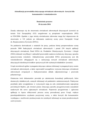 Aktualizacja przewodnika dotyczącego oświadczeń zdrowotnych– korzyści dla konsumentów i wnioskodawców Doniesienie prasowe 18 stycznia 2016 Zasady odnoszące się do stosowania oświadczeń zdrowotnych dotyczących żywności na terenie Unii Europejskiej (UE) uregulowane są przepisami rozporządzenia (WE) nr 1924/2006. Zgodnie z jego treścią oświadczenia zdrowotne mogą być dopuszczone do stosowania w UE jedynie po dokonaniu naukowej oceny przez Europejski Urząd ds. Bezpieczeństwa Żywności (EFSA). Na podstawie doświadczeń z ostatnich lat pracy, podczas której przeprowadzono ocenę przeszło 3000 funkcyjnych oświadczeń zdrowotnych i ponad 250 innych aplikacji dotyczących oświadczeń, Panel EFSA ds. Produktów Dietetycznych, Żywienia i Alergii (NDA) dokonał weryfikacji i uaktualnił przewodnik naukowo-techniczny dotyczący sposobu opracowywania wniosków. Zaktualizowany przewodnik EFSA przeznaczony jest dla wnioskodawców ubiegających się o autoryzację nowych oświadczeń zdrowotnych, dotyczących określonych środków spożywczych lub wybranych składników żywności. Urząd zrewidował ogólne wymagania dotyczące zakresu informacji wymaganych przy ocenie oświadczeń zdrowotnych, a także wprowadził szczegółowe wytyczne dotyczące oświadczeń zdrowotnych związanych z funkcjonowaniem układu odpornościowego i przewodu pokarmowego. Ostateczna treść dokumentów powstała po zakończeniu konsultacji publicznych, które dostarczyły dodatkowych, cennych informacji od podmiotów zainteresowanych. Praktyczne przykłady jakie uwzględniono w wytycznych mają na celu zminimalizowanie najczęściej powielanych błędów, jak również pomoc dotyczącą sposobu przygotowywania uzasadnień naukowych dla nowo zgłaszanych oświadczeń. Poprawnie przygotowana i zgłoszona aplikacja to lepsza efektywność procesu oceny prowadzonej przez Urząd, większe prawdopodobieństwo uzyskania pozytywnej oceny, a także korzyść dla konsumentów wynikająca z możliwości przekazywania im rzetelnych informacji na temat prozdrowotnych cech żywności. Zaktualizowane wytyczne obejmują: 1. Szczegółowe wyjaśnienia dotyczące poszczególnych etapów procesu oceny wniosku w sprawie oświadczenia zdrowotnego, w tym: charakterystyki żywności i/ lub składnika żywności, charakterystyki deklarowanego efektu oraz przedstawienia badań przeprowadzonych na ludziach; Wiele z pośród ww. elementów zostało zilustrowanych na konkretnych przykładach z poprzednich ocen. 2. Wyraźne rozróżnienie pomiędzy zasadami stosowanymi przy ocenie oświadczeń zdrowotnych dotyczących roli składników odżywczych dla zdrowia oraz innych oświadczeń; Wspomniane rozróżnienie dotyczy deklarowanych efektów zdrowotnych, definicji poszczególnych rodzajów oświadczeń zdrowotnych, uzasadnień naukowych i przyszłych warunków ich stosowania. 3. Przykłady pozytywnie ocenionych wniosków w sprawie oświadczeń zdrowotnych – w celu określenia liczby, rodzaju i jakości badań, które mogą stanowić istotny argument przy uzasadnianiu przesyłanych aplikacji; 4. Przykłady nieprawidłowych uzasadnień służące zilustrowaniu najczęstszych nieprawidłowości, jakie mogą negatywnie wpłynąć na uzasadnienie aplikowanych oświadczeń; 5. Wytyczne dotyczące głównych etapów i aspektów naukowych, które wnioskodawcy powinni wziąć pod uwagę podczas przygotowywania wniosku. Valeriu Curtui, Szef Jednostki Naukowej EFSA ds. Żywienia, podkreślił, że "Aktualizacja przewodnika dotyczącego sposobu formułowania wniosków przedkładanych do oceny EFSA, była jednym z priorytetowych działań Urzędu. Zaktualizowane wytyczne pomogą wnioskodawcom w lepszym zrozumieniu podejścia ekspertów EFSA do oceny „krok po kroku” oraz poprawną kwalifikację oświadczeń w oparciu o dowody naukowe, jakimi dysponują w celu ich uzasadnienia". Więcej informacji: Updated claims guidance ‘will benefit consumers and applicants’