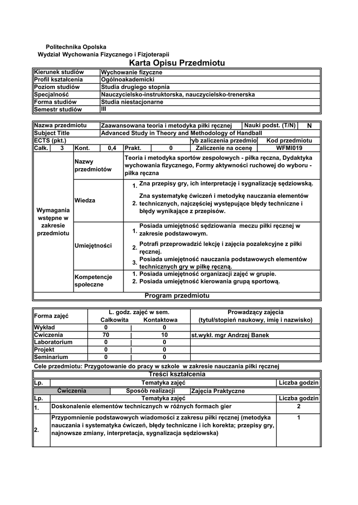 Politechnika Opolska Wydział Wychowania Fizycznego i Fizjoterapii Karta Opisu Przedmiotu Kierunek studiów Profil kształcenia Poziom studiów Specjalność Forma studiów Semestr studiów Wychowanie fizyczne Ogólnoakademicki Studia drugiego stopnia Nauczycielsko-instruktorska, nauczycielsko-trenerska Studia niestacjonarne III Nazwa przedmiotu Subject Title ECTS (pkt.) Całk. 3 Kont. Nauki podst. (T/N) Zaawansowana teoria i metodyka piłki ręcznej N Advanced Study in Theory and Methodology of Handball Tryb zaliczenia przedmiotu Kod przedmiotu 0,4 Prakt. 0 Zaliczenie na ocenę WFMI019 Nazwy przedmiotów Teoria i metodyka sportów zespołowych - piłka ręczna, Dydaktyka wychowania fizycznego, Formy aktywności ruchowej do wyboru piłka ręczna 1. Zna przepisy gry, ich interpretację i sygnalizację sędziowską. Zna systematykę ćwiczeń i metodykę nauczania elementów 2. technicznych, najczęściej występujące błędy techniczne i błędy wynikające z przepisów. Wiedza Wymagania wstępne w zakresie przedmiotu Posiada umiejętność sędziowania meczu piłki ręcznej w 1. zakresie podstawowym. Umiejętności Kompetencje społeczne Potrafi przeprowadzić lekcję i zajęcia pozalekcyjne z piłki ręcznej. Posiada umiejętność nauczania podstawowych elementów 3. technicznych gry w piłkę ręczną. 1. Posiada umiejętność organizacji zajęć w grupie. 2. Posiada umiejętność kierowania grupą sportową. 2. Program przedmiotu Forma zajęć Wykład Ćwiczenia Laboratorium Projekt Seminarium L. godz. zajęć w sem. Całkowita Kontaktowa 0 0 | 70 10 | 0 0 | 0 0 | 0 0 | Prowadzący zajęcia (tytuł/stopień naukowy, imię i nazwisko) st.wykł. mgr Andrzej Banek Cele przedmiotu: Przygotowanie do pracy w szkole w zakresie nauczania piłki ręcznej Treści kształcenia 1. Tematyka zajęć Sposób realizacji Zajęcia Praktyczne Tematyka zajęć Doskonalenie elementów technicznych w różnych formach gier 2. Przypomnienie podstawowych wiadomości z zakresu piłki ręcznej (metodyka nauczania i systematyka ćwiczeń, błędy techniczne i ich korekta; przepisy gry, najnowsze zmiany, interpretacja, sygnalizacja sędziowska) Lp. Liczba godzin Ćwiczenia Lp. Liczba godzin 2 1 3. Gra właściwa. Organizacja zawodów sportowych. Sędziowanie 2 Taktyka zespołowa - taktyka ataku: rodzaje ataku,metodyka i systematyka ćwiczeń doskonalenia ataku szybkiego, ataky pozycyjnegoi stałych zagrań taktycznych 2 4. 1 5. Taktyka zespołowa - taktyka obrony: rodzaje obrony,metodyka i systematyka ćwiczeń doskonalenia obrony każdy swego , i obron strefowych / 6:0, 5+1, 3:2;1/ Pozycje w grze: uwagi ogólne, metodyka i systematyka ćwiczeń do nauczania gry skrzydłowego, obrotowegoi rozgrywającego. Prowadzenie zajęć doskonalących grę na różnych pozycjach z przygotowanych konspektów. 2 6. L. godz. pracy własnej studenta Sposoby sprawdzenia Wiedza 60 L. godz. kontaktowych w 10 Prowadzenie przygotowanych ćwiczeń, sprawdzian K_W13 Zna zasady organizacji imprez sportowych i 1. najnowsze zmiany w przepisach gry i ich interpretację. K_W15 Zna podstawowe zasady taktycznego 2. postępowania w ataku i obronie ich rodzaje. 3. K_U15 Potrafi zastosować podstawowe zasady 1. taktyki zespołowej w różnych formach gier. Efekty kształcenia dla przedmiotu - po Umiejętności zakończonym cyklu kształcenia Kompetencje społeczne K_U16 Potrafi doskonalić elementy techniczne w 2. różnych formach gier. K_U14 Posiada umiejętność sędziowania meczu 3. piłki ręcznej, potrafi rozwijać zainteresowania ruchowe. K_U05 Potrafi promować aktywne formy spędzania 4. czasu wolnego. 5. K_U17 Potrafi samodzielnie formułować cele K_K07 Potrafi przekazać nabytą wiedzę uczestnikom 1. zajęć K_K01 Potrafi zmotywować zespół do aktywnego 2. uczestnictwa w zajęciach sportowych 3. K_K02 Ma umiejętność selekcjonowania opinii i informacji Metody dydaktyczne: Dyskusja w ramach ćwiczeń. Metoda zajęć praktycznych . Obserwacja meczu piłki ręcznej. Konsultacje. Forma i warunki zaliczenia przedmiotu: Zaliczenie na ocenę pozytywną sprawdzianu umiejętności praktycznych i kolokwium pismenego. Zaliczenie sędziowania. Przedstawienie konspektu zajęć. Literatura podstawowa: [1] Breguła T. : Piłka ręczna lata doświadczeń. COS Warszawa ( 1996) [2] Naglak Z.: Zespołowa gra sportowa. AWF Wrocław (1996) [3] Jans W.: Atlas ćwiczeń techniczno-taktycznych. RCMS KFiS Warszawa (1992 ) [4] Paterka S.: Piłka ręczna część I i II. AWF Poznań (1997) [5] Stawiarski W.: Piłka ręczna część IiII. Wydawnictwo skryptowe nr 81 AWF Kraków (1998) [6] Żarek J. Stawiarski W.: Piłka ręczna 7 osobowa. Sport i Turystyka Warszawa (1978 ) [7] Przepisy gry w piłkę ręczną 7 osobową. ZPRP 2010 [8] Literatura uzupełniająca: [1] Bondarowicz M.: Zabawy w grach sportowych. WSiP Warszawa (1998) [2] Grage W.: Trening piłki ręcznej / Handballtraining/ Meyer&Meyer Verlag Germany (1998) [3] Nowiński W.: Rola trenera w nowoczesnej koncepcji gry w piłkę ręczną. COS Warszawa (2000) [4] Zielonka Z.: Mini piłka ręczna. Agencja Promo- Lider Warszawa (1994 ) [5] [6] [7] ______________ * niewłaściwe przekreślić ………………………………………………….. ………………………………………………………. (kierownik jednostki organizacyjnej/bezpośredni przełożony: (Dziekan Wydziału pieczęć/podpis pieczęć/podpis)