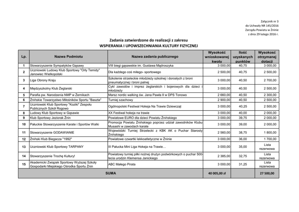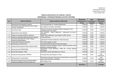 Załącznik nr 3 do Uchwały NR 145/2016 Zarządu Powiatu w Żninie z dnia 29 lutego 2016 r. Zadania zatwierdzone do realizacji z zakresu WSPIERANIA I UPOWSZECHNIANIA KULTURY FIZYCZNEJ Lp. 1 2 Nazwa Podmiotu Stowarzyszenie Sympatyków Gąsawy Uczniowski Ludowy Klub Sportowy "Orły Temidy" Janowiec Wielkopolski Nazwa zadania publicznego Wysokość wnioskowanej kwoty Ilość uzyskanych punktów Wysokosć otrzymanej dotacji VIII biegi gąsawskie im. Gustawa Mądroszyka 3 000,00 40,75 3 000,00 Dla każdego coś miłego- sportowego 2 500,00 40,75 2 500,00 3 000,00 40,50 2 700,00 3 000,00 40,50 2 500,00 Szkolenie strzeleckie młodzieży szkolnej i dorosłych z broni pneumatycznej i broni palnej Cykl zawodów i imprez żeglarskich i bojerowych dla dzieci i młodzieży Marsz nordic walking św. Jana Pawła II w DPS Tonowo 3 Liga Obrony Kraju 4 Międzyszkolny Klub Żeglarski 5 Parafia pw. Narodzenia NMP w Żernikach 2 660,00 40,50 2 300,00 6 Turniej szachowy 2 900,00 40,50 2 500,00 Ogólnopolski Festiwal Hokeja Na Trawie Dziewcząt 3 000,00 40,25 2 500,00 8 Żnińskie Towarzystwo Miłośników Sportu "Baszta" Uczniowski Klub Sportowy "Koziki" Zespołu Publicznych Szkół Rogowo Ludowy Klub Sportowy w Gąsawie XX Festiwal hokeja na trawie 3 000,00 40,00 2 000,00 9 Klub Sportowy Jeziorak Żnin 3 000,00 39,75 2 000,00 10 Pałuckie Stowarzyszenie Karate i Sportów Walki 3 000,00 39,00 2 000,00 11 Stowarzyszenie GODAWIANIE 2 560,00 38,75 1 800,00 12 Żniński Klub Biegacza "1992" Powiatowe EURO dla dzieci Powiatu Żnińskiego Promocja Powiatu Żnińskiego poprzez udział zawodników Klubu Musashi w zawodach karate Wojewódzki Turniej Strzelecki z KBK AK o Puchar Starosty Żnińskiego Powiatowe czwartki lekkoatletyczne w Żninie 3 000,00 36,00 1 700,00 13 Uczniowski Klub Sportowy TARPANY III Pałucka Mini Liga Hokeja na Trawie… 3 000,00 35,00 14 Stowarzyszenie Trochę Kultury! Powiatowy turniej piłki nożnej drużyn podwórkowych o puchar 500lecia urodzin Klemensa Janickiego 2 385,00 32,75 15 Akademicki Związek Sportowy Wyższej Szkoły Gospodarki Miejskiego Ośrodka Sportu Żnin ABC Małego Pirata 3 000,00 31,25 7 SUMA 40 005,00 zł Lista rezerwowa Lista rezerwowa Lista rezerwowa 27 500,00