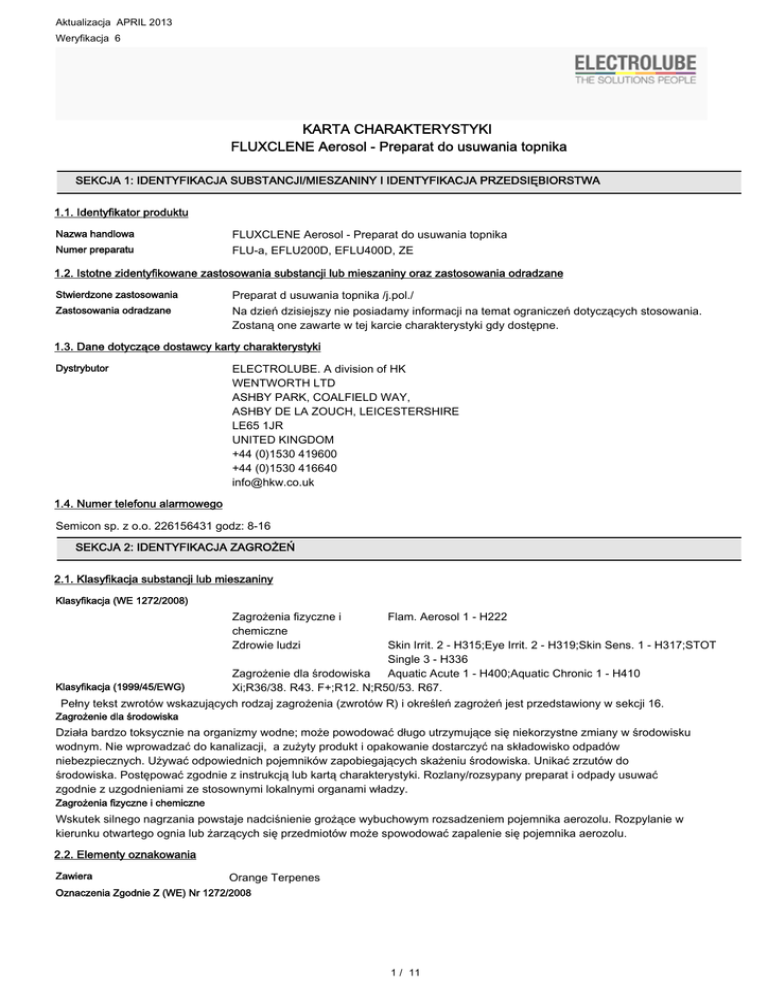 Aktualizacja APRIL 2013 Weryfikacja 6 KARTA CHARAKTERYSTYKI FLUXCLENE Aerosol - Preparat do usuwania topnika SEKCJA 1: IDENTYFIKACJA SUBSTANCJI/MIESZANINY I IDENTYFIKACJA PRZEDSIĘBIORSTWA 1.1. Identyfikator produktu Nazwa handlowa Numer preparatu FLUXCLENE Aerosol - Preparat do usuwania topnika FLU-a, EFLU200D, EFLU400D, ZE 1.2. Istotne zidentyfikowane zastosowania substancji lub mieszaniny oraz zastosowania odradzane Stwierdzone zastosowania Zastosowania odradzane Preparat d usuwania topnika /j.pol./ Na dzień dzisiejszy nie posiadamy informacji na temat ograniczeń dotyczących stosowania. Zostaną one zawarte w tej karcie charakterystyki gdy dostępne. 1.3. Dane dotyczące dostawcy karty charakterystyki Dystrybutor ELECTROLUBE. A division of HK WENTWORTH LTD ASHBY PARK, COALFIELD WAY, ASHBY DE LA ZOUCH, LEICESTERSHIRE LE65 1JR UNITED KINGDOM +44 (0)1530 419600 +44 (0)1530 416640 [email protected] 1.4. Numer telefonu alarmowego Semicon sp. z o.o. 226156431 godz: 8-16 SEKCJA 2: IDENTYFIKACJA ZAGROŻEŃ 2.1. Klasyfikacja substancji lub mieszaniny Klasyfikacja (WE 1272/2008) Zagrożenia fizyczne i chemiczne Zdrowie ludzi Flam. Aerosol 1 - H222 Skin Irrit. 2 - H315;Eye Irrit. 2 - H319;Skin Sens. 1 - H317;STOT Single 3 - H336 Zagrożenie dla środowiska Aquatic Acute 1 - H400;Aquatic Chronic 1 - H410 Klasyfikacja (1999/45/EWG) Xi;R36/38. R43. F+;R12. N;R50/53. R67. Pełny tekst zwrotów wskazujących rodzaj zagrożenia (zwrotów R) i określeń zagrożeń jest przedstawiony w sekcji 16. Zagrożenie dla środowiska Działa bardzo toksycznie na organizmy wodne; może powodować długo utrzymujące się niekorzystne zmiany w środowisku wodnym. Nie wprowadzać do kanalizacji, a zużyty produkt i opakowanie dostarczyć na składowisko odpadów niebezpiecznych. Używać odpowiednich pojemników zapobiegających skażeniu środowiska. Unikać zrzutów do środowiska. Postępować zgodnie z instrukcją lub kartą charakterystyki. Rozlany/rozsypany preparat i odpady usuwać zgodnie z uzgodnieniami ze stosownymi lokalnymi organami władzy. Zagrożenia fizyczne i chemiczne Wskutek silnego nagrzania powstaje nadciśnienie grożące wybuchowym rozsadzeniem pojemnika aerozolu. Rozpylanie w kierunku otwartego ognia lub żarzących się przedmiotów może spowodować zapalenie się pojemnika aerozolu. 2.2. Elementy oznakowania Zawiera Orange Terpenes Oznaczenia Zgodnie Z (WE) Nr 1272/2008 1 / 11 FLUXCLENE Aerosol - Preparat do usuwania topnika Hasło ostrzegawcze Niebezpieczeństwo Zwroty wskazujące rodzaj zagrożenia H222 H315 H317 H319 H336 H410 Skrajnie łatwopalny aerozol. Działa drażniąco na skórę. Może powodować reakcję alergiczną skóry. Działa drażniąco na oczy. Może wywoływać uczucie senności lub zawroty głowy. Działa bardzo toksycznie na organizmy wodne, powodując długotrwałe skutki. P210 Przechowywać z dala od źródeł ciepła/iskrzenia/otwar tego ognia/gorących powierzchni. Palenie wzbronione. Nie rozpylać nad otwartym ogniem lub innym źródłem zapłonu. Pojemnik pod ciśnieniem. Nie przekłuwać ani nie spalać, nawet po zużyciu. Stosować rękawice ochronne, ochronę oczu i twarzy. W PRZYPADKU DOSTANIA SIĘ DO OCZU: Ostrożnie płukać wodą przez kilka minut. Wyjąć soczewki kontaktowe, jeżeli są i można je łatwo usunąć. Nadal płukać. Zasięgnąć porady/zgłosić się pod opiekę lekarza. Zwroty wskazujące środki ostrożności P211 P251 P280 P305+351+338 P313 Dodatkowe zwroty wskazujące środki ostrożności P261 P410+412 P501 Unikać wdychania par/rozpylonej cieczy. Chronić przed światłem słonecznym. Nie wystawiać na działanie temperatury przekraczającej 50 °C/122 °F. Zawartość/pojemnik usuwać do … 2.3. Inne zagrożenia Nieklasyfikowany jako PBT / vPvB na podstawie obecnych kryteriów UE. SEKCJA 3: SKŁAD/INFORMACJA O SKŁADNIKACH 3.2. Mieszaniny CYKLOHEKSAN Numer CAS: 110-82-7 30-60% Numer WE: 203-806-2 Klasyfikacja (WE 1272/2008) Flam. Liq. 2 - H225 Skin Irrit. 2 - H315 STOT Single 3 - H336 Asp. Tox. 1 - H304 Aquatic Acute 1 - H400 Aquatic Chronic 1 - H410 Klasyfikacja (67/548/EWG) F;R11 Xn;R65 Xi;R38 R67 N;R50/53 PROPAN-2-OL Numer CAS: 67-63-0 Klasyfikacja (WE 1272/2008) Flam. Liq. 2 - H225 Eye Irrit. 2 - H319 STOT Single 3 - H336 10-30% Numer WE: 200-661-7 Klasyfikacja (67/548/EWG) F;R11 Xi;R36 R67 2 / 11 FLUXCLENE Aerosol - Preparat do usuwania topnika 1-METOKSYPROPAN-2-OL Numer CAS: 107-98-2 10-30% Numer WE: 203-539-1 Klasyfikacja (WE 1272/2008) Flam. Liq. 3 - H226 STOT Single 3 - H336 Klasyfikacja (67/548/EWG) R10 R67 HEXANE MIXTURE OF ISOMERS (MAX 5% N-HEXANE (203-777-6)) Numer CAS: - Numer WE: - Klasyfikacja (WE 1272/2008) Flam. Liq. 2 - H225 Skin Irrit. 2 - H315 STOT Single 3 - H336 Asp. Tox. 1 - H304 Aquatic Chronic 2 - H411 Klasyfikacja (67/548/EWG) F;R11 Xn;R65 Xi;R38 R67 N;R51/53 Orange Terpenes Numer CAS: 8028-48-6 1-5% Numer WE: 232-433-8 Klasyfikacja (WE 1272/2008) Flam. Liq. 3 - H226 Skin Irrit. 2 - H315 Skin Sens. 1 - H317 Asp. Tox. 1 - H304 Aquatic Acute 1 - H400 Aquatic Chronic 1 - H410 Klasyfikacja (67/548/EWG) Xn;R65. Xi;R38. N;R50/53. R10,R43. HEPTAN I JEGO IZOMERY Numer CAS: 142-82-5 1-5% Numer WE: 205-563-8 Klasyfikacja (WE 1272/2008) Flam. Liq. 2 - H225 Skin Irrit. 2 - H315 STOT Single 3 - H336 Asp. Tox. 1 - H304 Aquatic Acute 1 - H400 Aquatic Chronic 1 - H410 Klasyfikacja (67/548/EWG) F;R11 Xn;R65 Xi;R38 R67 N;R50/53 HEKSAN (IZOMER O PROSTYM ŁAŃCUCHU WĘGLOWYM TZW. N-HEKSAN) Numer CAS: 110-54-3 Klasyfikacja (WE 1272/2008) Flam. Liq. 2 - H225 Skin Irrit. 2 - H315 Repr. 2 - H361f STOT Single 3 - H336 STOT Rep. 2 - H373 Asp. Tox. 1 - H304 Aquatic Chronic 2 - H411 5-10% Numer WE: 203-777-6 Klasyfikacja (67/548/EWG) F;R11 Repr. Cat. 3;R62 Xn;R48/20,R65 Xi;R38 R67 N;R51/53 Pełny tekst zwrotów wskazujących rodzaj zagrożenia (zwrotów R) i określeń zagrożeń jest przedstawiony w sekcji 16. 3 / 11 < 1% FLUXCLENE Aerosol - Preparat do usuwania topnika Uwagi względem składu Składniki nie wymienione są za