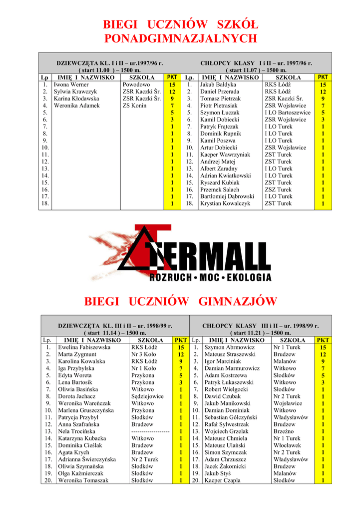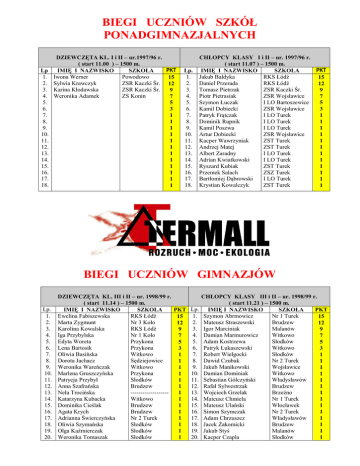 BIEGI UCZNIÓW SZKÓŁ PONADGIMNAZJALNYCH DZIEWCZĘTA KL. I i II – ur.1997/96 r. ( start 11.00 ) – 1500 m. PKT Lp IMIĘ I NAZWISKO SZKOŁA 1. Iwona Werner Powodowo 15 2. Sylwia Krawczyk ZSR Kaczki Śr. 12 3. Karina Kłodawska ZSR Kaczki Śr. 9 4. Weronika Adamek ZS Konin 7 5. 5 6. 3 7. 1 8. 1 9. 1 10. 1 11. 1 12. 1 13. 1 14. 1 15. 1 16. 1 17. 1 18. 1 Lp. 1. 2. 3. 4. 5. 6. 7. 8. 9. 10. 11. 12. 13. 14. 15. 16. 17. 18. CHŁOPCY KLASY I i II – ur. 1997/96 r. ( start 11.07 ) – 1500 m. PKT IMIĘ I NAZWISKO SZKOŁA Jakub Bałdyka RKS Łódź 15 Daniel Przerada RKS Łódź 12 Tomasz Pietrzak ZSR Kaczki Śr. 9 Piotr Pietrasiak ZSR Wojsławice 7 Szymon Łuczak I LO Bartoszewice 5 Kamil Dobiecki ZSR Wojsławice 3 Patryk Frątczak I LO Turek 1 Dominik Rupnik I LO Turek 1 Kamil Poszwa I LO Turek 1 Artur Dobiecki ZSR Wojsławice 1 Kacper Wawrzyniak ZST Turek 1 Andrzej Matej ZST Turek 1 Albert Zaradny I LO Turek 1 Adrian Kwiatkowski I LO Turek 1 Ryszard Kubiak ZST Turek 1 Przemek Salach ZSZ Turek 1 Bartłomiej Dąbrowski I LO Turek 1 Krystian Kowalczyk ZST Turek 1 BIEGI UCZNIÓW GIMNAZJÓW Lp. 1. 2. 3. 4. 5. 6. 7. 8. 9. 10. 11. 12. 13. 14. 15. 16. 17. 18. 19. 20. DZIEWCZĘTA KL. III i II – ur. 1998/99 r. CHŁOPCY KLASY III i II – ur. 1998/99 r. ( start 11.14 ) – 1500 m. ( start 11.21 ) – 1500 m. IMIĘ I NAZWISKO SZKOŁA PKT Lp. IMIĘ I NAZWISKO SZKOŁA PKT Ewelina Fabiszewska RKS Łódź 1. Szymon Abrmowicz Nr 1 Turek 15 15 Marta Zygmunt Nr 3 Koło 2. Mateusz Straszewski Brudzew 12 12 Karolina Kowalska RKS Łódź 3. Igor Marciniak Malanów 9 9 Iga Przybylska Nr 1 Koło 4. Damian Marmurowicz Witkowo 7 7 Edyta Woreta Przykona 5. Adam Kostrzewa Słodków 5 5 Lena Bartosik Przykona 6. Patryk Łukaszewski Witkowo 3 3 Oliwia Basińska Witkowo 7. Robert Wielgocki Słodków 1 1 Dorota Jachacz Sędziejowice 8. Dawid Czubak Nr 2 Turek 1 1 Weronika Wareńczak Witkowo 9. Jakub Manikowski Wojsławice 1 1 Marlena Gruszczyńska Przykona 10. Damian Dominiak Witkowo 1 1 Patrycja Przybył Słodków 11. Sebastian Gólczyński Władysławów 1 1 Anna Szafrańska Brudzew 12. Rafał Sylwestrzak Brudzew 1 1 Nela Trocińska ------------------13. Wojciech Grzelak Brzeźno 1 1 Katarzyna Kubacka Witkowo 14. Mateusz Chmiela Nr 1 Turek 1 1 Dominika Cieślak Brudzew 15. Mateusz Ulański Włocławek 1 1 Agata Krych Brudzew 16. Simon Szymczak Nr 2 Turek 1 1 Adrianna Świerczyńska Nr 2 Turek 17. Adam Chrzuszcz Władysławów 1 1 Oliwia Szymańska Słodków 18. Jacek Żakomicki Brudzew 1 1 Olga Kaźmierczak Słodków 19. Jakub Styś Malanów 1 1 Weronika Tomaszak Słodków 20. Kacper Czapla Słodków 1 1 21. 22. 23. 24. 25. 26. 27. 28. 29. 30. 31. 32. 33. 34. 35. 36. 37. 38. 39. 40. 41. 42. 43. 44. 45. 46. 47. 48. 49. 50. 51. 52. Estera Wędzik Nikola Świerczewska Weronika Dunol Ada Jachimowska Weronika Filipiak Patrycja Dzieciątkowska Kamila Filipiak Wiktoria Tomaszak Karolina Świerczyńska Weronika Paciorek Martyna Sobierajska Nikola Górska Izabela Klimek Eliza Jancy Adrianna Piekarska Daria Pilarczyk Weronika Gibasiewicz Klaudia Nowak Weronika Marczyńska Paulina Urbaniak Marta Derucka Marta Karbowska Monika Stefańska Martyna Bartczak Ola Szczęsnowska Magdalena Waź Angelika Gajor Daria Rosicka Alicja Widełka Agata Głodna Iwona Cieślak Nikola Paczkowska Słodków Słodków Brudzew Nr 1 Turek Słodków Nr 2 Turek Słodków Słodków Słodków Nr 2 Turek Nr 1 Turek Nr 1 Turek Brudzew Nr 1 Turek Nr 1 Turek Nr 2 Turek Słodków Słodków Nr 2 Turek Nr 2 Turek Nr 2 Turek Nr 1 Turek Nr 1 Turek Nr 2 Turek Nr 1 Turek Słodków Słodków Nr 2 Turek Nr 2 Turek Nr 2 Turek Nr 1 Turek Nr 1 Turek 1 1 1 1 1 1 1 1 1 1 1 1 1 1 1 1 1 1 1 1 1 1 1 1 1 1 1 1 1 1 1 1 21. 22. 23. 24. 25. 26. 27. 28. 29. 30. 31. 32. 33. 34. 35. 36. 37. 38. 39. 40. 41. 42. 43. 44. 45. 46. 47. 48. 49. 50. 51. 52. 53. 54. 55. 56. 57. 58. 59. 60. 61. 62. 63. 64. 65. 66. 67. 68. 69. 70. 71. 72. 73. 74. 75. 76. 77. 78. 79. 80. 81. 82. 83. 84. 85. 86. Adam Kostrzewski Mateusz Szmagaj Kamil Kubicki Mateusz Kamiński Patryk Jagieła Bartosz Kuśmirek Matusz Gromada Adrian Pawłowski Krzysztof Sawicki Jakub Sadowski Adrian Malesza Tomasz Krysztoforski Dominik Włodarczyk Bartosz Kostrzewa Michał Nowak Dominik Karbowski Artur Michalak Dawid Morek Marcin Werbliński Artur Miczyński Norbert Kałużny Dawid Gruchot Joachim Cieciura Kacper Patrzykont Patryk Rosiak Konrad Miazio Gabreiel Białczak Łukasz Frątczak Piotr Pióro Bartosz Świerk Jakub Gracz Dawid Wietrzych Patryk Górny Oskar Janczak Jarosław Kałużny Patryk Adamek Filip Ignasiak Bartosz Śmigieł Bartosz Drzewiecki Michał Wągiel Adrian Szczepaniak Hubert Jacaszek Robert Łukasz Bartosz Pyrkowski Przemek Buda Dominik Wszędybył Bartłomiej Janaśkiewicz Szymon Musiałowski Eryk Serafiński Mateusz Górski Krystian Kawczyński Mateusz Spychała Dawid Kurzawiński Łukasz Kaźmierczak Adrian Najmrocki Przemek Buda Hubert Adamczyk Eryk Banasiak Michał Gębalski Filip Kozłowski Kacper Maciszczyk Patryk Haładyn Bartosz Grzelak Bartosz Słobodzian Artur Banasiak Szymon Smura Słodków Władysławów Aleksandrów Ł Słodków Przykona Brudzew Przykona Słodków Słodków Słodków Słodków Słodków Słodków Słodków Nr 2 Turek Słodków Słodków Nr 2 Turek Nr 9 Kalisz Witkowo Słodków Słodków Nr 2 Turek Nr 1 Turek Słodków Władysławów Nr 1 Turek Słodków Słodków Nr 2 Turek Słodków Nr 2 Turek Witkowo Nr 1 Turek Nr 1 Turek Słodków Słodków Nr 2 Turek Nr 1 Turek Słodków Słodków Nr 1 Turek Nr 2 Turek Słodków Słodków Nr 2 Turek Nr 2 Turek Słodków Słodków Nr 2 Turek Nr 2 Turek Słodków Nr 2 Turek Słodków Nr 2 Turek Słodków Nr 1 Turek Nr 2 Turek Nr 1 Turek Nr 2 Turek Słodków Słodków Słodków Nr 2 Turek Nr 2 Turek Słodków 1 1 1 1 1 1 1 1 1 1 1 1 1 1 1 1 1 1 1 1 1 1 1 1 1 1 1 1 1 1 1 1 1 1 1 1 1 1 1 1 1 1 1 1 1 1 1 1 1 1 1 1 1 1 1 1 1 1 1 1 1 1 1 1 1 1 Lp. 1. 2. 3. 4. 5. 6. 7. 8. 9. 10. 11. 12. 13. 14. 15. 16. 17. 18. 19. 20. 21. 22. 23. 24. 25. 26. 27. 28. 29