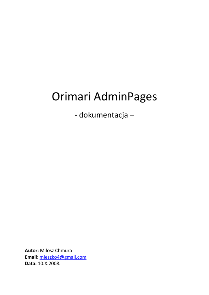 Orimari AdminPages - dokumentacja – Autor: Miłosz Chmura Email: [email protected] Data: 10.X.2008. Spis treści 1. Wstęp ............................................................................................................................................................................... 3 2. Organizacja katalogów strony........................................................................................................................................... 5 admin..................................................................................................................................................................................... 5 files ........................................................................................................................................................................................ 5 pl oraz en ............................................................................................................................................................................... 6 movies ................................................................................................................................................................................... 6 photos ................................................................................................................................................................................... 6 presentations ........................................................................................................................................................................ 6 uploads .................................................................................................................................................................................. 6 .htaccess, index.bck oraz index.php ...................................................................................................................................... 6 sitemap.xml i robots.txt ........................................................................................................................................................ 6 3. Organizacja bazy danych................................................................................................................................................... 7 usersadmin ............................................................................................................................................................................ 7 languages............................................................................................................................................................................... 7 menus .................................................................................................................................................................................... 7 pagesetings ............................................................................................................................................................................ 7 questions ............................................................................................................................................................................... 8 pages ..................................................................................................................................................................................... 8 mainpages ............................................................................................................................................................................. 8 menupages ............................................................................................................................................................................ 8 submenupages ...................................................................................................................................................................... 8 4. AdminPages ...................................................................................................................................................................... 9 Logowanie ............................................................................................................................................................................. 9 Administracja strony „Zadaj pytanie” .................................................................................................................................. 10 Zarządzanie prezentacjami na serwerze.............................................................................................................................. 12 Zarządzanie galeriami na serwerze...................................................................................................................................... 13 Zarządzanie filmami na serwerze ........................................................................................................................................ 14 Zarządzanie pozostałymi plikami na serwerze .................................................................................................................... 15 Archiwizacja bazy danych .................................................................................................................................................... 15 Zarządzanie ustawieniami strony ........................................................................................................................................ 15 Zarządzanie profilem użytkownika ...................................................................................................................................... 16 Zadawanie zapytań bazie danych ........................................................................................................................................ 16 Lista wszystkich plików na serwerze.....................................