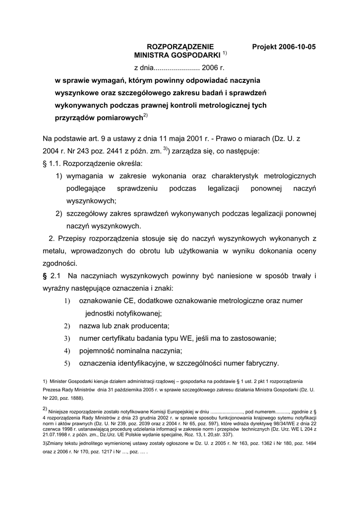 ROZPORZĄDZENIE MINISTRA GOSPODARKI 1) Projekt 2006-10-05 z dnia....................... 2006 r. w sprawie wymagań, którym powinny odpowiadać naczynia wyszynkowe oraz szczegółowego zakresu badań i sprawdzeń wykonywanych podczas prawnej kontroli metrologicznej tych przyrządów pomiarowych2) Na podstawie art. 9 a ustawy z dnia 11 maja 2001 r. - Prawo o miarach (Dz. U. z 2004 r. Nr 243 poz. 2441 z późn. zm. 3)) zarządza się, co następuje: § 1.1. Rozporządzenie określa: 1) wymagania w zakresie wykonania oraz charakterystyk metrologicznych podlegające sprawdzeniu podczas legalizacji ponownej naczyń wyszynkowych; 2) szczegółowy zakres sprawdzeń wykonywanych podczas legalizacji ponownej naczyń wyszynkowych. 2. Przepisy rozporządzenia stosuje się do naczyń wyszynkowych wykonanych z metalu, wprowadzonych do obrotu lub uŜytkowania w wyniku dokonania oceny zgodności. § 2.1 Na naczyniach wyszynkowych powinny być naniesione w sposób trwały i wyraźny następujące oznaczenia i znaki: 1) oznakowanie CE, dodatkowe oznakowanie metrologiczne oraz numer jednostki notyfikowanej; 2) nazwa lub znak producenta; 3) numer certyfikatu badania typu WE, jeśli ma to zastosowanie; 4) pojemność nominalna naczynia; 5) oznaczenia identyfikacyjne, w szczególności numer fabryczny. 1) Minister Gospodarki kieruje działem administracji rządowej – gospodarka na podstawie § 1 ust. 2 pkt 1 rozporządzenia Prezesa Rady Ministrów dnia 31 października 2005 r. w sprawie szczegółowego zakresu działania Ministra Gospodarki (Dz. U. Nr 220, poz. 1888). 2) Niniejsze rozporządzenie zostało notyfikowane Komisji Europejskiej w dniu ........................, pod numerem.........., zgodnie z § 4 rozporządzenia Rady Ministrów z dnia 23 grudnia 2002 r. w sprawie sposobu funkcjonowania krajowego sytemu notyfikacji norm i aktów prawnych (Dz. U. Nr 239, poz. 2039 oraz z 2004 r. Nr 65, poz. 597), które wdraŜa dyrektywę 98/34/WE z dnia 22 czerwca 1998 r. ustanawiającą procedurę udzielania informacji w zakresie norm i przepisów technicznych (Dz. Urz. WE L 204 z 21.07.1998 r. z późn. zm., Dz.Urz. UE Polskie wydanie specjalne, Roz. 13, t. 20,str. 337). 3)Zmiany tekstu jednolitego wymienionej ustawy zostały ogłoszone w Dz. U. z 2005 r. Nr 163, poz. 1362 i Nr 180, poz. 1494 oraz z 2006 r. Nr 170, poz. 1217 i Nr …, poz. … . 2. Na naczyniach wyszynkowych mogą być umieszczone oznaczenia maksymalnie trzech objętości, w taki sposób, aby były wyraźnie widoczne i nie powodowały moŜliwości pomylenia ich z innym oznaczeniem. 3. Wszystkie znaki napełnienia powinny być wystarczająco wyraźne i trwałe tak, aby zapewnić, Ŝe w uŜytkowaniu błędy graniczne dopuszczalne (MPE) nie będą przekroczone. § 3. Ustala się następujące warunki odniesienia dla naczyń wyszynkowych: 1) temperatura odniesienia: 20 ºC; 2) w pozycji poprawnego wskazania naczynie wyszynkowe powinno swobodnie stać na poziomej powierzchni. § 4. Błędy graniczne dopuszczalne (MPE) naczyń wyszynkowych podczas legalizacji ponownej nie powinny przekraczać wartości określonych w tabeli: Naczynie z kresą Naczynie krawędziowe Naczynia przenoszone < 100 ml ± 2 ml ≥ 100 ml ±3% 0 + 4 ml 0 +6% Naczynia wyszynkowe do bezpośredniego podawania cieczy do konsumpcji < 200 ml ±5% ≥ 200 ml ± (5 ml + 2,5 %) 0 + 10 % 0 + 10 ml + 5 % § 5. Podczas legalizacji ponownej naczyń wyszynkowych naleŜy sprawdzić czy: 1) na naczyniach tych naniesione są oznaczenia i znaki, o których mowa w § 2; 2) w przypadku naczyń wyszynkowych, z których ciecz przelewana jest do innych naczyń bezpośrednio przed konsumpcją: a) przy zmianie napełnienia równej błędowi granicznemu dopuszczalnemu (MPE) zapewniona jest zmiana poziomu o co najmniej 2 mm od krawędzi lub od znaku napełnienia, b) nie ma utrudnień podczas wylewania mierzonej cieczy; 3) w warunkach odniesienia błędy wskazań nie przekraczają wartości błędów granicznych dopuszczalnych naczyń wyszynkowych. § 6. Rozporządzenie wchodzi w Ŝycie po upływie 14 dni od dnia ogłoszenia. MINISTER GOSPODARKI