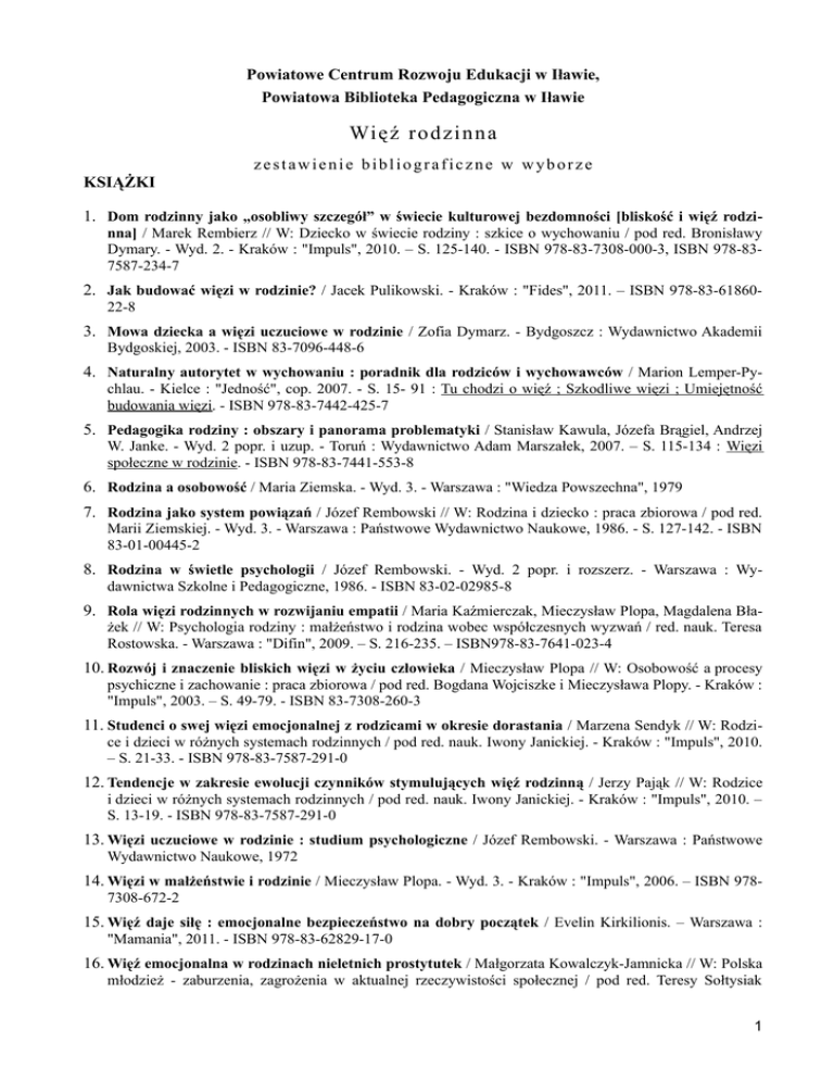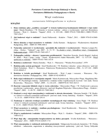 Powiatowe Centrum Rozwoju Edukacji w Iławie, Powiatowa Biblioteka Pedagogiczna w Iławie Wię ź r odzi nna zestawienie bibliograficzne w wyborze KSIĄŻKI 1. Dom rodzinny jako „osobliwy szczegół” w świecie kulturowej bezdomności [bliskość i więź rodzi nna] / Marek Rembierz // W: Dziecko w świecie rodziny : szkice o wychowaniu / pod red. Bronisławy Dymary. - Wyd. 2. - Kraków : "Impuls", 2010. – S. 125-140. - ISBN 978-83-7308-000-3, ISBN 978-837587-234-7 2. Jak budować więzi w rodzinie? / Jacek Pulikowski. - Kraków : "Fides", 2011. – ISBN 978-83-6186022-8 3. Mowa dziecka a więzi uczuciowe w rodzinie / Zofia Dymarz. - Bydgoszcz : Wydawnictwo Akademii Bydgoskiej, 2003. - ISBN 83-7096-448-6 4. Naturalny autorytet w wychowaniu : poradnik dla rodziców i wychowawców / Marion Lemper-Py chlau. - Kielce : "Jedność", cop. 2007. - S. 15- 91 : Tu chodzi o więź ; Szkodliwe więzi ; Umiejętność budowania więzi. - ISBN 978-83-7442-425-7 5. Pedagogika rodziny : obszary i panorama problematyki / Stanisław Kawula, Józefa Brągiel, Andrzej W. Janke. - Wyd. 2 popr. i uzup. - Toruń : Wydawnictwo Adam Marszałek, 2007. – S. 115-134 : Więzi społeczne w rodzinie. - ISBN 978-83-7441-553-8 6. Rodzina a osobowość / Maria Ziemska. - Wyd. 3. - Warszawa : "Wiedza Powszechna", 1979 7. Rodzina jako system powiązań / Józef Rembowski // W: Rodzina i dziecko : praca zbiorowa / pod red. Marii Ziemskiej. - Wyd. 3. - Warszawa : Państwowe Wydawnictwo Naukowe, 1986. - S. 127-142. - ISBN 83-01-00445-2 8. Rodzina w świetle psychologii / Józef Rembowski. - Wyd. 2 popr. i rozszerz. - Warszawa : Wy dawnictwa Szkolne i Pedagogiczne, 1986. - ISBN 83-02-02985-8 9. Rola więzi rodzinnych w rozwijaniu empatii / Maria Kaźmierczak, Mieczysław Plopa, Magdalena Bła żek // W: Psychologia rodziny : małżeństwo i rodzina wobec współczesnych wyzwań / red. nauk. Teresa Rostowska. - Warszawa : "Difin", 2009. – S. 216-235. – ISBN978-83-7641-023-4 10. Rozwój i znaczenie bliskich więzi w życiu człowieka / Mieczysław Plopa // W: Osobowość a procesy psychiczne i zachowanie : praca zbiorowa / pod red. Bogdana Wojciszke i Mieczysława Plopy. - Kraków : "Impuls", 2003. – S. 49-79. - ISBN 83-7308-260-3 11. Studenci o swej więzi emocjonalnej z rodzicami w okresie dorastania / Marzena Sendyk // W: Rodzi ce i dzieci w różnych systemach rodzinnych / pod red. nauk. Iwony Janickiej. - Kraków : "Impuls", 2010. – S. 21-33. - ISBN 978-83-7587-291-0 12. Tendencje w zakresie ewolucji czynników stymulujących więź rodzinną / Jerzy Pająk // W: Rodzice i dzieci w różnych systemach rodzinnych / pod red. nauk. Iwony Janickiej. - Kraków : "Impuls", 2010. – S. 13-19. - ISBN 978-83-7587-291-0 13. Więzi uczuciowe w rodzinie : studium psychologiczne / Józef Rembowski. - Warszawa : Państwowe Wydawnictwo Naukowe, 1972 14. Więzi w małżeństwie i rodzinie / Mieczysław Plopa. - Wyd. 3. - Kraków : "Impuls", 2006. – ISBN 9787308-672-2 15. Więź daje siłę : emocjonalne bezpieczeństwo na dobry początek / Evelin Kirkilionis. – Warszawa : "Mamania", 2011. - ISBN 978-83-62829-17-0 16. Więź emocjonalna w rodzinach nieletnich prostytutek / Małgorzata Kowalczyk-Jamnicka // W: Polska młodzież - zaburzenia, zagrożenia w aktualnej rzeczywistości społecznej / pod red. Teresy Sołtysiak 1 i Małgorzaty Karwowskiej. - Bydgoszcz : Wydawnictwo Akademii Bydgoskiej, 2001.- S. 435-450. ISBN 83-7096-394-3 17. Więź rodzinna / Magdalena Remisz-Skrojna // W: Encyklopedia pedagogiczna XXI wieku. T. 7 / red. na uk. Tadeusz Pilch. – Warszawa : „Żak”, 2008. – S. 117-122. - ISBN 978-83-89501-96-7 18. Więź rodzinna w aspekcie pedagogiki specjalnej / Natalia Han-Ilgiewicz. - Warszawa : Państwowe Wydawnictwo Naukowe, 1966 19. Więź rodzinna w świetle wypowiedzi młodzieży / Helena Izdebska. - Warszawa : Państwowe Zakłady Wydawnictw Szkolnych, 1973 20. Znaczenie więzi i atmosfery rodzinnej dla funkcjonowania rodziny / Anna Błasiak // W: Wybrane za gadnienia pedagogiki rodziny / praca zbiorowa pod red. Anny Błasiak i Ewy Dybowskiej. - Kraków : "WAM" : "Ignatianum", 2010. – S. 129-142. - ISBN 978-83-7614-085-8, ISBN 978-83-7505-672-3 ARTYKUŁY Z CZASOPISM 1. 2. 3. 4. 5. 6. 7. 8. 9. 10. 11. 12. 13. 14. 15. 16. 17. 18. 19. 20. 21. Dojrzałe więzi rodzinne / Marian Łakomski. – Bibliogr. // Wychowawca. - 2012, nr 7/8, s. 24-25 Jakie więzi takie życie / Barbara Józefik, Maciej Pilecki // Charaktery. - 2007, nr 11, s. 16-19 Jakość przywiązania : okres niemowlęctwa / Magdalena Stawicka. – Bibliogr. // Remedium. - 2005, nr 3, s. 4-6 Mamo, tato - tu jestem! [zaburzone więzi rodzinne] / Agnieszka Widera-Wysoczańska // Psychologia w Szkole. - 2008, nr 4, s. 91–98 Miłość a poczucie więzi w rodzinie : przeobrażenia więzi rodzinnej w świecie postindustrialnym / Tomasz Szlendak. – Bibliogr. // Kultura i Edukacja. – 1996, nr 2, s. 79-91 Nieprawidłowe więzi rodzinne - przyczyną eskalacji zachowań patologicznych dzieci i młodzieży / Elżbieta Łuczak, Bernadetta Stańko. – Bibliogr. // Wychowanie na co Dzień. - 2006, nr 3, s. 3–5 O chronieniu więzi rodzinnych, które są siłą niezwykłą / Kazimierz Pospiszyl // Małżeństwo i Ro dzina. - 2002, nr 2, s. 9-13 O przywiązaniu i więziach społecznych dziecka / Jadwiga Lubowiecka. – Bibliogr. // Wychowanie w przedszkolu. - 2006, nr 8, s. 5–13 Poczucie więzi emocjonalnej dorastających dzieci z rodzicami / Marzena Sendyk // Małżeństwo i Ro dzina. - 2005, nr 3, s. 34–38 Powstawanie i rozwój potrzeby więzi emocjonalnej / Andrzej Jaczewski // Kwartalnik Pedagogiczny. 2010, nr 2, s. 37-54 Praca na okrągło, dzieci na weekend / Barbara Smolińska ; rozm. Magda Brzezińska // Charaktery. 2009, nr 2, s. 36-39 Rodzino, dbaj o więzi / Karolina Radecka. – Bibliogr. // Przegląd Oświatowy. - 2008, nr 7, s. 13-14 Więzi emocjonalne w rodzinie a niedostosowanie społeczne nieletnich / Paulina Kamińska. –