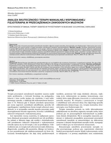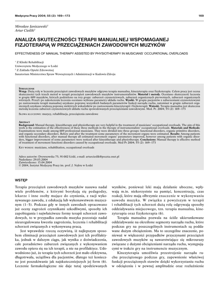 Medycyna Pracy 2004; 55 (2): 169 — 173 169 Mirosław Janiszewski1 Artur Cieślik2 ANALIZA SKUTECZNOŚCI TERAPII MANUALNEJ WSPOMAGANEJ FIZJOTERAPIĄ W PRZECIĄŻENIACH ZAWODOWYCH MUZYKÓW EFFECTIVENESS OF MANUAL THERAPY ASSISTED BY PHYSIOTHERAPY IN MUSICIANS’ OCCUPATIONAL OVERLOADS 1 Z Kliniki Rehabilitacji Uniwersytetu Medycznego w Łodzi 2 Z Zakładu Opieki Zdrowotnej Sanatorium Ministerstwa Spraw Wewnętrznych i Administracji w Kudowie-Zdroju STRESZCZENIE Wstęp. Dużą rolę w leczeniu przeciążeń zawodowych muzyków odgrywa terapia manualna, kinezyterapia oraz fizykoterapia. Celem pracy jest ocena skuteczności tych trzech metod w terapii przeciążeń zawodowych muzyków instrumentalistów. Materiał i metody. Oceniano skuteczność leczenia w grupie 689 muzyków, których podzielono na trzy grupy: zaburzeń czynnościowych, zaburzeń organicznych pierwotnych, zaburzeń organicznych wtórnych. Przed i po zakończeniu leczenia oceniano wybrane parametry układu ruchu. Wyniki. W grupie pacjentów z zaburzeniami czynnościowymi po zastosowaniu terapii manualnej uzyskano poprawę wszystkich badanych parametrów funkcji narządu ruchu, natomiast w grupie zaburzeń organicznych uzyskano większą poprawę niektórych wskaźników po zastosowaniu kinezyterapii i fizykoterapii. Wnioski. Terapia manualna jest skuteczna metodą leczenia zaburzeń czynnościowych układu ruchu spowodowanych przeciążeniami zawodowymi. Med. Pr. 2004; 55 (2): 169—173 Słowa kluczowe: muzycy, rehabilitacja, przeciążenia zawodowe ABSTRACT Background: Manual therapy, kinesitherapy and physiotherapy are very helpful in the treatment of musicians’ occupational overloads. The aim of this work is the estimation of the effectiveness of these three methods in the therapy of instrumentalists’ occupational overloads. Materials and Methods: Examinations were made among 689 professional musicians. They were divided into three groups: functional disorders, organic primitive disorders, and organic secondary disorders. Before and after the treatment some parameters of the movement organs were estimated. Results: Among patients with functional disorders, after manual therapy all estimated movement organs’ parameters improved, however among patients with organic disorders, bigger improvement of some parameters were noticed after kinesitherapy and physiotherapy. Conclusions: Manual therapy is effective method of treatment of movement functions disorders caused by occupational overloads. Med Pr 2004; 55 (2): 169—173 Key words: musicians, rehabilitation, occupational overloads Adres autorów: Drewnowska 75, 91-002 Łódź, e-mail: [email protected] Nadesłano: 29.03.2004 Zatwierdzono: 13.04.2004 © 2004, Instytut Medycyny Pracy im. prof. J. Nofera w Łodzi WSTĘP Terapia przeciążeń zawodowych muzyków nasuwa nadal wiele problemów, z którymi borykają się pedagodzy, lekarze i inne osoby mające do czynienia, z racji wykonywanego zawodu, z edukacją lub wykonawstwem muzycznym (1–5). Podczas gdy w innych zawodach opracowano już oceny zagrożeń czynnikami szkodliwymi, sposoby ich zapobiegania i najwłaściwsze formy terapii schorzeń zawodowych, to w przypadku zawodu muzyka pozostaje nadal nieuregulowana kwestia zagrożenia, leczenia i rehabilitacji schorzeń związanych z wykonywaną pracą. Jest wprawdzie rzeczą oczywistą, iż najlepszym sposobem eliminacji przeciążeń zawodowych jest ich profilaktyka, jednak w dalszym ciągu, jak wynika z doświadczenia, całe poradnictwo zaburzeń związanych z wykonywaniem zawodu opiera się na ich terapii, a nie na profilaktyce. Udowodniono już, że terapia tych schorzeń jest mało efektywna, długotrwała, uciążliwa dla pacjentów, dlatego też konieczne jest poszukiwanie jak najskuteczniejszych jej form (6). Leczenie farmakologiczne nie daje tutaj spodziewanych wyników, ponieważ leki mają działanie uboczne, wpływają m.in. niekorzystnie na pamięć, koncentrację, czas reakcji, które mają olbrzymie znaczenie w wykonywaniu uawodu muzyka. W związku z powyższym w terapii i rehabilitacji tych schorzeń dużą rolę odgrywają sposoby oddziaływania miejscowego, tzn. terapia manualna, kinezyterapia oraz fizykoterapia (6). Terapia manualna pozwala na ściśle ukierunkowane oddziaływanie na określone segmenty narządu ruchu, które podczas gry na poszczególnych instrumentach są poddawane dużym obciążeniom. Ma to szczególne znaczenie, ponieważ w większości przypadków przyczynami przeciążeń zawodowych muzyków są nawarstwiające się mikrourazy związane z dużymi obciążeniami narządu ruchu, występującymi w trakcie gry na instrumencie muzycznym. Kinezyterapia umożliwia przestrojenie narządu ruchu przeciążonego podczas gry, zapewnienie właściwej funkcji przeciążonych stawów dzięki wykorzystaniu ruchu w odciążeniu i w pewnej amplitudzie oraz rozluźnienie 170 M. Janiszewski, A. Cieślik przeciążonych grup mięśniowych poprzez stymulację ich antagonistów. Fizykoterapia jest czynnikiem uzupełniającym brak naturalnych bodźców fizycznych otaczających człowieka, a więc światła, ciepła i wody, a jednocześnie stwarza możliwości dodatkowej stymulacji funkcji organizmu, np. przez elektroterapię. Celem niniejszej pracy jest ocena skuteczności trzech wyżej wymienionych metod w terapii przeciążeń zawodowych muzyków instrumentalistów. MATERIAŁ I METODY Badania przeprowadzono wśród 689 muzyków, którzy zgłaszali się do Zakładu Ergonomii i Rehabilitacji Zawodowej Muzyków Akademii Muzycznej w Łodzi z dolegliwościami z zakresu narządu ruchu. Pacjenci rekrutowali się spośród uczniów ostatnich klas średnich szkół muzycznych, studentów Akademii Muzycznej oraz zawodowych muzyków z filharmonii, opery i operetki. Dolegliwości, jakie odczuwali badani, podzielono na trzy grupy: zaburzenia czynnościowe, w których występowały objawy subiektywne; w zaburzeniach tych nie stwierdzono tradycyjnych objawów kl
