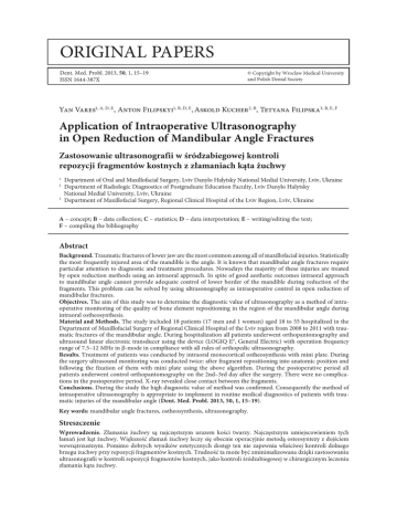 Original papers Dent. Med. Probl. 2013, 50, 1, 15–19 ISSN 1644-387X © Copyright by Wroclaw Medical University and Polish Dental Society Yan Vares1, A, D, E, Anton Filipskyi1, B, D, E, Askold Kucher2, B, Tetyana Filipska3, B, E, F Application of Intraoperative Ultrasonography in Open Reduction of Mandibular Angle Fractures Zastosowanie ultrasonografii w śródzabiegowej kontroli repozycji fragmentów kostnych z złamaniach kąta żuchwy Department of Oral and Maxillofacial Surgery, Lviv Danylo Halytsky National Medial University, Lviv, Ukraine Department of Radiologic Diagnostics of Postgraduate Education Faculty, Lviv Danylo Halytsky National Medial University, Lviv, Ukraine 3 Department of Maxillofacial Surgery, Regional Clinical Hospital of the Lviv Region, Lviv, Ukraine 1 2 A – concept; B – data collection; C – statistics; D – data interpretation; E – writing/editing the text; F – compiling the bibliography Abstract Background. Traumatic fractures of lower jaw are the most common among all of maxillofacial injuries. Statistically the most frequently injured area of the mandible is the angle. It is known that mandibular angle fractures require particular attention to diagnostic and treatment procedures. Nowadays the majority of these injuries are treated by open reduction methods using an intraoral approach. In spite of good aesthetic outcomes intraoral approach to mandibular angle cannot provide adequate control of lower border of the mandible during reduction of the fragments. This problem can be solved by using ultrasonography as intraoperative control in open reduction of mandibular fractures. Objectives. The aim of this study was to determine the diagnostic value of ultrasonography as a method of intraoperative monitoring of the quality of bone element repositioning in the region of the mandibular angle during intraoral ostheosynthesis. Material and Methods. The study included 18 patients (17 men and 1 woman) aged 18 to 55 hospitalized in the Department of Maxillofacial Surgery of Regional Clinical Hospital of the Lviv region from 2008 to 2011 with traumatic fractures of the mandibular angle. During hospitalization all patients underwent orthopantomography and ultrasound linear electronic transducer using the device (LOGIQ E®, General Electric) with operation frequency range of 7.5–12 MHz in b-mode in compliance with all rules of orthopedic ultrasonography. Results. Treatment of patients was conducted by intraoral monocortical ostheosynthesis with mini plate. During the surgery ultrasound monitoring was conducted twice: after fragment repositioning into anatomic position and following the fixation of them with mini plate using the above algorithm. During the postoperative period all patients underwent control orthopantomography on the 2nd–3rd day after the surgery. There were no complications in the postoperative period. X-ray revealed close contact between the fragments. Conclusions. During the study the high diagnostic value of method was confirmed. Consequently the method of intraoperative ultrasonography is appropriate to implement in routine medical diagnostics of patients with traumatic injuries of the mandibular angle (Dent. Med. Probl. 2013, 50, 1, 15–19). Key words: mandibular angle fractures, ostheosynthesis, ultrasonography. Streszczenie Wprowadzenie. Złamania żuchwy są najczęstszym urazem kości twarzy. Najczęstszym umiejscowieniem tych łamań jest kąt żuchwy. Większość złamań żuchwy leczy się obecnie operacyjnie metodą osteosyntezy z dojściem wewnątrzustnym. Pomimo dobrych wyników estetycznych dostęp ten nie zapewnia właściwej kontroli dolnego brzegu żuchwy przy repozycji fragmentów kostnych. Trudność ta może być zminimalizowana dzięki zastosowaniu ultrasonografii w kontroli repozycji fragmentów kostnych, jako kontroli śródzabiegowej w chirurgicznym leczeniu złamania kąta żuchwy. 16 Y. Vares et al. Cel pracy. Ocena wartości diagnostycznej ultrasonografii jako metody śródzabiegowej kontroli repozycji fragmentów kostnych podczas wewnątrzustnej osteosyntezy złamania kąta żuchwy. Materiał i metody. Do badań włączono 18 pacjentów (17 mężczyzn i 1 kobietę) w wieku od 18 do 55 lat, ze złamaniem kąta żuchwy, hospitalizowanych na Oddziale Chirurgii Szczękowo-Twarzowej Lwowskiego Regionalnego Klinicznego Szpitala we Lwowie w latach 2008–2011. W czasie hospitalizacji pacjenci byli badani pantomograficznie i ultrasonograficznie z użyciem transduktora elektronowego (LOGIQ E® General Electric) z głowicą o częstotliwości 7,5–12 MHz w projekcji b i uwzględnieniem wszystkich zasad ultrasonografii ortopedycznej. Wyniki. Leczenie chirurgiczne było przeprowadzone z wykorzystaniem wewnątrzustnej osteosyntezy złamania kąta żuchwy minipłytkami. W czasie zabiegu kontrola ultrasonograficzna była przeprowadzona dwukrotnie: po repozycji fragmentów do pozycji anatomicznej i po stabilizacji ich minipłytkami. W okresie pozabiegowym pacjenci byli badani pantomograficznie na 2.–3. dzień po zabiegu. Nie stwierdzono żadnych powikłań podczas kontroli pozabiegowej. Na zdjęciach pantomograficznych potwierdzono ścisły kontakt między zespolonymi obszarami kostnymi. Wnioski. Potwierdzono wysoką wartość diagnostyczną metody ultrasonografii w leczeniu złamań żuchwy. Dlatego można rekomendować to obrazowanie jako postępowanie standardowe w tym leczeniu (Dent. Med. Probl. 2013, 50, 1, 15–19). Słowa kluczowe: złamania kąta żuchwy, osteosynteza, ultrasonografia. A negative consequence of the rapid development of science and technology is a steady increase in domestic and industrial injuries. According to statistics [1–3] traumas of maxillofacial area, particularly the mandibular angle, certainly appear among the most frequent injuries. Taking it into consideration, angular fractures require special attention in terms of treatment and diagnosis. Today increasingly popular among doctors are w