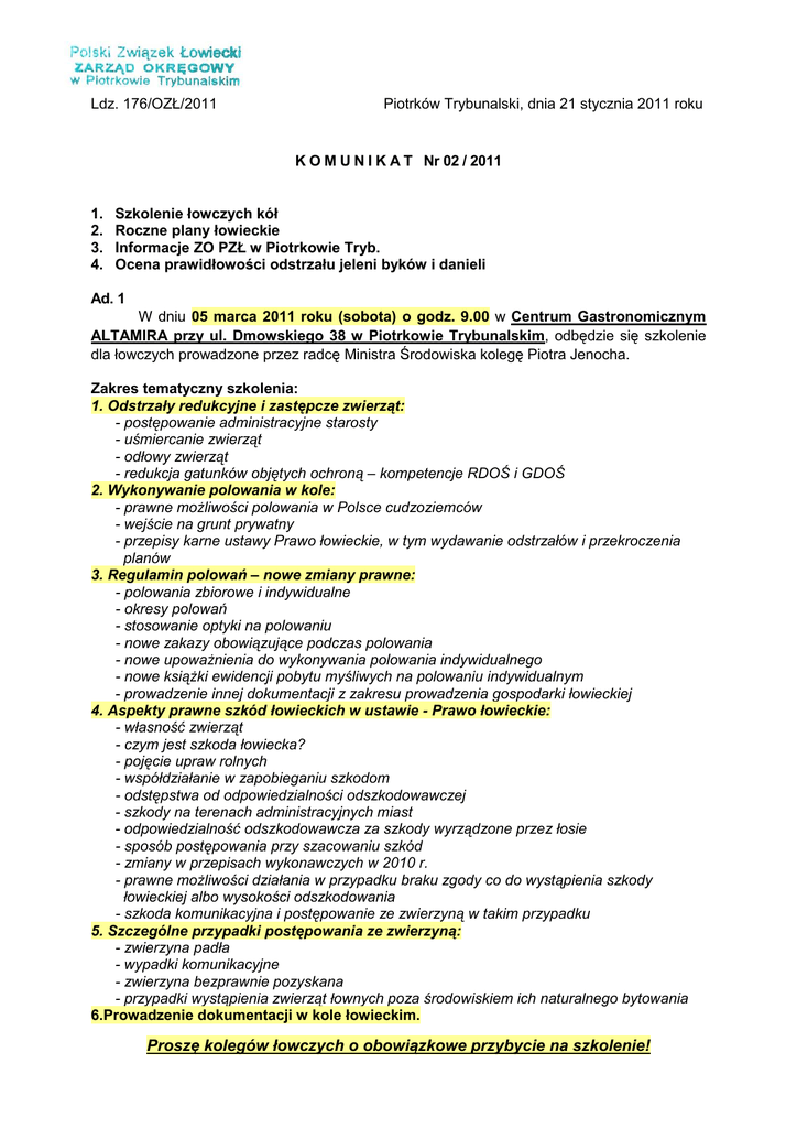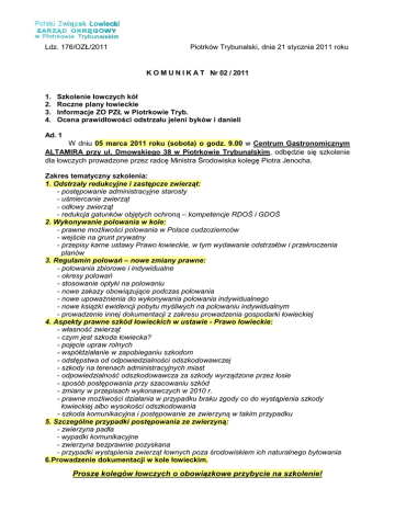 Ldz. 176/OZŁ/2011 Piotrków Trybunalski, dnia 21 stycznia 2011 roku K O M U N I K A T Nr 02 / 2011 1. 2. 3. 4. Szkolenie łowczych kół Roczne plany łowieckie Informacje ZO PZŁ w Piotrkowie Tryb. Ocena prawidłowości odstrzału jeleni byków i danieli Ad. 1 W dniu 05 marca 2011 roku (sobota) o godz. 9.00 w Centrum Gastronomicznym ALTAMIRA przy ul. Dmowskiego 38 w Piotrkowie Trybunalskim, odbędzie się szkolenie dla łowczych prowadzone przez radcę Ministra Środowiska kolegę Piotra Jenocha. Zakres tematyczny szkolenia: 1. Odstrzały redukcyjne i zastępcze zwierząt: - postępowanie administracyjne starosty - uśmiercanie zwierząt - odłowy zwierząt - redukcja gatunków objętych ochroną – kompetencje RDOŚ i GDOŚ 2. Wykonywanie polowania w kole: - prawne możliwości polowania w Polsce cudzoziemców - wejście na grunt prywatny - przepisy karne ustawy Prawo łowieckie, w tym wydawanie odstrzałów i przekroczenia planów 3. Regulamin polowań – nowe zmiany prawne: - polowania zbiorowe i indywidualne - okresy polowań - stosowanie optyki na polowaniu - nowe zakazy obowiązujące podczas polowania - nowe upoważnienia do wykonywania polowania indywidualnego - nowe książki ewidencji pobytu myśliwych na polowaniu indywidualnym - prowadzenie innej dokumentacji z zakresu prowadzenia gospodarki łowieckiej 4. Aspekty prawne szkód łowieckich w ustawie - Prawo łowieckie: - własność zwierząt - czym jest szkoda łowiecka? - pojęcie upraw rolnych - współdziałanie w zapobieganiu szkodom - odstępstwa od odpowiedzialności odszkodowawczej - szkody na terenach administracyjnych miast - odpowiedzialność odszkodowawcza za szkody wyrządzone przez łosie - sposób postępowania przy szacowaniu szkód - zmiany w przepisach wykonawczych w 2010 r. - prawne możliwości działania w przypadku braku zgody co do wystąpienia szkody łowieckiej albo wysokości odszkodowania - szkoda komunikacyjna i postępowanie ze zwierzyną w takim przypadku 5. Szczególne przypadki postępowania ze zwierzyną: - zwierzyna padła - wypadki komunikacyjne - zwierzyna bezprawnie pozyskana - przypadki wystąpienia zwierząt łownych poza środowiskiem ich naturalnego bytowania 6.Prowadzenie dokumentacji w kole łowieckim. Proszę kolegów łowczych o obowiązkowe przybycie na szkolenie! 2 Ad. 2 Działając w porozumieniu z Komisją Hodowlaną Okręgowej Rady Łowieckiej w Piotrkowie Trybunalskim, Zarząd Okręgowy PZŁ opracował „Tryb uzgadniania projektów rocznych planów łowieckich”, który wraz z podstawowymi wskazówkami dotyczącymi planowania łowieckiego, powinien ułatwić pracę łowczych kół łowieckich. Dodatkowo wyznaczone terminy uzgadniania projektów planów pozwolą na wyeliminowanie pojawiających się błędów w tym dokumencie. Terminy uzgadniania planów oraz podstawowe wskaźniki dotyczące planowania łowieckiego zostały podane w załączniku do komunikatu. W załączeniu przesyłamy druk rocznego planu łowieckiego. Druk ten jest również dostępny na stronie internetowej PZŁ www.piotrkow.pzlow.pl. Prosimy o sporządzanie planu TYLKO na tych drukach Prosimy zarządy kół łowieckich o przedłożenie w terminie do 15 marca br. projektu rocznego planu łowieckiego w Zarządzie Okręgowym PZŁ. Projekt rocznego planu łowieckiego powinien być zaopiniowany przez wójta (burmistrza, prezydenta miasta). Zarząd Okręgowy po zaopiniowaniu, prześle plany do właściwych nadleśnictw. Ad. 3 SZKOLENIE SELEKCJONERÓW W dniu 12 marca 2011 roku Zarząd Okręgowy PZŁ w Piotrkowie Trybunalskim rozpoczyna szkolenie dla selekcjonerów zwierzyny płowej. W kursie mogą uczestniczyć myśliwi legitymujący się, co najmniej trzyletnim stażem w Polskim Związku Łowieckim. W dniu 12 marca br. od godziny 8.00 w sali szkoleniowej Zarządu Okręgowego PZŁ przy ul. Wierzejskiej 100 (strzelnica myśliwska) odbędzie się rejestrowanie uczestników kursu. Od godziny 9.00 do godziny 15.00 odbędą się pierwsze zajęcia szkoleniowe. W załączeniu przesyłamy program szkolenia. Prosimy zarządy kół łowieckich o przekazanie tej informacji członkom koła. Program szkolenia został również umieszczony na stronie internetowej www.piotrkow.pzlow.pl. SZKOLENIE NOWO WSTĘPUJĄCYCH W dniu 10 kwietnia 2011 roku o godzinie 8.00 rozpoczynamy szkolenie dla nowo wstępujących do Polskiego Związku Łowieckiego. W załączeniu przesyłamy program szkolenia. W dniu rozpoczęcia kursu uczestnicy powinny zarejestrować się w biurze ZO PZŁ w Piotrkowie Tryb. pomiędzy godz. 8.00 a 10.00. Kandydat powinien mieć przy sobie dowód osobisty oraz wypełniony dziennik stażysty. Treningi strzeleckie odbywają się w obecności opiekunów stażystów, którzy są odpowiedzialni za zabezpieczenie broni oraz amunicji. W załączeniu przesyłamy: 1) terminarz imprez strzeleckich organizowanych przez Zarząd Okręgowy PZŁ w Piotrkowie Trybunalskim, 2) terminarz konkursów kynologicznych organizowanych przez Zarząd Okręgowy PZŁ w Piotrkowie Trybunalskim, 3) terminarz szkolenia psów myśliwskich. Ad. 4 Zarząd Okręgowy PZŁ w Piotrkowie Tryb. informuje, że ocena prawidłowości odstrzału jeleni byków i danieli odbędzie się w dniu 26 marca 2011 roku (sobota) od godz. 9.00 do godz. 15.00 w siedzibie Zarządu Okręgowego PZŁ w Piotrkowie Trybunalskim, ul. Wierzejska 100. 3 Powołana komisja w składzie 1. Andrzej Sykurski – przedstawiciel PZŁ 2. Witold Szafraniec – przedstawiciel PZŁ 3. Wojciech Kociniak – przedstawiciel Lasów Państwowych będzie pracowała w sposób następujący: Od godz. 9.00 do godz. 11.00 dokona oceny prawidłowości odstrzału jeleni - byków pozyskanych przez koła łowieckie z powiatu piotrkowskiego i bełchatowskiego. Od godz. 11.00 do godz. 13.00 dokona oceny prawidłowości odstrzału jeleni - byków pozyskanych przez koła łowieckie z powiatu tomaszowskiego i opoczyńskiego. Od godz. 13.00 do godz. 15.00 dokona oceny prawidłowości odstrzału jeleni - byk