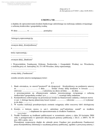 Wzór-umowy o dopłaty do oprocentowania kredytów bankowych udzielanych na realizację zadań związanych z ochroną środowiska i gospodarką wodną Załącznik nr 6 do Zarządzenia nr37/2010 z dnia 16.09.2010 r. UMOWA NR . . . . . . . . o dopłaty do oprocentowania kredytu bankowego udzielonego na realizację zadania związanego z ochroną środowiska i gospodarką wodną W dniu ................. w ………………. pomiędzy: ………………………………………………………………………………………………. ………………………………………………………………………………………………. którego/ą reprezentuje/ją: - ……………………………… - ……………………………… zwanym dalej „Kredytobiorcą” a …………………………………………………………………………………………….. …………………………………………………………………………………………….. który reprezentują : - ……………………….. - ……………………….. zwanym dalej „Bankiem” i Wojewódzkim Funduszem Ochrony Środowiska i Gospodarki Wodnej we Wrocławiu, z siedzibą przy ul. Jastrzębiej 24, 53-148 Wrocław, który reprezentują: - ……………………………. - ……………………………. zwany dalej „Funduszem” została zawarta umowa następującej treści: §1 1. Bank oświadcza, że stawia*/postawił* do dyspozycji Kredytobiorcy na podstawie umowy nr…………. …………….. z dnia……… kredyt zwany dalej kredytem w kwocie …….. (słownie: ......................................) udzielony na okres od dnia …… do dnia ……. z przeznaczeniem na sfinansowanie zadania inwestycyjnego związanego z ochroną środowiska*/gospodarką wodną* p.n. „…………..”, zwanego dalej zadaniem. 2. Kredytobiorca zobowiązuje się przeznaczyć kredyt na finansowanie zadania, o którym mowa w ust. 1, którego łączny planowany koszt wynosi ................... (słownie: ................) i wykonać je do dnia ............... . 3. W wyniku realizacji przedsięwzięcia zostanie osiągnięty efekt rzeczowy lub/i ekologiczny …………… 4. Kredyt, o którym mowa w ust.1, udzielany jest*/udzielony został* ze środków ............................ z dopłatami do oprocentowania ze środków Funduszu. /nazwa banku/ 5. Środki Funduszu są środkami publicznymi w rozumieniu ustawy z dnia 30 kwietnia 2004 roku o postępowaniu w sprawach dotyczących pomocy publicznej. ( Dz.U. z 2007r. Nr 59 poz. 404 z późn. zm.). Warunkiem rozpoczęcia dopłat do odsetek przez Fundusz jest przedłożenie Funduszowi przez Kredytobiorcę informacji o uzyskanej pomocy publicznej, zgodnie z powyższą ustawą.¹) Wzór-umowy o dopłaty do oprocentowania kredytów bankowych udzielanych na realizację zadań związanych z ochroną środowiska i gospodarką wodną 6. Podstawę udzielenia przez Fundusz dopłaty stanowi uchwała Zarządu*/Rady Nadzorczej* nr ……. z dnia …………. r. 7. Przebieg realizacji zadania określa harmonogram rzeczowo-finansowy, stanowiący załącznik nr 1 do niniejszej umowy. 8. Kredytobiorca zobowiązuje się do terminowej realizacji zadania, a po jego zakończeniu do przedstawienia protokołu przekazania do eksploatacji i dostarczenia rozliczenia finansowego całego zadania według wzoru obowiązującego w Funduszu, w terminie do dnia . . . . . . . . . . r. W rozliczeniu uwzględnia się podatek VAT tylko w sytuacji, jeżeli stanowi on koszt Kredytobiorcy. 9. Kredytobiorca upoważnia Fundusz do dokonywania u Kredytobiorcy kontroli w zakresie wykorzystania kredytu zgodnie z przeznaczeniem. §2 1. Kredyt jest oprocentowany ........................................................................................................ 2. Fundusz będzie realizował dopłaty do oprocentowania od wykorzystanego i terminowo spłacanego kredytu do kwoty ................, z zastrzeżeniem, że maksymalna wysokość dopłaty wynosi 5%*/3%* w skali roku, przy czym różnica pomiędzy oprocentowaniem kredytu, a dopłatą z Wojewódzkiego Funduszu nie może być niższa niż aktualnie obowiązujące oprocentowanie pożyczek w Funduszu (na dzień podpisania umowy oprocentowanie wynosi 3,5% w skali roku) 3. Dopłaty będą realizowane maksymalnie przez okres ....... lat/miesięcy, tj. od dnia ……… do czasu wykorzystania przyznanej wielkości dopłat. 4. Fundusz nie dopłaca do oprocentowania naliczanego od zadłużenia przeterminowanego. 5. Z tytułu dopłat do oprocentowania udzielonego kredytu Bank będzie (kwartalnie*/co miesiąc*) obciążał Fundusz notą księgową obejmującą kwotę dopłat za mijający (kwartał* /miesiąc*) rozliczeniowy. Fundusz akceptuje noty księgowe według wzoru Banku. 6. Dopłaty będą przekazywane przez Fundusz w terminie 7 dni od daty otrzymania noty na rachunek Banku nr ............. . . 7. Bank przekaże Funduszowi symulację spłaty kapitału i odsetek z wyliczoną wielkością dopłat Funduszu na dzień podpisania umowy. §3 1. 2. Zabezpieczeniem udzielonych Kredytobiorcy dopłat do oprocentowania kredytu jest/są: ........................................................ . W przypadku stwierdzenia przez Bank pogorszenia się sytuacji ekonomiczno-finansowej Kredytobiorcy, o czym Bank zobowiązany będzie niezwłocznie poinformować pisemnie Fundusz, Kredytobiorca zobowiązany będzie na pisemne żądanie Funduszu do ustanowienia na rzecz Funduszu dodatkowego zabezpieczenia udzielonych na podstawie niniejszej umowy dopłat do oprocentowania kredytu. §4 1. O stopniu realizacji inwestycji, w zakresie rzeczowo-finansowym, do czasu jej zakończenia i stanie wykorzystania kredytu Kredytobiorca będzie informował Fundusz w formie sprawozdań co 3 miesiące, począwszy od daty płatności pierwszej raty kapitałowej i odsetkowej określonej w umowie kredytowej. Sprawozdanie Kredytobiorca będzie przek