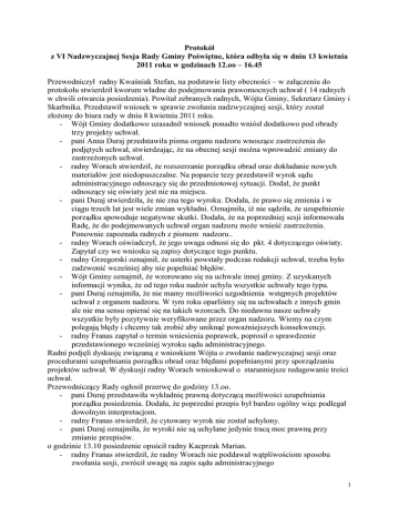 Protokół z VI Nadzwyczajnej Sesja Rady Gminy Poświętne, która odbyła się w dniu 13 kwietnia 2011 roku w godzinach 12.oo – 16.45 Przewodniczył radny Kwaśniak Stefan, na podstawie listy obecności – w załączeniu do protokołu stwierdził kworum władne do podejmowania prawomocnych uchwał ( 14 radnych w chwili otwarcia posiedzenia). Powitał zebranych radnych, Wójta Gminy, Sekretarz Gminy i Skarbnika. Przedstawił wniosek w sprawie zwołania nadzwyczajnej sesji, który został złożony do biura rady w dniu 8 kwietnia 2011 roku. - Wójt Gminy dodatkowo uzasadnił wniosek ponadto wniósł dodatkowo pod obrady trzy projekty uchwał. - pani Anna Duraj przedstawiła pisma organu nadzoru wnoszące zastrzeżenia do podjętych uchwał, stwierdzając, że na obecnej sesji można wprowadzić zmiany do zastrzeżonych uchwał. - radny Worach stwierdził, że rozszerzanie porządku obrad oraz dokładanie nowych materiałów jest niedopuszczalne. Na poparcie tezy przedstawił wyrok sądu administracyjnego odnoszący się do przedmiotowej sytuacji. Dodał, że punkt odnoszący się oświaty jest nie na miejscu. - pani Duraj stwierdziła, że nie zna tego wyroku. Dodała, że prawo się zmienia i w ciągu trzech lat jest wiele zmian wykładni. Oznajmiła, iż nie sądziła, że uzupełnienie porządku spowoduje negatywne skutki. Dodała, że na poprzedniej sesji informowała Radę, że do podejmowanych uchwał organ nadzoru może wnieść zastrzeżenia. Ponownie zapoznała radnych z pismem nadzoru.. - radny Worach oświadczył, że jego uwaga odnosi się do pkt. 4 dotyczącego oświaty. Zapytał czy we wniosku są zapisy dotyczące tego punktu. - radny Grzegorski oznajmił, że usterki powstały podczas redakcji uchwał, trzeba było zadzwonić wcześniej aby nie popełniać błędów. - Wójt Gminy oznajmił, że wzorowano się na uchwale innej gminy. Z uzyskanych informacji wynika, że od tego roku nadzór uchyla wszystkie uchwały tego typu. - pani Duraj oznajmiła, że nie mamy możliwości uzgodnienia wstępnych projektów uchwał z organem nadzoru. W tym roku oparliśmy się na uchwałach z innych gmin ale nie ma sensu opierać się na takich wzorcach. Do niedawna nasze uchwały wszystkie były pozytywnie weryfikowane przez organ nadzoru. Wiemy na czym polegają błędy i chcemy tak zrobić aby uniknąć poważniejszych konsekwencji. - radny Franas zapytał o termin wniesienia poprawek, poprosił o sprawdzenie przedstawionego wcześniej wyroku sądu administracyjnego. Radni podjęli dyskusję związaną z wnioskiem Wójta o zwołanie nadzwyczajnej sesji oraz procedurami uzupełniania porządku obrad oraz błędami popełnianymi przy sporządzaniu projektów uchwał. W dyskusji radny Worach wnioskował o staranniejsze redagowanie treści uchwał. Przewodniczący Rady ogłosił przerwę do godziny 13.oo. - pani Duraj przedstawiła wykładnię prawną dotyczącą możliwości uzupełniania porządku posiedzenia. Dodała, że poprzedni przepis był bardzo ogólny więc podlegał dowolnym interpretacjom. - radny Franas stwierdził, że cytowany wyrok nie został uchylony. - pani Duraj oznajmiła, że wyroki nie są uchylane jedynie tracą moc prawną przy zmianie przepisów. o godzinie 13.10 posiedzenie opuścił radny Kacprzak Marian. - radny Franas stwierdził, że radny Worach nie poddawał wątpliwościom sposobu zwołania sesji, zwrócił uwagę na zapis sądu administracyjnego 1 pani Duraj oznajmiła, że nie mogłaby pozwolić na to aby zostały podjęte uchwały, które ktoś mógłby podważyć, ze względu na złe zwołanie sesji. Dodała, że można rozszerzyć sesję na wniosek Wójta. Poprosiła o przegłosowanie porządku. Przewodniczący Rady zaproponował zamianę punktu 4 z pktem 5. Odczytał proponowany porządek posiedzenia z wniesioną zmianą. 1. Otwarcie obrad i stwierdzenie quorum. 2. Przyjęcie porządku obrad. 3. Przyjęcie protokołu z poprzedniej sesji. 4. Podjęcie uchwał a) w sprawie zmian w budżecie gminy na rok 2011 b) zmieniającej uchwałę Nr V/31/11 Rady Gminy Poświętne z dnia 25 marca 2011 roku w sprawie zatwierdzenia taryf dla zbiorowego zaopatrzenia w wodę i zbiorowego odprowadzania ścieków c) zmieniającej uchwałę Nr V/33/11 Rady Gminy Poświętne w sprawie dopłaty dla odbiorców wody i ścieków d) w sprawie ustalenia stawki dotacji przedmiotowej dla samorządowego zakładu budżetowego 5. Perspektywy realizacji zadań oświatowych przez obecnie istniejące placówki oświatowe w świetle kosztów funkcjonowania oświaty i ich wpływu na budżet gminy 6. Interpelacje radnych. 7. Zapytania i wolne wnioski. 8. Zamknięcie obrad. Za przyjęciem porządku obrad w przedstawionej przez Przewodniczącego wersji głosowało 14 radnych – jednogłośnie. Przewodniczący Rady oznajmił, że mija rocznica zbrodni katyńskiej i katastrofy smoleńskiej poprosił o uczczenie minutą ciszy. Ad. 3. Przyjęto jednogłośnie – 14 radnych brało udział w głosowaniu. Ad. 4 a. Projekt uchwały w sprawie zmian w budżecie gminy przedstawiła pani Kośka Skarbnik Gminy. - uwag nie było. Za przyjęciem uchwały w sprawie zmian w budżecie gminy na rok 2011 głosowało 14 radnych – jednogłośnie. Ad. 4. b) Projekt uchwały przedstawiła pani Anna Duraj Sekretarz Gminy. Dodatkowo zapoznała zebranych z zastrzeżeniami jakie wniósł organ nadzoru. - radny Worach zapytał o ścieki dowożone. - pani Duraj oznajmiła, że dopłaty pozostają, nie mogą być tylko umieszczone przy taryfach, zostaną podjęte inną uchwałą. Za przyjęciem uchwały zmieniającej uchwałę Nr V/31/11 Rady Gminy Poświętne z dnia 25 marca 2011 roku w sprawie zatwierdzenia taryf dla zbiorowego zaopatrzenia w wodę i zbiorowego odprowadzania ścieków głosowało 14 radnych – jednogłośnie. Ad. 4. c) Projekt uchwały przedstawiła pani Duraj Sekretarz Gminy. Odczytała pismo organu nadzoru w sprawie zastrzeżeń do uchwały. Dodała, że ustawa nie dopuszcza dopłat do tego 