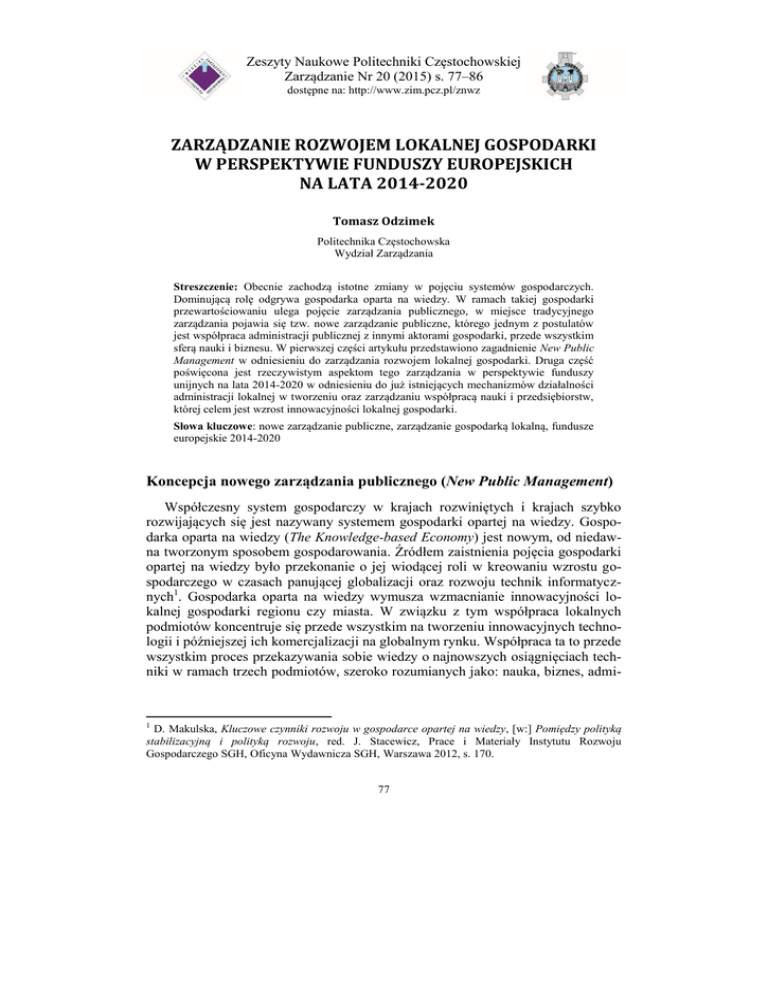 Zeszyty Naukowe Politechniki Częstochowskiej Zarządzanie rozwojem lokalnej gospodarki w perspektywie funduszy europejskich … Zarządzanie Nr 20 (2015) s. 77–86 dostępne na: http://www.zim.pcz.pl/znwz ZARZĄDZANIE ROZWOJEM LOKALNEJ GOSPODARKI W PERSPEKTYWIE FUNDUSZY EUROPEJSKICH NA LATA 2014-2020 Tomasz Odzimek Politechnika Częstochowska Wydział Zarządzania Streszczenie: Obecnie zachodzą istotne zmiany w pojęciu systemów gospodarczych. Dominującą rolę odgrywa gospodarka oparta na wiedzy. W ramach takiej gospodarki przewartościowaniu ulega pojęcie zarządzania publicznego, w miejsce tradycyjnego zarządzania pojawia się tzw. nowe zarządzanie publiczne, którego jednym z postulatów jest współpraca administracji publicznej z innymi aktorami gospodarki, przede wszystkim sferą nauki i biznesu. W pierwszej części artykułu przedstawiono zagadnienie New Public Management w odniesieniu do zarządzania rozwojem lokalnej gospodarki. Druga część poświęcona jest rzeczywistym aspektom tego zarządzania w perspektywie funduszy unijnych na lata 2014-2020 w odniesieniu do już istniejących mechanizmów działalności administracji lokalnej w tworzeniu oraz zarządzaniu współpracą nauki i przedsiębiorstw, której celem jest wzrost innowacyjności lokalnej gospodarki. Słowa kluczowe: nowe zarządzanie publiczne, zarządzanie gospodarką lokalną, fundusze europejskie 2014-2020 Koncepcja nowego zarządzania publicznego (New Public Management) Współczesny system gospodarczy w krajach rozwiniętych i krajach szybko rozwijających się jest nazywany systemem gospodarki opartej na wiedzy. Gospodarka oparta na wiedzy (The Knowledge-based Economy) jest nowym, od niedawna tworzonym sposobem gospodarowania. Źródłem zaistnienia pojęcia gospodarki opartej na wiedzy było przekonanie o jej wiodącej roli w kreowaniu wzrostu gospodarczego w czasach panującej globalizacji oraz rozwoju technik informatycznych1. Gospodarka oparta na wiedzy wymusza wzmacnianie innowacyjności lokalnej gospodarki regionu czy miasta. W związku z tym współpraca lokalnych podmiotów koncentruje się przede wszystkim na tworzeniu innowacyjnych technologii i późniejszej ich komercjalizacji na globalnym rynku. Współpraca ta to przede wszystkim proces przekazywania sobie wiedzy o najnowszych osiągnięciach techniki w ramach trzech podmiotów, szeroko rozumianych jako: nauka, biznes, admi- 1 D. Makulska, Kluczowe czynniki rozwoju w gospodarce opartej na wiedzy, [w:] Pomiędzy polityką stabilizacyjną i polityką rozwoju, red. J. Stacewicz, Prace i Materiały Instytutu Rozwoju Gospodarczego SGH, Oficyna Wydawnicza SGH, Warszawa 2012, s. 170. 77 Tomasz Odzimek nistracja, czyli w ramach tzw. „koncepcji złotego trójkąta innowacji”2. Koncepcja ta określa szeroki zakres rozważań teoretycznych i badań empirycznych z zakresu relacji między trzema aktorami, tj. sferą nauki, biznesu i administracji. Z punktu widzenia tworzenia nowych technologii i ich transferu, a następnie zarządzania transferem wydaje się, że najważniejsza jest współpraca przedsiębiorstw i naukowców, będąca ostatecznym ogniwem wzajemnych relacji na danym obszarze. Władza lokalna nie uczestniczy bezpośrednio w tworzeniu technologii, ale odgrywa bardzo ważną rolę w tworzeniu warunków do zarządzania transferem, a często również sama zarządza transferem technologii między nauką a biznesem. W rezultacie, dla sprawnej realizacji takiej polityki gospodarczej, wysiłki władzy publicznej wszystkich szczebli skierowane powinny być na organizację procesu powstawania innowacji i tworzenie struktury instytucjonalnej i organizacyjnej ułatwiającej ten proces. Punktem wyjścia jest wyraźne sprecyzowanie istoty zarządzania publicznego, czyli zapewnienie sprawnego, skutecznego i odpowiedzialnego społecznie osiągania celów organizacji przy wykorzystaniu efektu synergii. Biorąc pod uwagę zadania, jakie stoją przed współczesnym zarządzaniem publicznym, można je określić jako przemyślany i uporządkowany zestaw działań kierowniczych, polegających na ustalaniu celów i zadań organizacji, uzyskiwaniu i stosowaniu środków w sposób sprawny, skuteczny i społecznie odpowiedzialny, monitorowanie uzyskiwanych rezultatów, aby zapewnić im równowagę funkcjonalną i zgodność z potrzebami odbiorców w ramach wyznaczonych przez ograniczenia otoczenia, w których dana organizacja funkcjonuje3. Zarządzanie gospodarką opartą na wiedzy wymusza inne niż dotychczas zaangażowanie reprezentantów administracji publicznej. Administracja publiczna powinna skierować większy wysiłek na tworzenie gospodarczych powiązań sieciowych na obszarze oddziaływania lokalnej gospodarki. Zauważalną obecnie tendencją w zarządzaniu publicznym są coraz silniejsze związki między sektorem publicznym i prywatnym oraz znaczący wzrost udziału państwa w życiu społeczno-gospodarczym, a przede wszystkim konieczność sprostania wielu współczesnym wyzwaniom, jak efektywność ekonomiczna i sprawiedliwość społeczna. Wnioski płynące z analizy literatury tworzą obraz zarządzania publicznego, w wielu aspektach nie odbiegają daleko od logiki zarządzania w sektorze prywatnym. Z drugiej strony będące podmiotem zarządzania publicznego organizacje publiczne charakteryzują się własną specyfiką wynikającą z otoczenia, w jakim funkcjonują, odmiennością ról, struktur i procesów organizacyjnych, właściwych dla organizacji publicznych. To sprawia, że sektor publiczny ma jednak wiele różnych w stosunku do sektora prywatnego wyróżników decydujących o przebiegu procesu zarządzania. Należy wrócić do lat dziewięćdziesiątych XX wieku, kiedy nasiliła się presja na sektor publiczny, zorientowana na osiąganie efektów ekonomicznych i społecznych przy ograniczonym nastawieniu na nakłady. Orientacja ta uzyskała wspar2 M. Nowak, M. Mażewska, S. Mazurkiewicz, Współpraca ośrodków innowacji z a