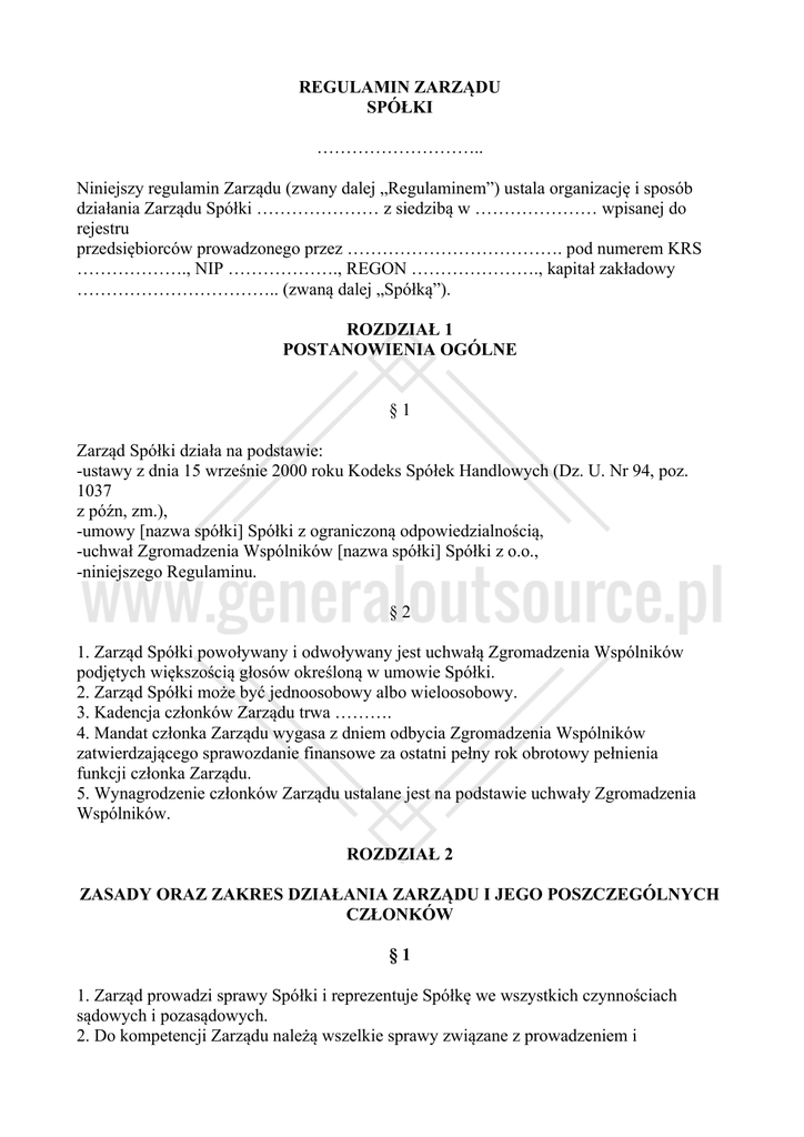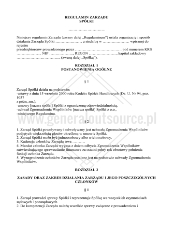 REGULAMIN ZARZĄDU SPÓŁKI ……………………….. Niniejszy regulamin Zarządu (zwany dalej „Regulaminem”) ustala organizację i sposób działania Zarządu Spółki ………………… z siedzibą w ………………… wpisanej do rejestru przedsiębiorców prowadzonego przez ………………………………. pod numerem KRS ………………., NIP ………………., REGON …………………., kapitał zakładowy …………………………….. (zwaną dalej „Spółką”). ROZDZIAŁ 1 POSTANOWIENIA OGÓLNE §1 Zarząd Spółki działa na podstawie: -ustawy z dnia 15 wrześnie 2000 roku Kodeks Spółek Handlowych (Dz. U. Nr 94, poz. 1037 z późn, zm.), -umowy [nazwa spółki] Spółki z ograniczoną odpowiedzialnością, -uchwał Zgromadzenia Wspólników [nazwa spółki] Spółki z o.o., -niniejszego Regulaminu. §2 1. Zarząd Spółki powoływany i odwoływany jest uchwałą Zgromadzenia Wspólników podjętych większością głosów określoną w umowie Spółki. 2. Zarząd Spółki może być jednoosobowy albo wieloosobowy. 3. Kadencja członków Zarządu trwa ………. 4. Mandat członka Zarządu wygasa z dniem odbycia Zgromadzenia Wspólników zatwierdzającego sprawozdanie finansowe za ostatni pełny rok obrotowy pełnienia funkcji członka Zarządu. 5. Wynagrodzenie członków Zarządu ustalane jest na podstawie uchwały Zgromadzenia Wspólników. ROZDZIAŁ 2 ZASADY ORAZ ZAKRES DZIAŁANIA ZARZĄDU I JEGO POSZCZEGÓLNYCH CZŁONKÓW §1 1. Zarząd prowadzi sprawy Spółki i reprezentuje Spółkę we wszystkich czynnościach sądowych i pozasądowych. 2. Do kompetencji Zarządu należą wszelkie sprawy związane z prowadzeniem i reprezentowaniem Spółki, niezastrzeżone do kompetencji Rady Nadzorczej i Zgromadzenia Wspólników. 3. Zgromadzenie Wspólników określi w drodze uchwały sprawy przekraczające zakres zwykłych czynności Spółki wymagające podjęcia uchwały Zarządu. §2 1. Do składania oświadczeń woli oraz podpisywania w imieniu Spółki w przypadku Zarządu jednoosobowego upoważniony jest członek Zarządu samodzielnie, w przypadku Zarządu wieloosobowego ………………………………………………... 2. Członkowie Zarządu wykonują swoje obowiązki osobiście. §3 1. Członkowie Zarządu wspólnie prowadzą sprawy Spółki. 2. Zarząd uprawniony jest w szczególności do: a. Podejmowania działań zastrzeżonych dla Zarządu na podstawie Kodeksu spółek handlowych, b. zarządzania majątkiem Spółki, c. zaciągania zobowiązań i zawierania umów z zastrzeżeniem przypadków, gdy wymagana jest zgoda Zgromadzenia Wspólników, d. ustanawiania i odwoływania prokury oraz udzielania i odwoływania pełnomocnictw, e. zatwierdzania regulaminów określających wewnętrzny porządek, organizację oraz prawa i obowiązki pracowników i pracodawcy, f. wprowadzenia regulaminu wynagradzania, g. wprowadzania regulaminów organizacyjnych poszczególnych jednostek/komórek organizacyjnych określające ich strukturę, zadania i kompetencje, h. składania i przyjmowania oświadczeń woli w imieniu Spółki, w szczególności w zakresie praw i obowiązków majątkowych Spółki., i. zwoływania zwyczajnych i nadzwyczajnych Zgromadzeń Wspólników, j. przygotowania corocznego sprawozdania z działalności Spółki, k. składania wniosków na Zgromadzeniu Wspólników w sprawie podziału zysku lub pokrycia straty, l. zawierania i rozwiązywania z pracownikami Spółki umów o pracę, ustalanie ich wynagrodzeń na zasadach określonych w regulaminie wynagradzania, m. występowania do innych organów spółki z wnioskami we wszystkich sprawach. 3. Zgromadzenie Wspólników określiło w drodze uchwały sprawy przekraczające zakres zwykłych czynności Spółki wymagające podjęcia uchwały Zarządu. 4. Do spraw przekraczających zakres zwykłych czynności należą między innymi sprawy dotyczące: a. stanowiska Zarządu wobec pozostałych władz Spółki, b. zwołania nadzwyczajnego Zgromadzenia Wspólników z inicjatywy Zarządu, c. wytoczenia powództwa o uchylenie uchwały wspólników lub o stwierdzenie nieważności uchwały wspólników, d. przedłożenia Zgromadzeniu Wspólników: i. rocznego sprawozdania działalności Zarządu i Spółki, ii. sprawozdania finansowego, e. ustanawiania prokury, f. ustanawiania i odwoływania pełnomocnictw, g. wynagradzania pracowników, h. przedłożenia Zgromadzeniu Wspólników wniosków dotyczących: i. zmian w kapitale zakładowym Spółki, ii. zmian umowy Spółki, połączenia, przekształcenia, jak i jej rozwiązania i likwidacji, i. wyrażenie zgody na rozporządzenie prawem lub zaciągnięcie zobowiązania do świadczenia, gdy zgoda taka nie musi zostać wyrażona przez Zgromadzenie Wspólników. j. wyrażenia zgody na umorzenie udziałów, k. wyrażenia zgody na zaciągnięcie kredytu lub pożyczki oraz udzielenie przez Spółkę pożyczki, gdy zgoda taka nie musi zostać wyrażona przez Zgromadzenie Wspólników, l. wyrażenia zgody na udział Spółki w czynnościach, których drugą stroną jest: i. podmiot, w którym Spółka posiada akcje lub udziały, ii. osoba lub osoby, których łączy z członkiem Zarządu stosunek pokrewieństwa lub powinowactwa, 5. Każdy członek Zarządu może skutecznie wnioskować o podjęcie uchwały w innych sprawach niż wymienione w ust. 4. W takim przypadku podjęcie uchwały przez Zarząd jest obligatoryjne. §4 1. Zarząd ponosi odpowiedzialność za prawidłowe, rzetelne i terminowe prowadzenie ksiąg rachunkowych oraz terminowe sporządzenie sprawozdań finansowych. 2. Zarząd zapewnia obsługę organizacyjno-administracyjną funkcjonowania pozostałych organów Spółki. 3. Zarząd składa do sądu rejestrowego wszelkie wymagane prawem wnioski i dokumenty oraz prowadzi księgę udziałów. §5 1. Pracami Zarządu kieruje Prezes Zarządu. 2. Prezes Zarządu przewodniczy posiedzeniom Zarządu. 3. W przypadku Zarządu wieloosobowego 