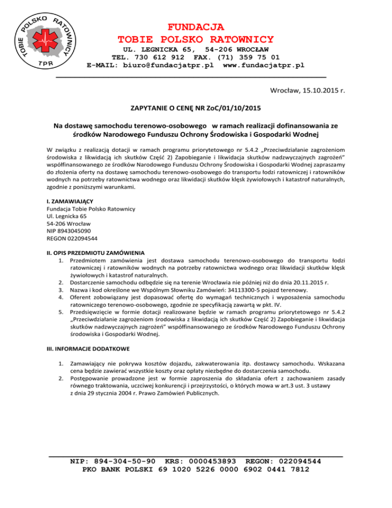 FUNDACJA TOBIE POLSKO RATOWNICY UL. LEGNICKA 65, 54-206 WROCŁAW TEL. 730 612 912 FAX. (71) 359 75 01 E-MAIL: [email protected] www.fundacjatpr.pl _________________________________________________________ Wrocław, 15.10.2015 r. ZAPYTANIE O CENĘ NR ZoC/01/10/2015 Na dostawę samochodu terenowo-osobowego w ramach realizacji dofinansowania ze środków Narodowego Funduszu Ochrony Środowiska i Gospodarki Wodnej W związku z realizacją dotacji w ramach programu priorytetowego nr 5.4.2 „Przeciwdziałanie zagrożeniom środowiska z likwidacją ich skutków Część 2) Zapobieganie i likwidacja skutków nadzwyczajnych zagrożeń” współfinansowanego ze środków Narodowego Funduszu Ochrony Środowiska i Gospodarki Wodnej zapraszamy do złożenia oferty na dostawę samochodu terenowo-osobowego do transportu łodzi ratowniczej i ratowników wodnych na potrzeby ratownictwa wodnego oraz likwidacji skutków klęsk żywiołowych i katastrof naturalnych, zgodnie z poniższymi warunkami. I. ZAMAWIAJĄCY Fundacja Tobie Polsko Ratownicy Ul. Legnicka 65 54-206 Wrocław NIP 8943045090 REGON 022094544 II. OPIS PRZEDMIOTU ZAMÓWIENIA 1. Przedmiotem zamówienia jest dostawa samochodu terenowo-osobowego do transportu łodzi ratowniczej i ratowników wodnych na potrzeby ratownictwa wodnego oraz likwidacji skutków klęsk żywiołowych i katastrof naturalnych. 2. Dostarczenie samochodu odbędzie się na terenie Wrocławia nie później niż do dnia 20.11.2015 r. 3. Nazwa i kod określone we Wspólnym Słowniku Zamówień: 34113300-5 pojazd terenowy. 4. Oferent zobowiązany jest dopasować ofertę do wymagań technicznych i wyposażenia samochodu ratowniczego terenowo-osobowego, zgodnie ze specyfikacją zawartą w pkt. IV. 5. Przedsięwzięcie w formie dotacji realizowane będzie w ramach programu priorytetowego nr 5.4.2 „Przeciwdziałanie zagrożeniom środowiska z likwidacją ich skutków Część 2) Zapobieganie i likwidacja skutków nadzwyczajnych zagrożeń” współfinansowanego ze środków Narodowego Funduszu Ochrony środowiska i Gospodarki Wodnej. III. INFORMACJE DODATKOWE 1. 2. Zamawiający nie pokrywa kosztów dojazdu, zakwaterowania itp. dostawcy samochodu. Wskazana cena będzie zawierać wszystkie koszty oraz opłaty niezbędne do dostarczenia samochodu. Postępowanie prowadzone jest w formie zaproszenia do składania ofert z zachowaniem zasady równego traktowania, uczciwej konkurencji i przejrzystości, o których mowa w art.3 ust. 3 ustawy z dnia 29 stycznia 2004 r. Prawo Zamówień Publicznych. ______________________________________________________________ NIP: 894-304-50-90 KRS: 0000453893 REGON: 022094544 PKO BANK POLSKI 69 1020 5226 0000 6902 0441 7812 FUNDACJA TOBIE POLSKO RATOWNICY UL. LEGNICKA 65, 54-206 WROCŁAW TEL. 730 612 912 FAX. (71) 359 75 01 E-MAIL: [email protected] www.fundacjatpr.pl _________________________________________________________ IV. SZCZEGÓŁOWY OPIS PRZEDMIOTU ZAMÓWIENIA Przedmiotem zamówienia jest dostawa 1 szt. samochodu terenowo-osobowego do transportu łodzi ratowniczej i ratowników wodnych na potrzeby ratownictwa wodnego oraz likwidacji skutków klęsk żywiołowych i katastrof naturalnych, zgodnie z poniższymi warunkami. Wymagania techniczne samochodu: 1. DANE OGÓLNE rok produkcji : od 2008 roku przebieg: max. 200 tyś km i poniżej stan karoserii: bezwypadkowe, oryginalny lakier bez dokonywanych napraw blacharsko-lakierniczych nadwozie zamknięte 5 – cio drzwiowe na ramie ilość miejsc siedzących – 7 głębokość brodzenia min 700mm kąt zejścia min 24 stopni kąt rampowy min 20 stopni kąt natarcia min 30 stopni dopuszczalna masa całkowita do 3500 kg pojemność zbiornika paliwa min.80 litrów 2. SILNIK rodzaj paliwa diesel moc min. 210 KW moment obrotowy min. 600 Nm 3. PRZENIESIENIE NAPĘDU nierozłączny układ napędowym 4 x 4 z LSD skrzynia biegów automatyczna możliwość blokady międzymostowego mechanizmu różnicowego 4. ZAWIESZENIE terenowe, inne niż pneumatyczne 5. UKŁAD KIEROWNICZY wspomaganie hydrauliczne promień skrętu nie mniej niż 6 m ______________________________________________________________ NIP: 894-304-50-90 KRS: 0000453893 REGON: 022094544 PKO BANK POLSKI 69 1020 5226 0000 6902 0441 7812 FUNDACJA TOBIE POLSKO RATOWNICY UL. LEGNICKA 65, 54-206 WROCŁAW TEL. 730 612 912 FAX. (71) 359 75 01 E-MAIL: [email protected] www.fundacjatpr.pl _________________________________________________________ 6. UKŁAD HAMULCOWY hamulce tarczowe wentylowane – przód i tył 7. WYPOSAŻENIE ZEWNĘTRZNE hak kulowy relingi dachowe wycieraczka tylnej szyby otwierana klapa tylna komplet opon drogowych na felgach aluminowych elektrycznie regulowane, składane i podgrzewane lusterka 8. WYPOSAŻENIE WEWNĘTRZNE autoalarm +immobiliser czterostrefowa klimatyzacja automatyczna tempomat czujnik deszczu skórzane siedzenia, kierownica i gałka zmiany biegów radio z CD+MP3 z kompletem głośników elektrycznie otwierany szyberdach kamera cofania kurtyny powietrzne system ochrony przedzderzeniowej 9. DOKUMENTACJA instrukcja obsługi samochodu w języku polskim aktualny przegląd techniczny karta pojazdu aktualne ubezpieczenie OC dowód rejestracyjny pojazdu udokumentowany przebieg pojazdu książka serwisowa pojazdu dwa komplety kluczyków pojazdu dokumentacja z przeglądu okresowego w autoryzowanej stacji obsługi wraz udokumentowaniem niezbędnych wymian podzespołów i części, przeprowadzonych w okresie max. 20 dni poprzedzających dostarczenie pojazdu 10. WYPOSAŻENIE OBOWIĄZKOWE Z PRZEZNACZENIEM DO DZIAŁAŃ RATOWNICZYCH (ZGODNIE Z WNIOSKIEM ORAZ UMOWĄ NA DOFINANSOWANIE) nowa wyciągarka montowana w zderzaku przednim o mocy 12000 LBS ze zdalnym sterowaniem z pilota ______________________________________________________________ NIP: 894-304-50-90 KRS: 0000453893 REGON: 022094544 PKO BANK POLSKI 69 1020 5226 0000 6902 0441 7812 FUNDACJA TOBIE POLSKO RATOWNICY UL. LEGNICKA 65, 54-206 WROCŁAW TEL. 730 612 912 FAX. (71) 359 75 01 E-M